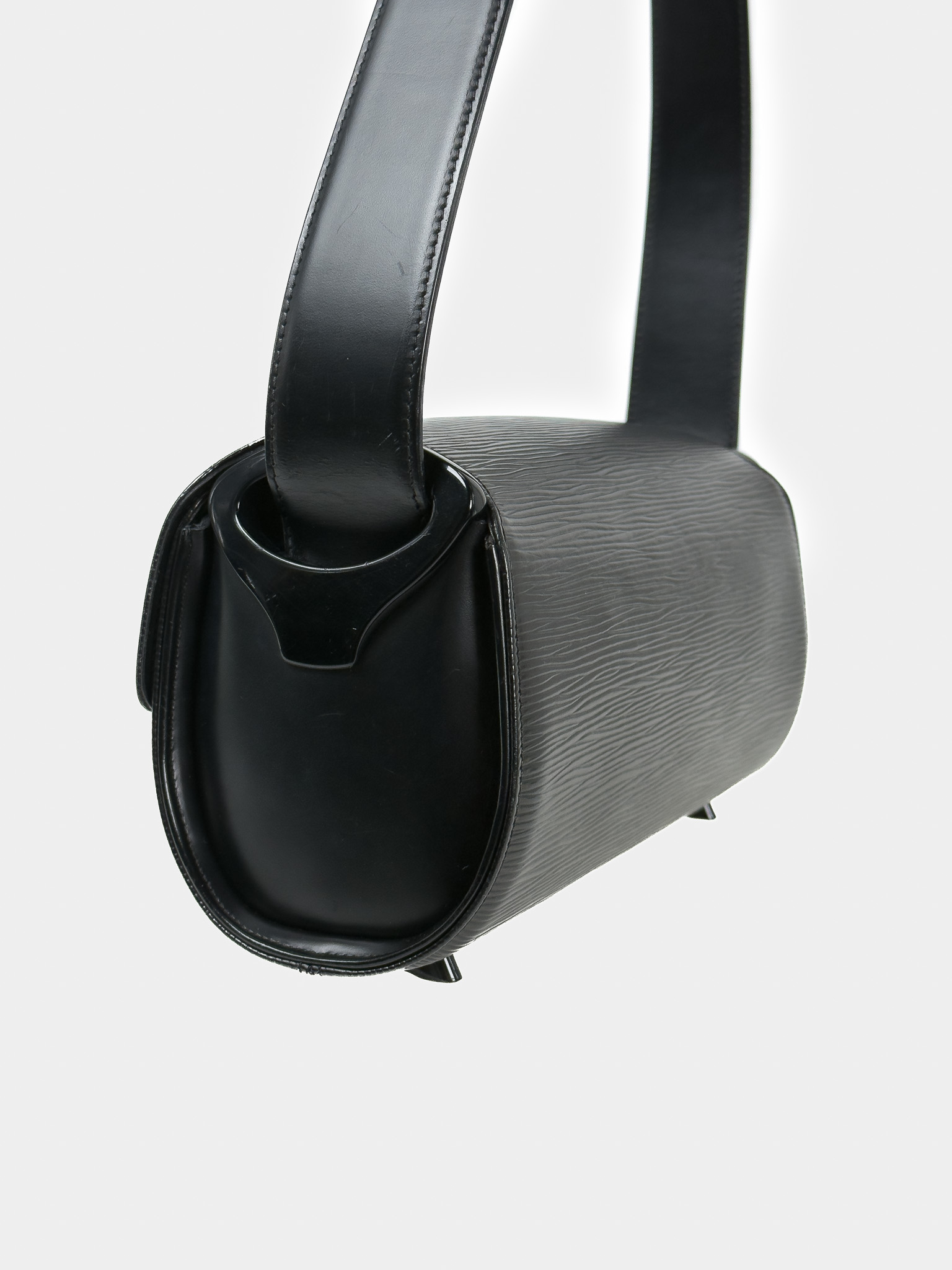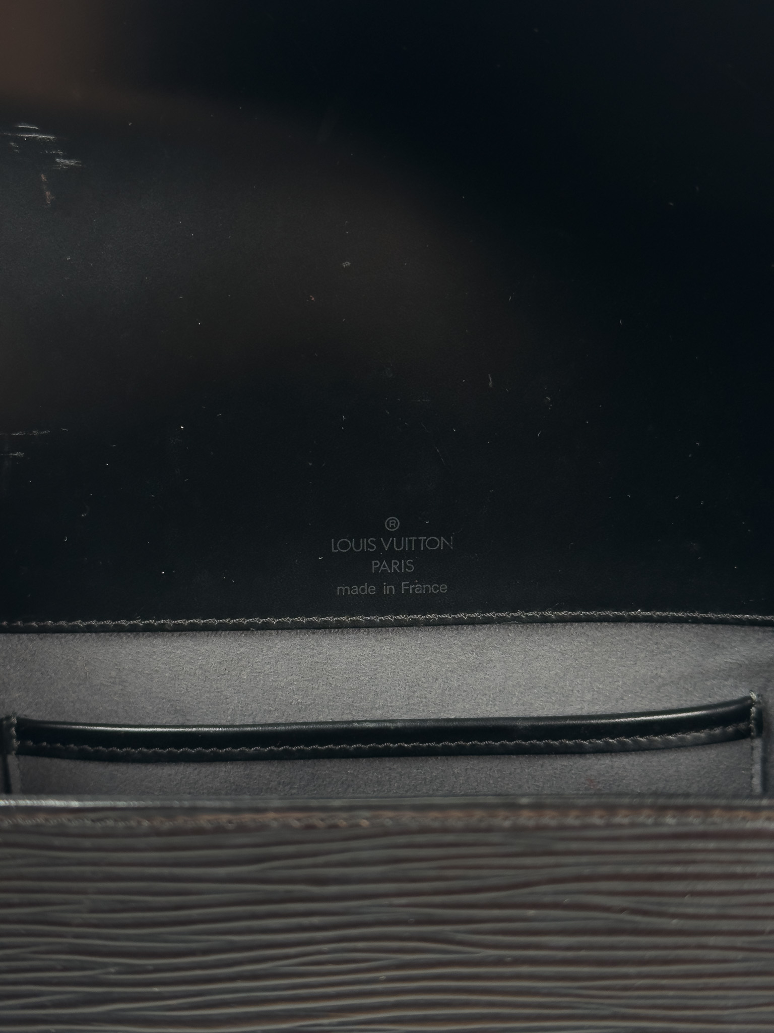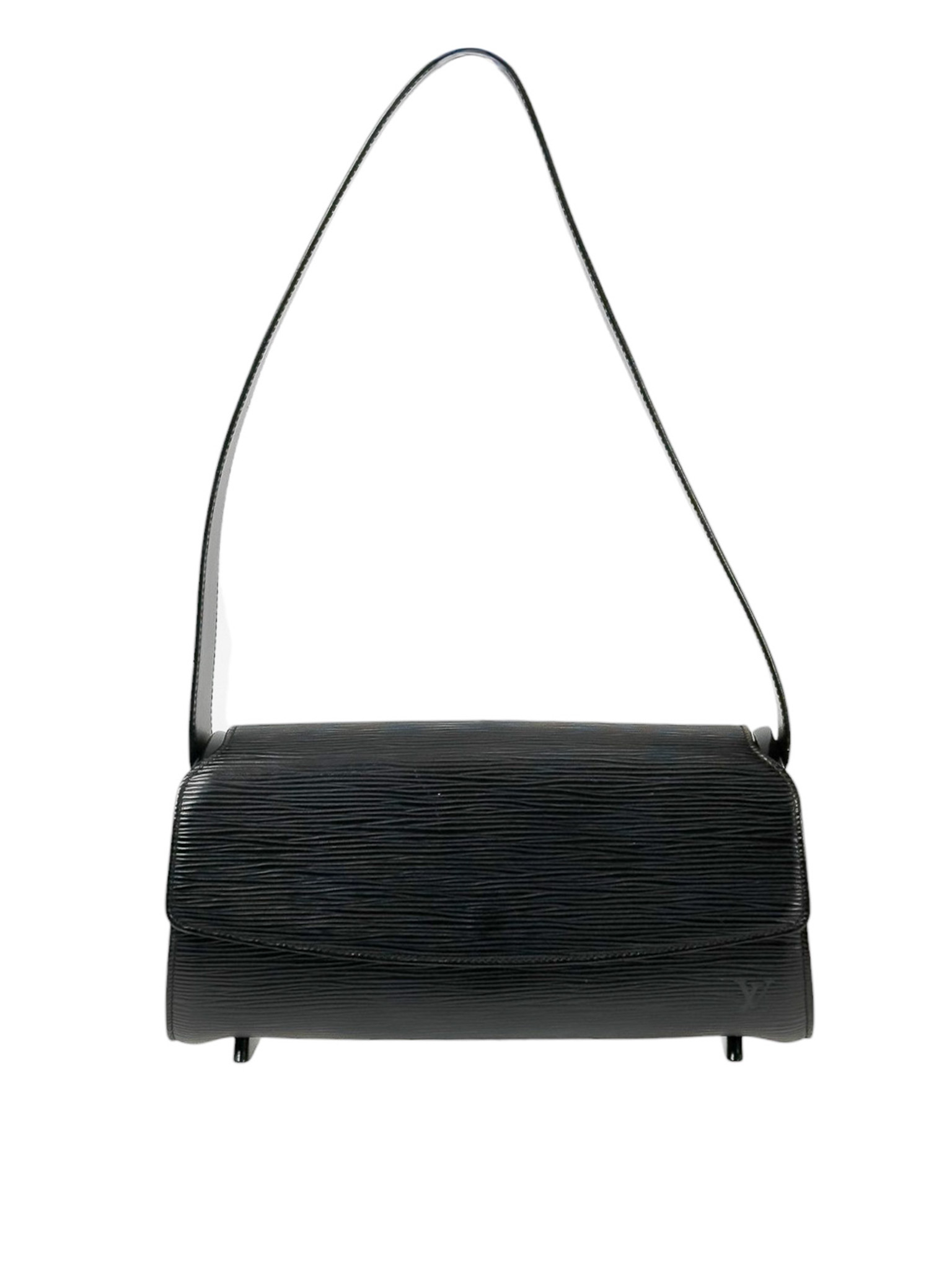 "Czarna torebka w skórze epi, kształt bagietki, logowanie marki w prawym rogu, zapinana na zatrzask, szary środek. Stan: bardzo dobry, pojedyncze zarysowania. Wymiary: szerokość 25cm, wysokość 13cm, głębokość 9cm."