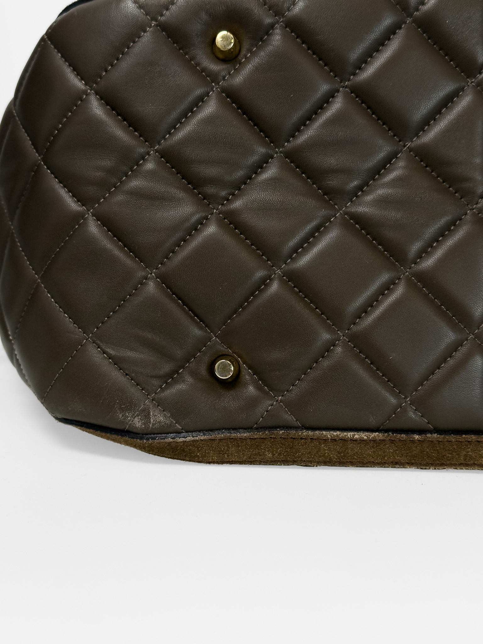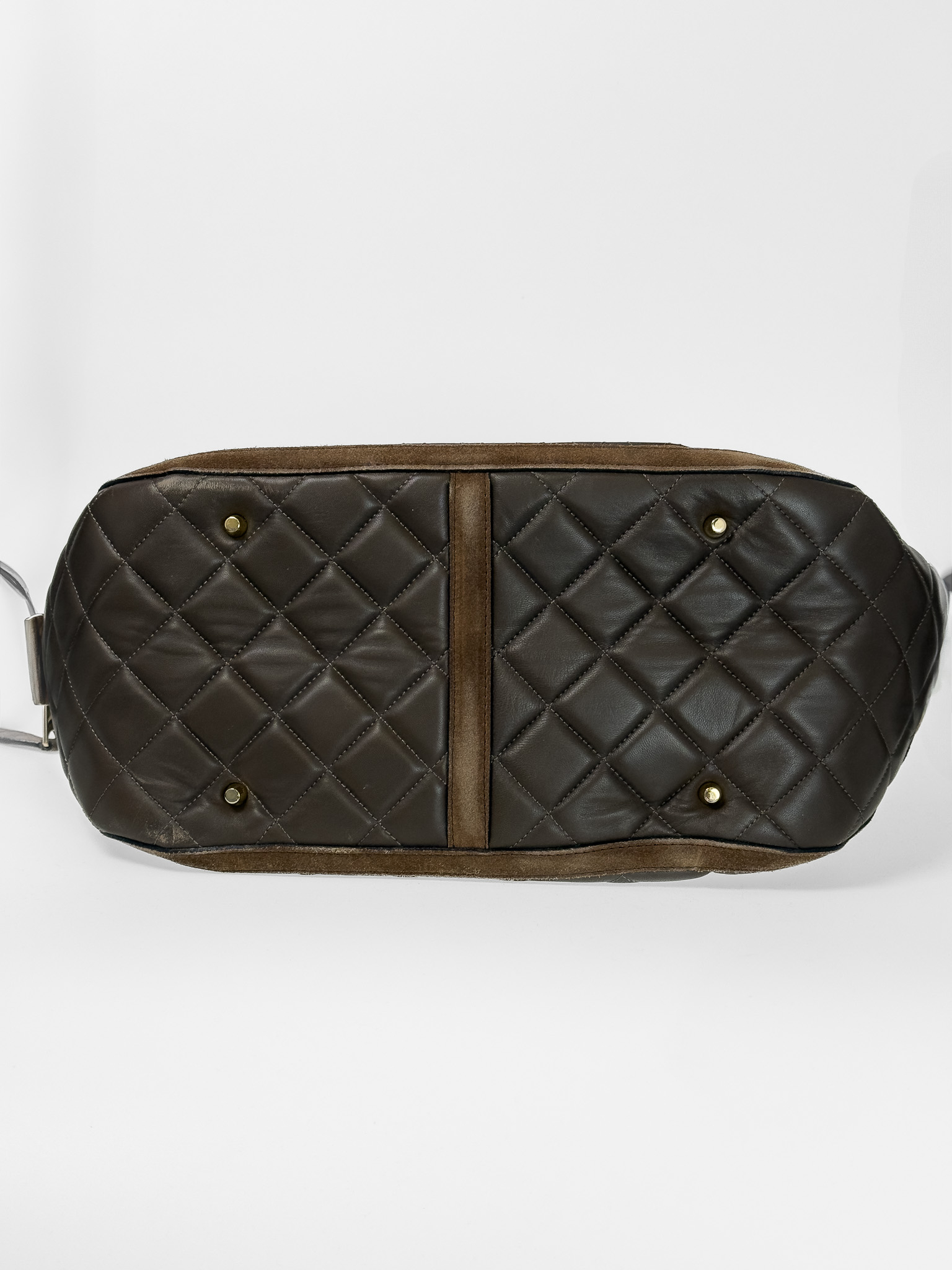 "Duża torba khaki, połączenie skóry oraz zamszu. Kieszeń na przodzie zapinana złotą głową kaczki. Złote okucia. Model Quilted Mallard. Autumn/ Winter 2012/2013 . Stan bardzo dobry. 16,5 cm X 36cm X 36cm"