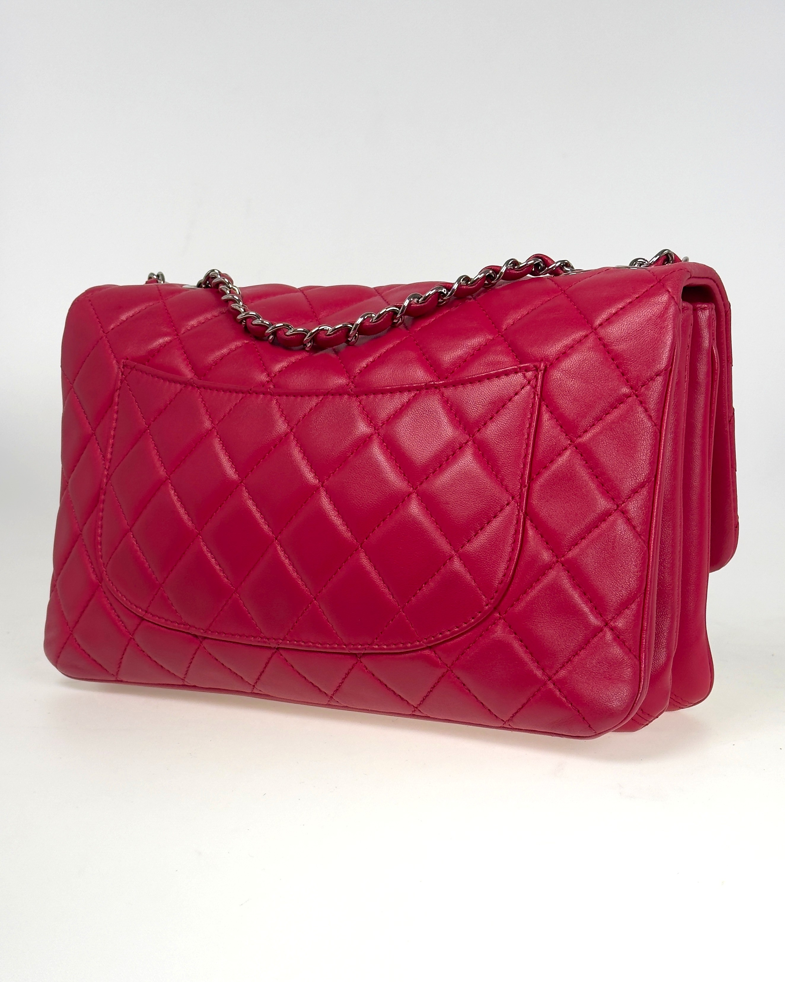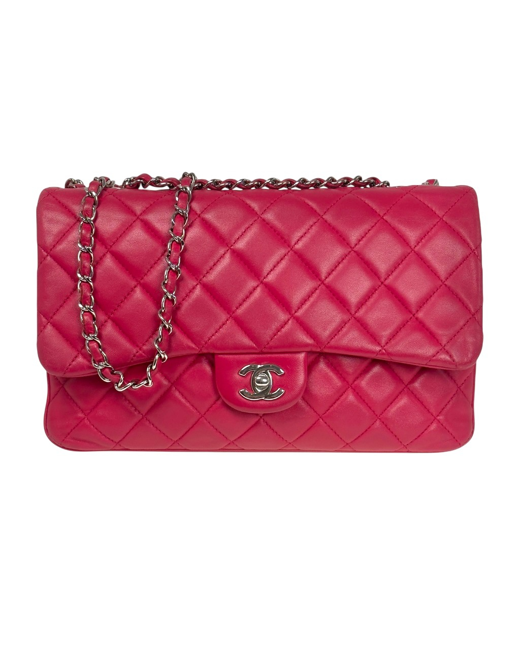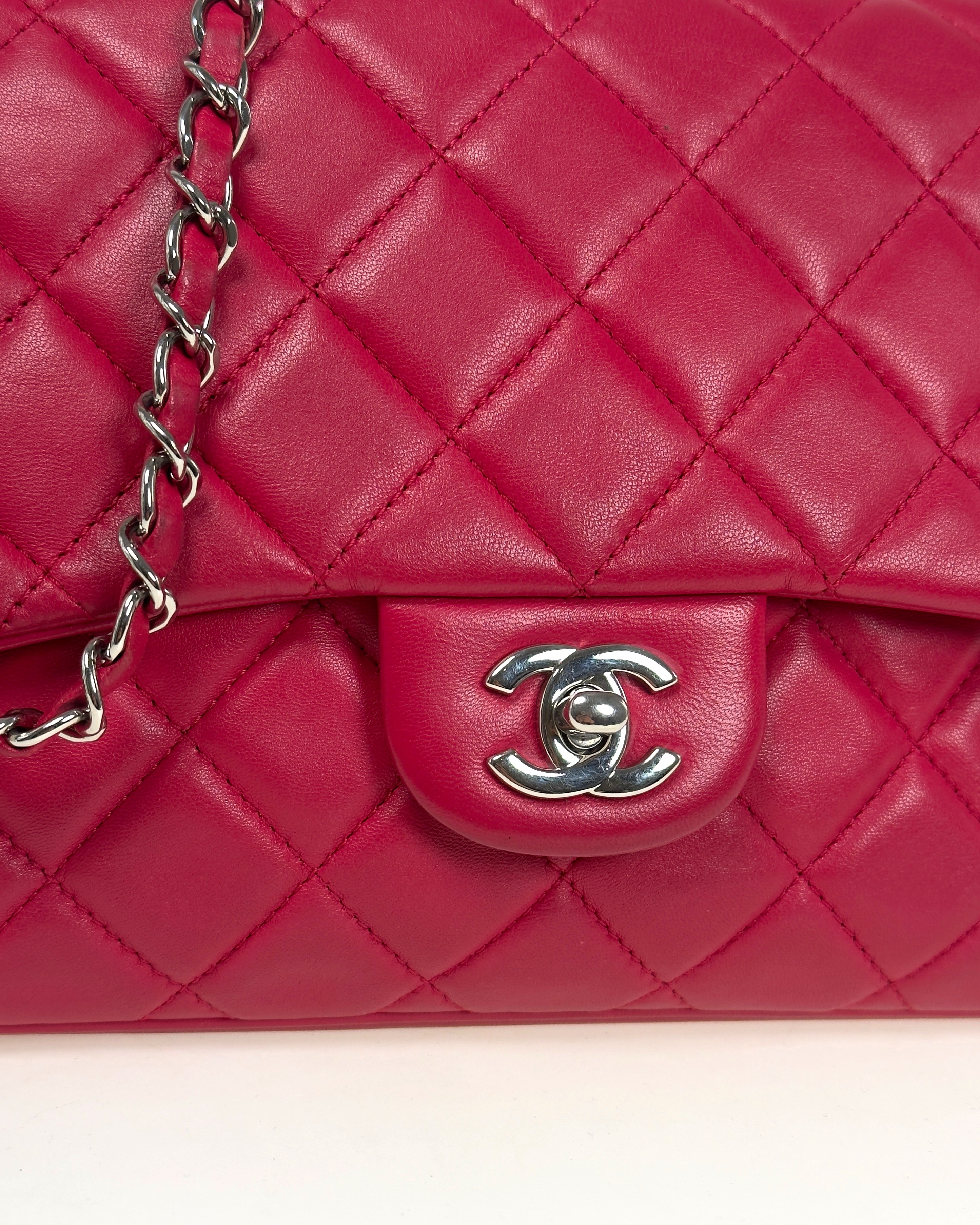 "Chanel Classic Flap - torebka wykonana z miękkiej, pikowanej skóry jagnięcej w intensywnym różowym odcieniu. Model zapinany na charakterystyczne zapięcie CC Turnlock w kolorze srebrnym. Torebka posiada klasyczną klapę, w środku dwie przegrody oraz kieszonkę na zamek. Stan bardzo dobry, posiada kartę autentyczności."