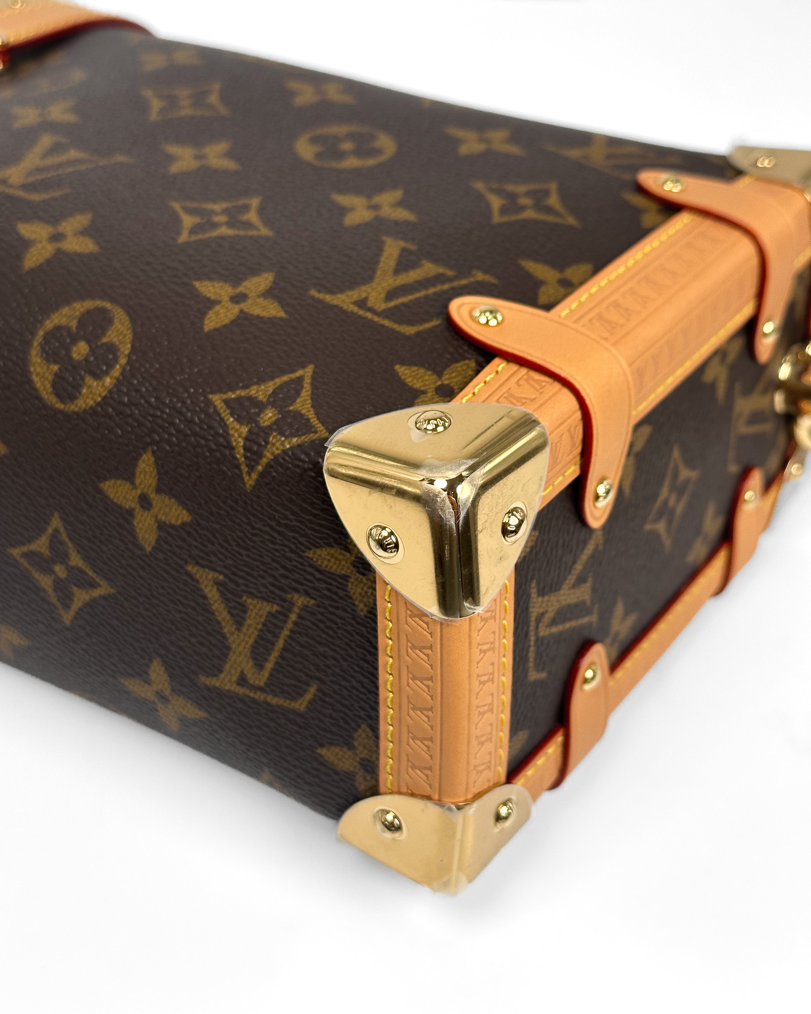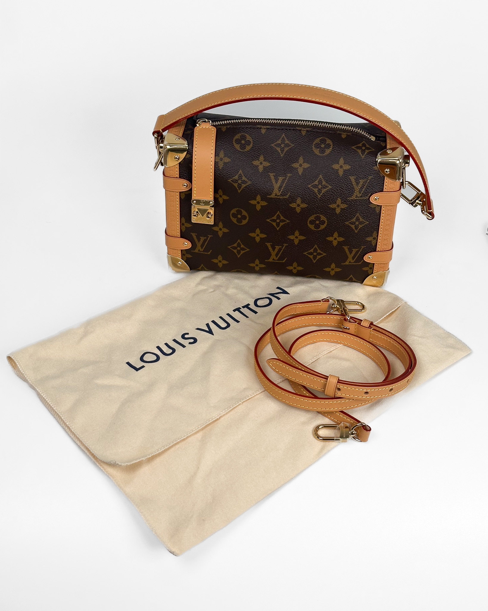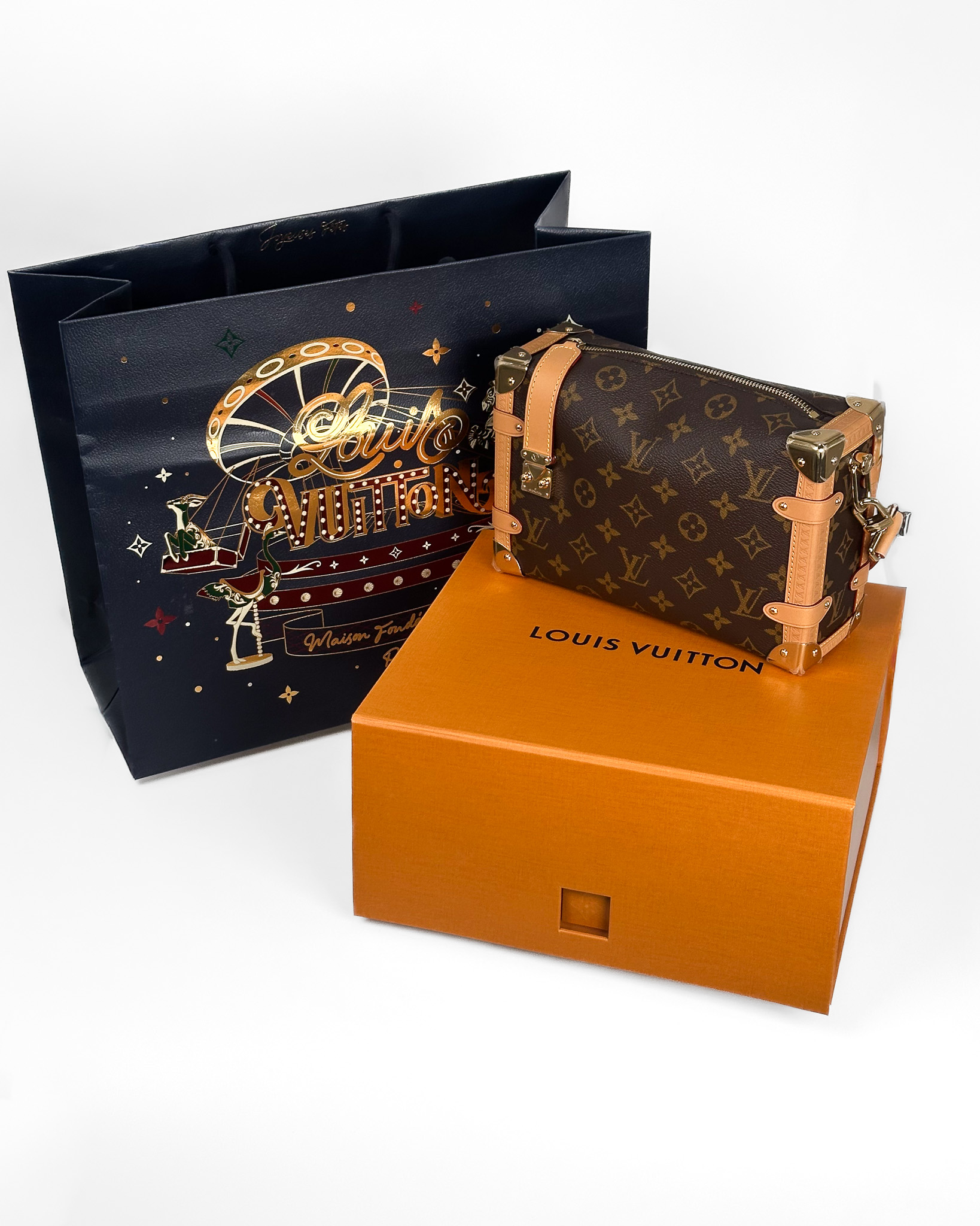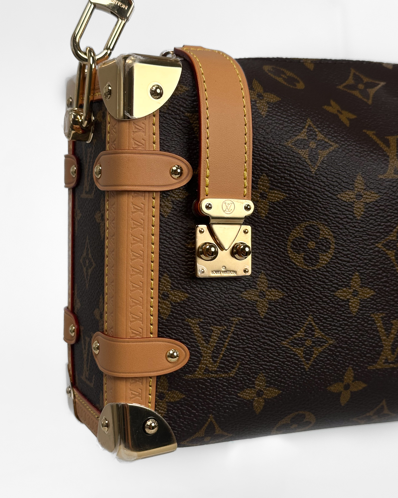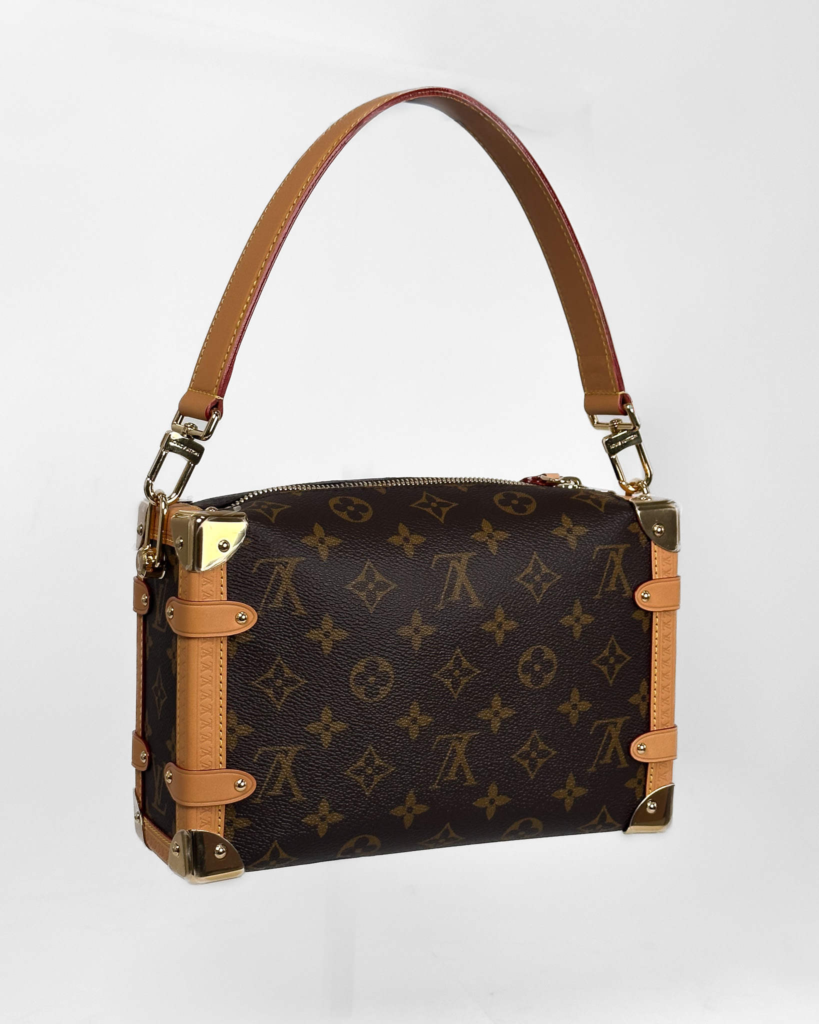 "Model: Side Trunk MM. Torebka w monogram ze skórzanymi wykończeniami. Posiada unikatowy skórzany suwak z kultowym zamkiem S-lock oraz wzmocnione metalowe narożniki. Szeroki uchwyt górny jest odpinany, możliwość dopięcia dwóch pasków. W zestawie z pudełkiem. Nowa. Wymiary: szerokość 24cm, wysokość 15,5cm, głębokość 8,5cm."