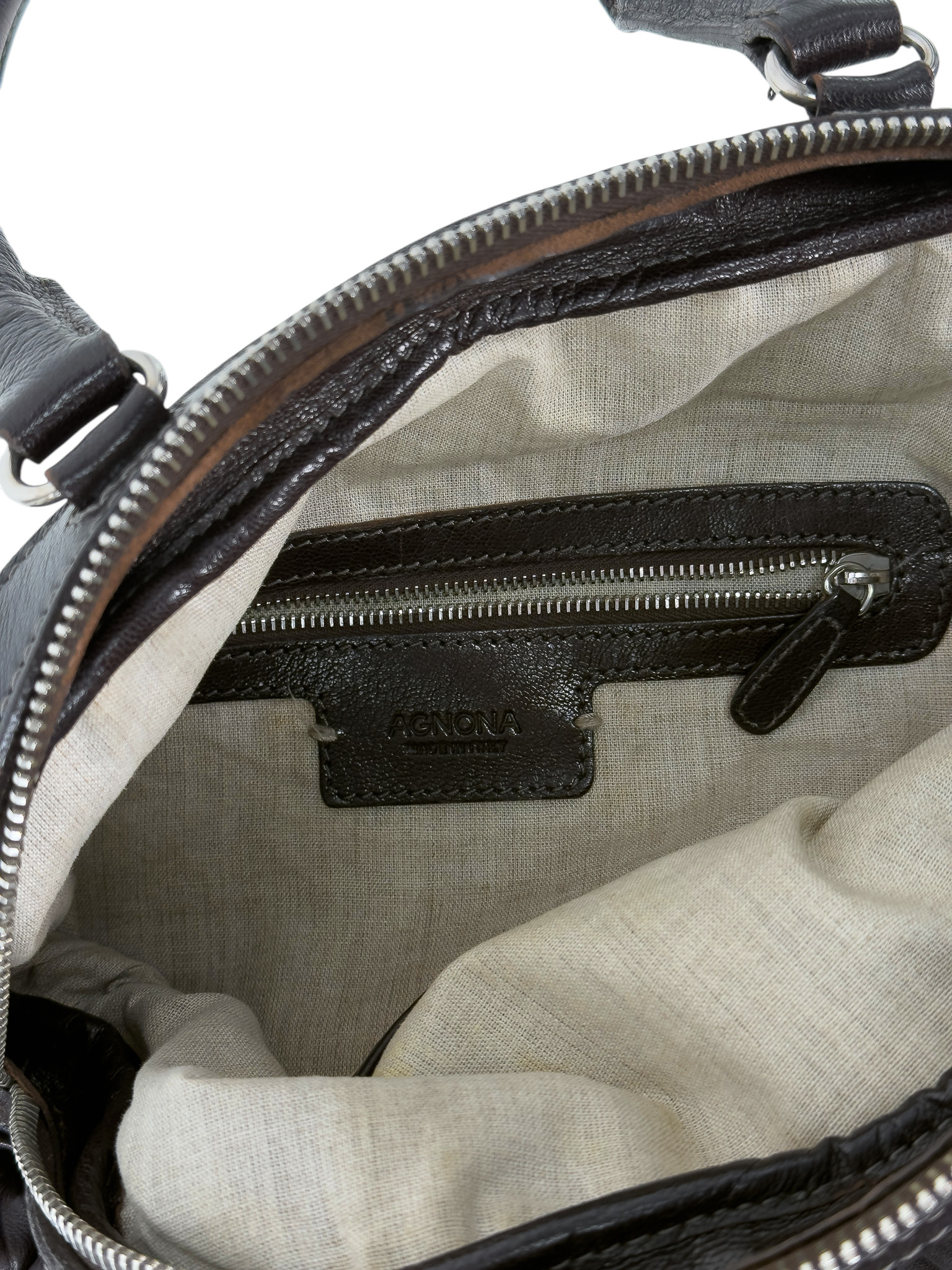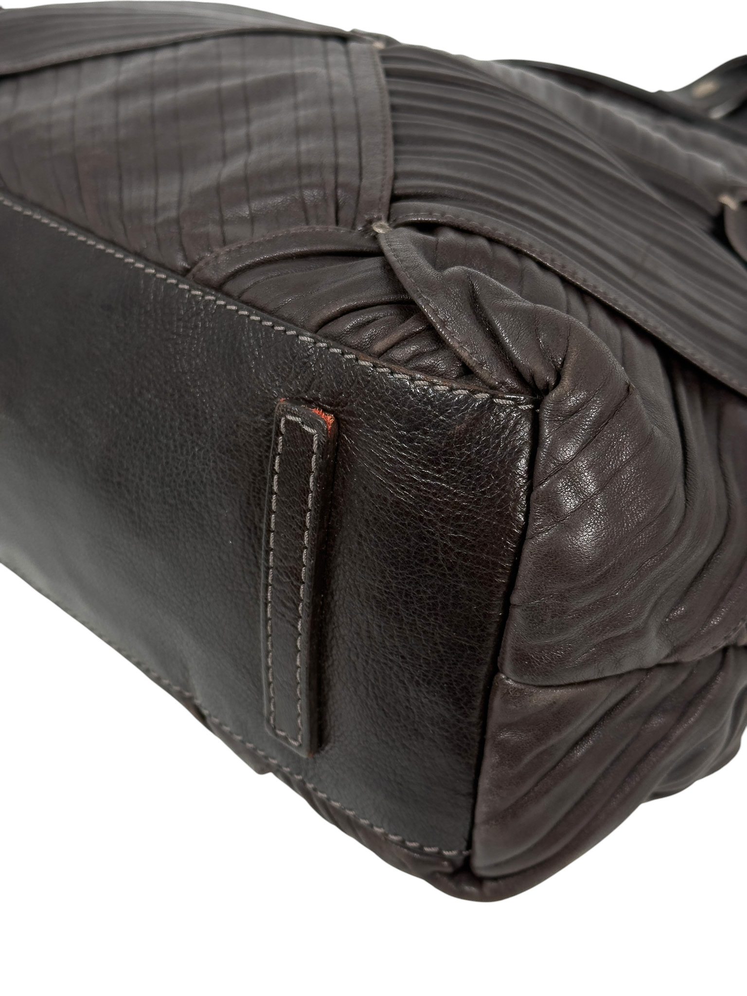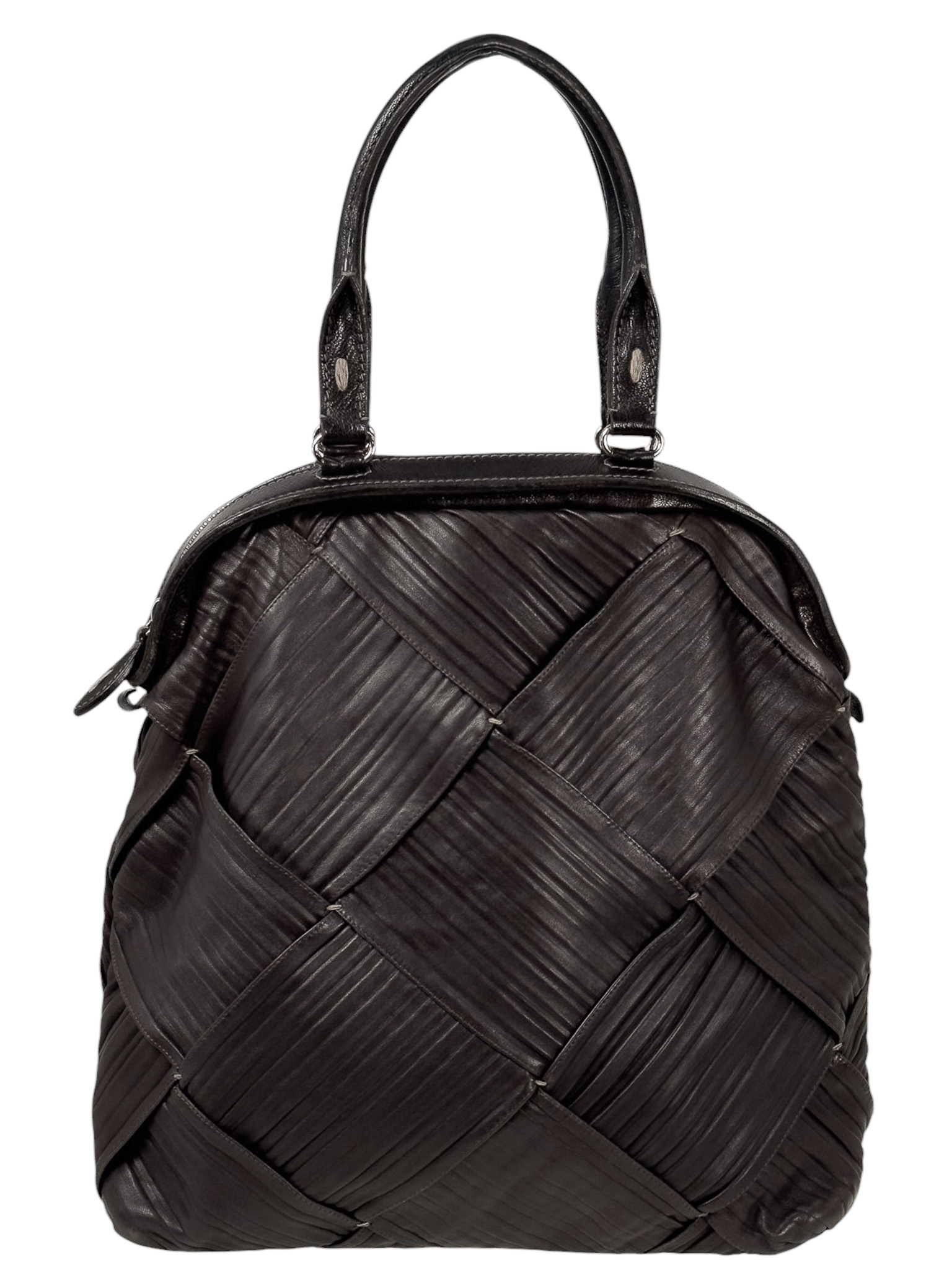 "Brązowa skórzana torebka, do ręki, na ramię, dwa uchwyty, zapinana na srebrny suwak, ozdobiona szerokim, delikatnie marszczonym pleceniem, jedna komora wewnątrz z trzema kieszeniami. Stan dobry, posiada przetarcia od spodu oraz przy suwaku i delikatne rysy na skórze. Wymiary: szerokość 36cm, wysokość 40cm, głębokość 13cm."