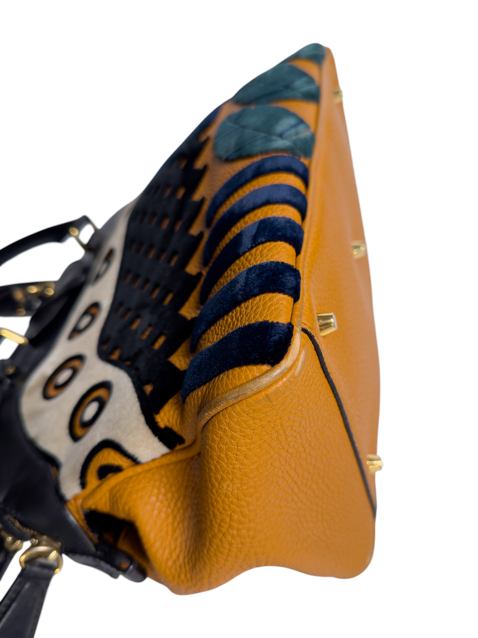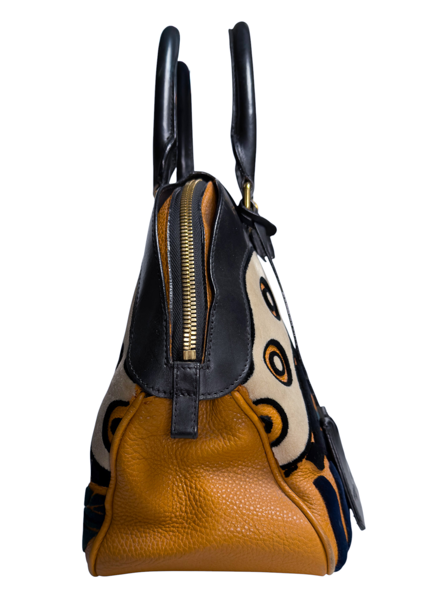 "Czarno pomarańczowa torba wykonana ze skóry z kolorowymi pluszowymi wzorami. Miejscami rysy na skórze i przetarcia na materiale. Wymiary: 36x28x15cm, rączki: 36cm"