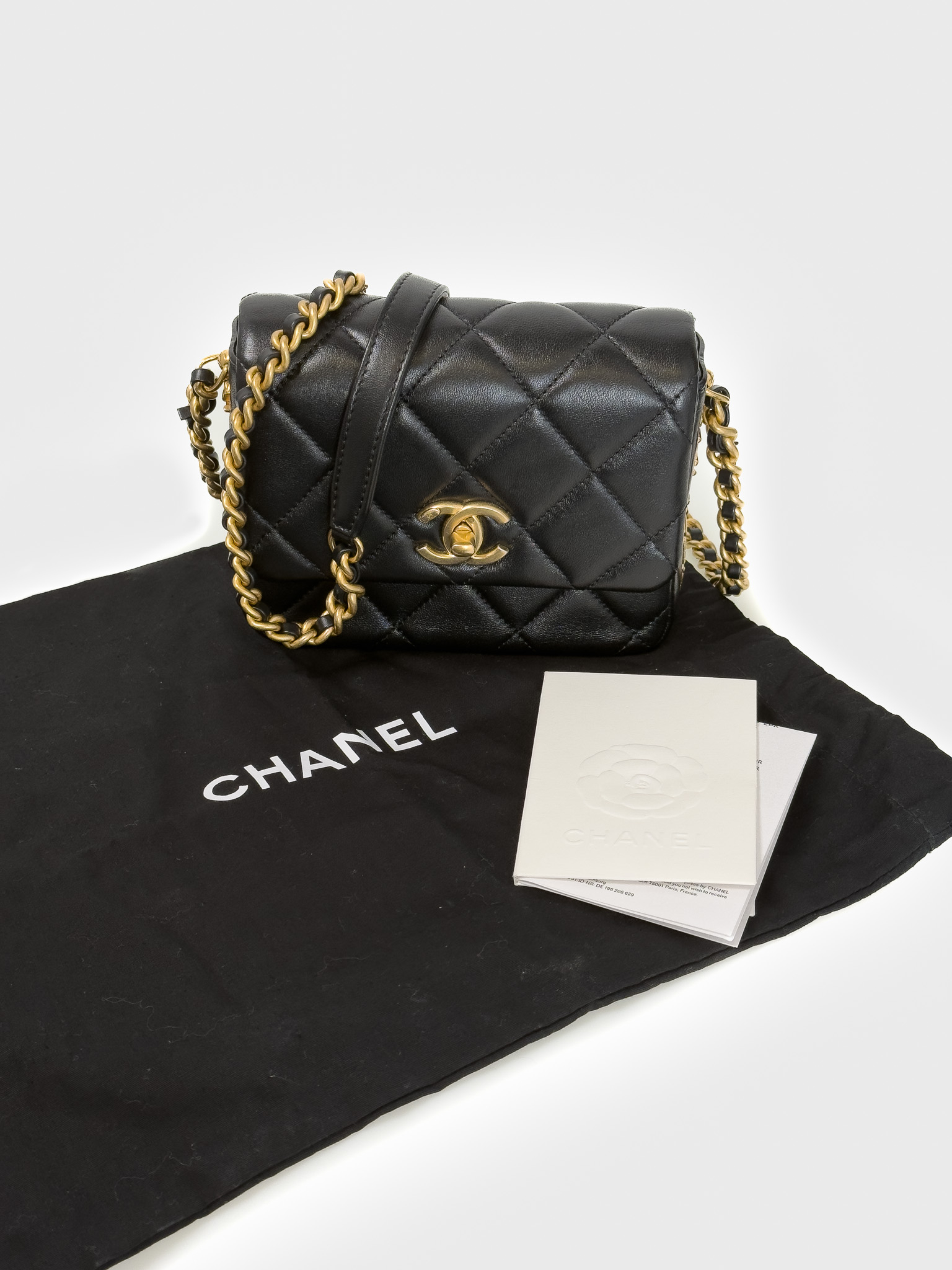 "Czarna skórzana pikowana diamentowo torebka, kwadratowy kształt, miękka skóra, złote, przekręcane zapięcie z logo marki na przodzie, długi pasek na ramię ozdobiony złotym łańcuchem, duże złote logo marki w bocznej części, bordowe wnętrze, jedna komora z kieszenią, w zestawie z workiem przeciwkurzowym oraz dowodem zakupu. Stan bardzo dobry. Wymiary: szerokość 16cm, wysokość 12cm, głębokość 5cm. Zakupiona w 2021 roku w butiku Chanel w Berlinie."