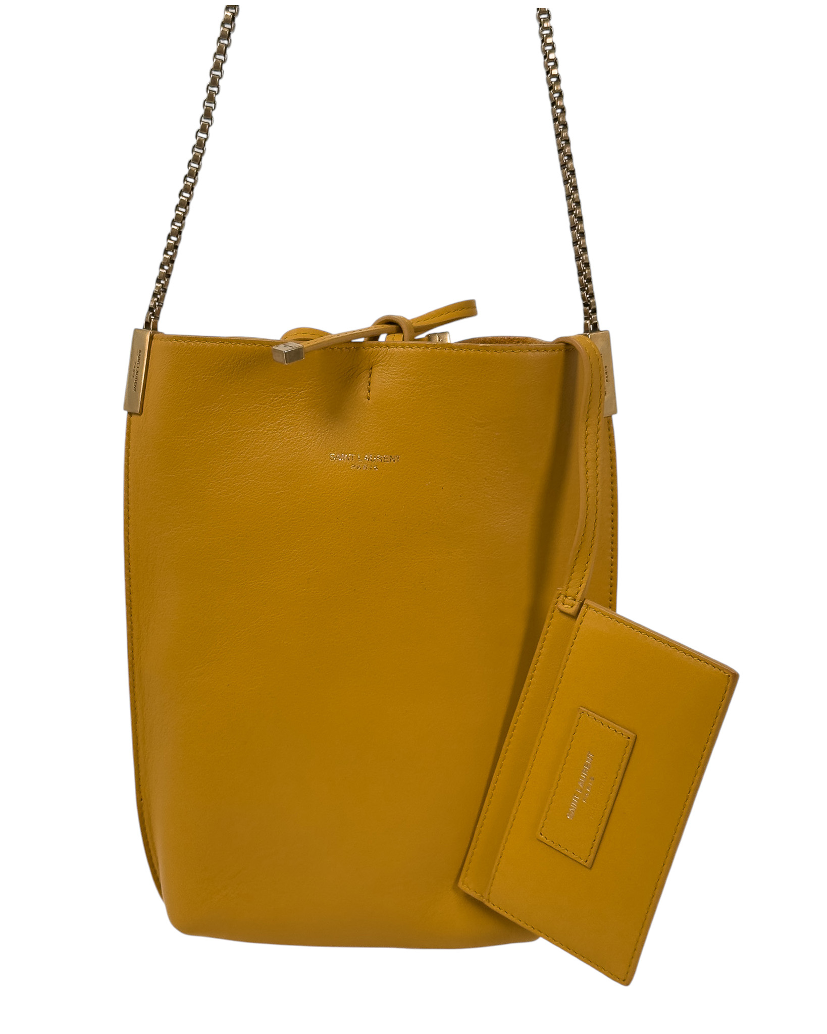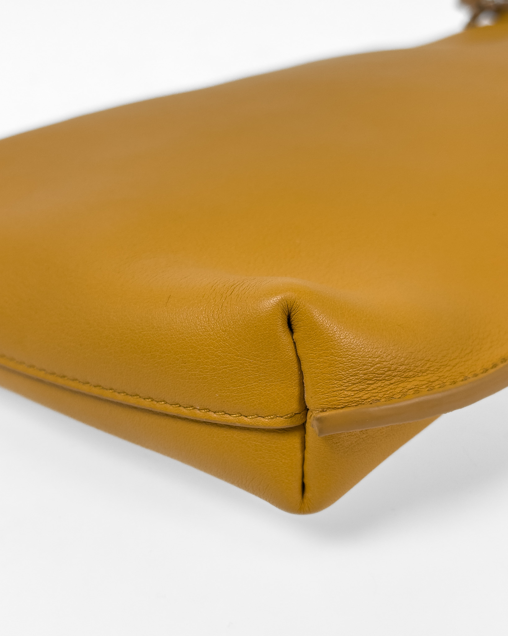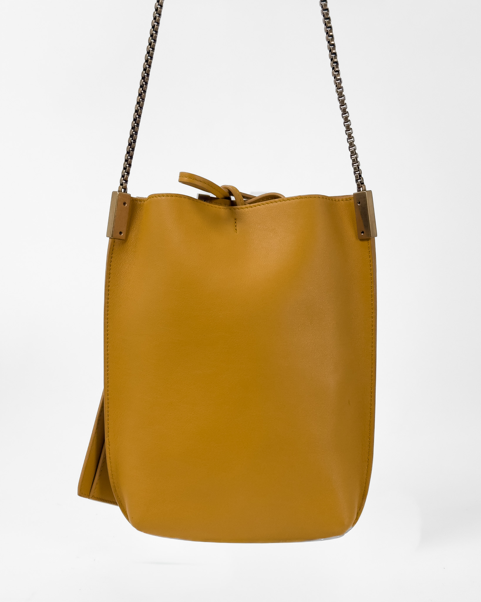 "Musztardowa skórzana torebka na złotym łańcuszku, delikatne logowanie na przodzie, prostokątny kształt, w środku posiada cardholder, wiązana góra, zamszowe wnętrze. Worek przeciwkurzowy w komplecie. Stan: bardzo dobry. Wymiary: szerokość 19cm, wysokość 23cm, głębokość 4cm."