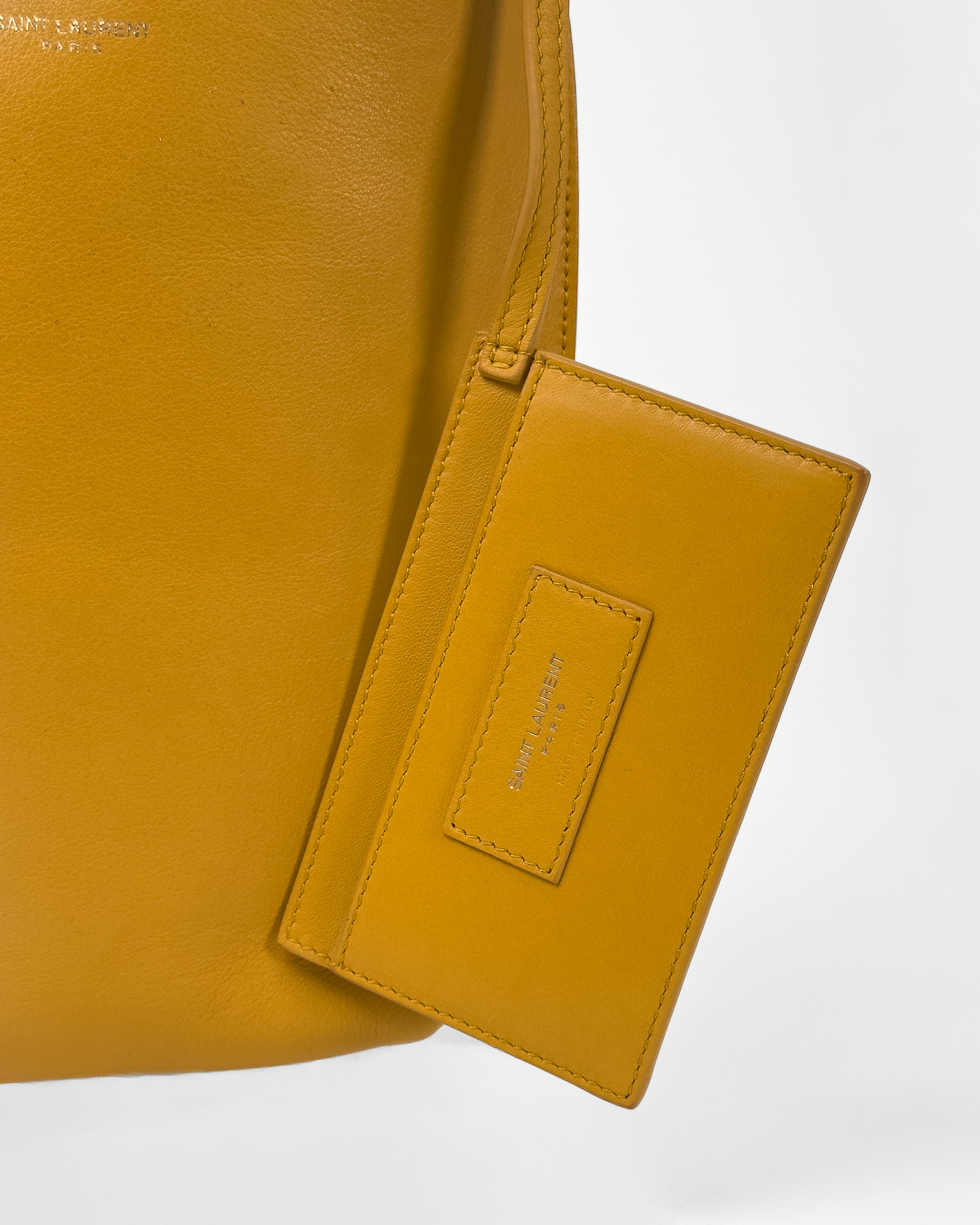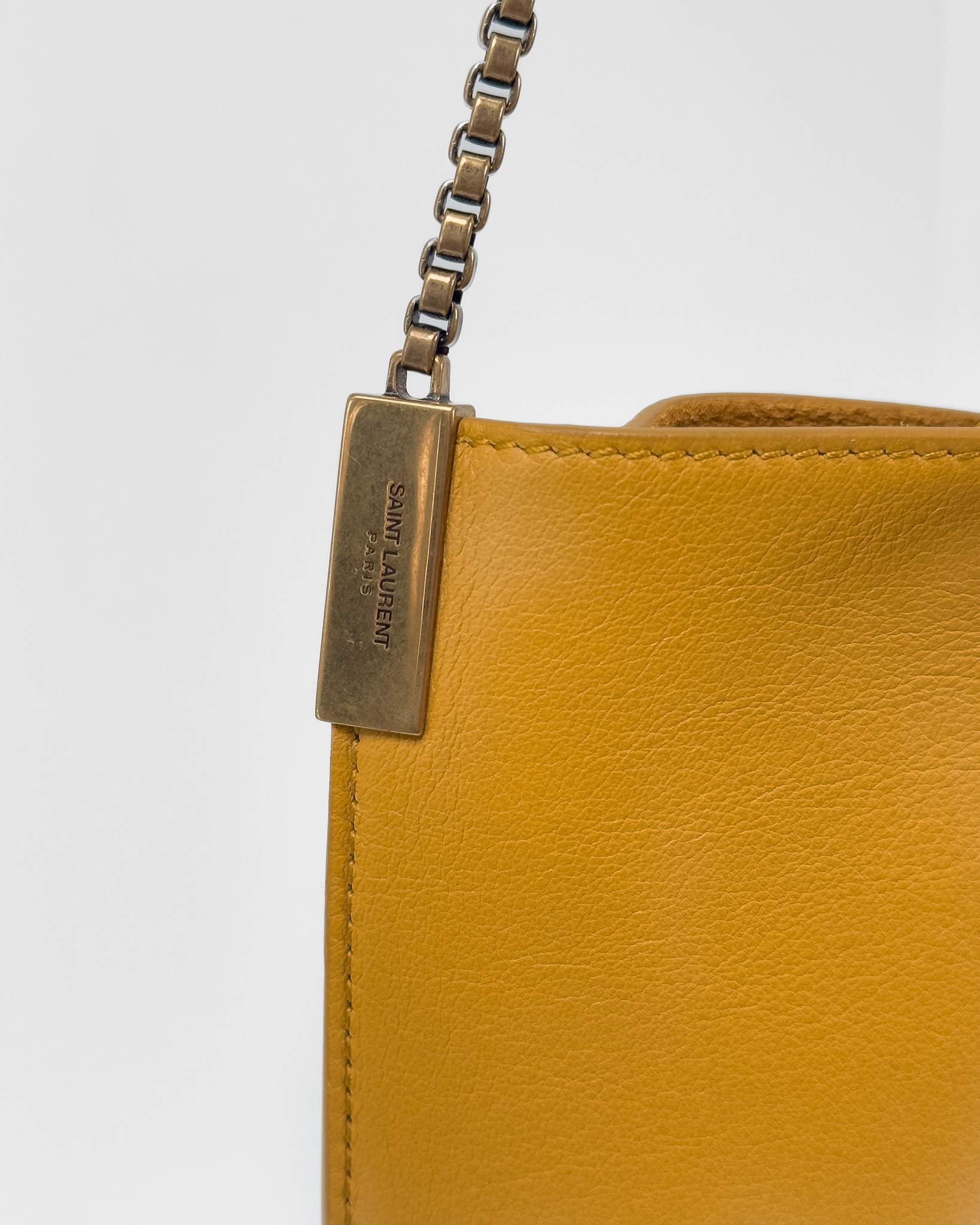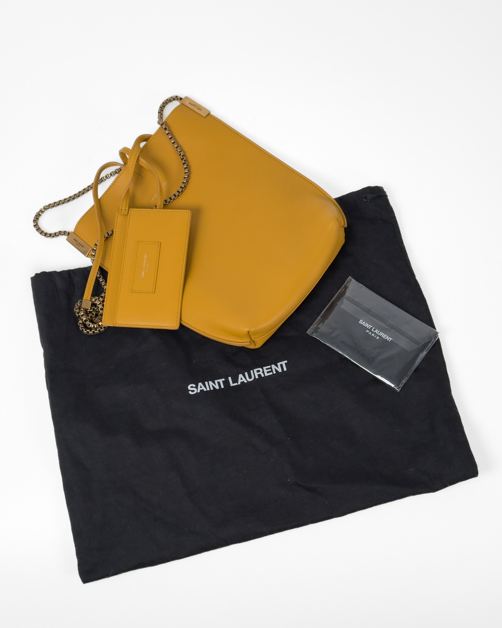 "Musztardowa skórzana torebka na złotym łańcuszku, delikatne logowanie na przodzie, prostokątny kształt, w środku posiada cardholder, wiązana góra, zamszowe wnętrze. Worek przeciwkurzowy w komplecie. Stan: bardzo dobry. Wymiary: szerokość 19cm, wysokość 23cm, głębokość 4cm."