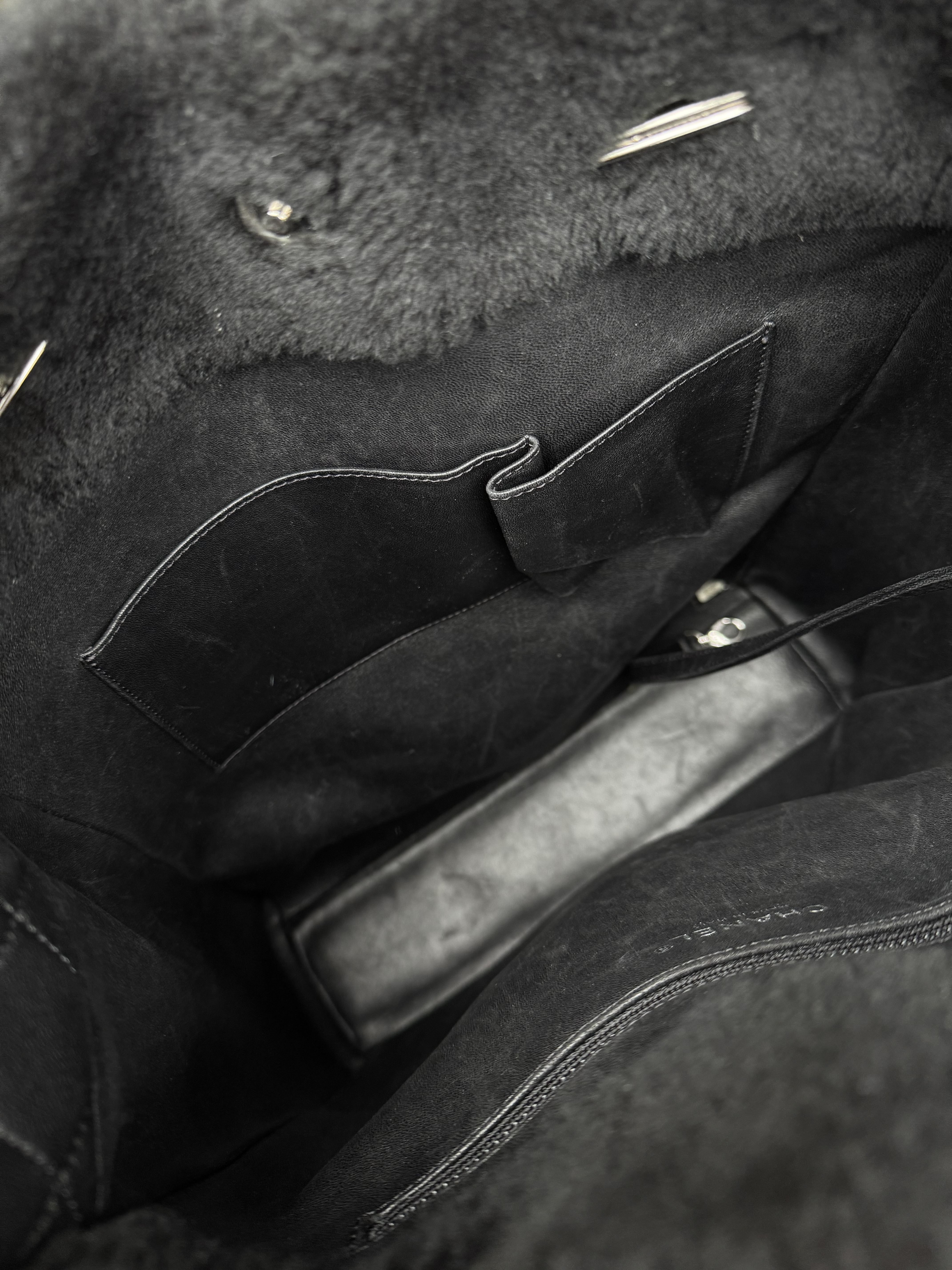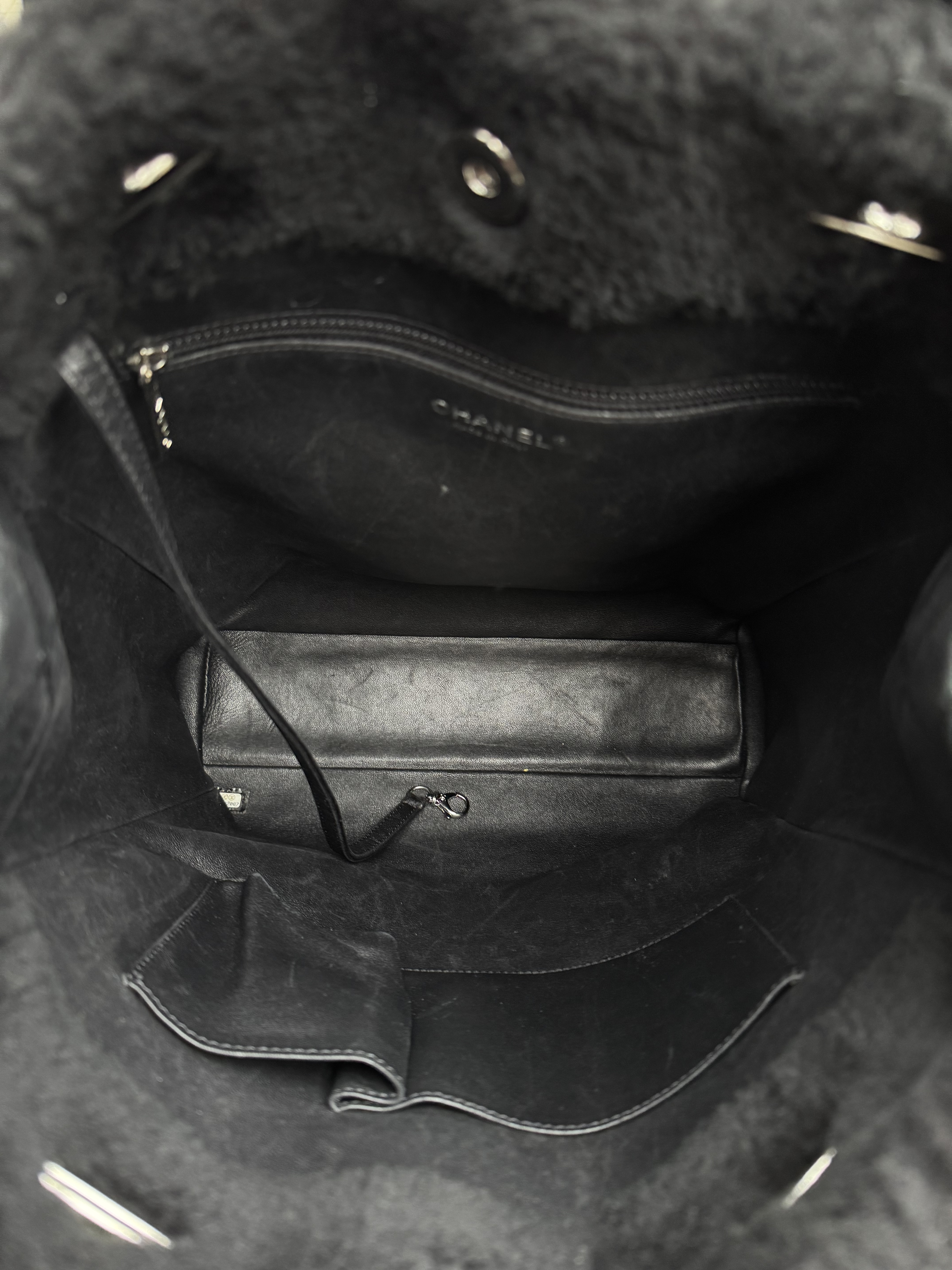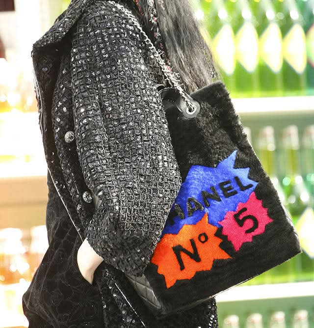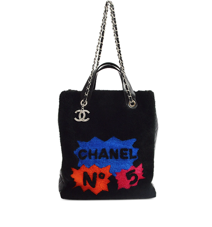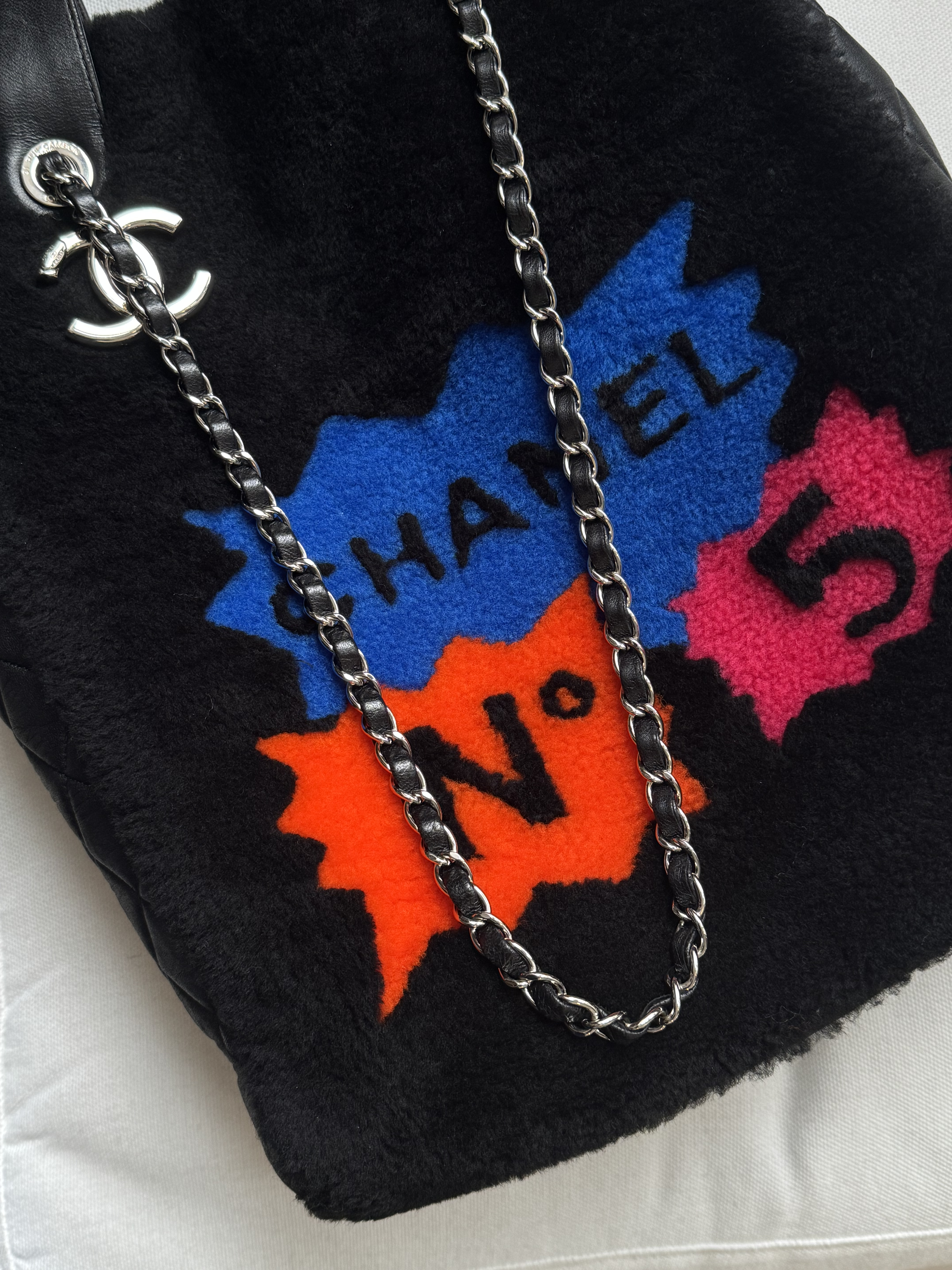 "Czarna torebka, połączenie pluszu/futerka i skóry. Boki ze skóry pikowanej, skórzane rączki oraz łańcuch na ramię. Srebrne okucia. Na przodzie kolorowe napisy No 5, z tyły żólty napis 100% CC. Rok produkcji z kodu seryjnego 2014-2015. Worek przeciwkurzowy oraz karta autentyczności w komplecie. Kolekcja Supermarker 2024/2015"