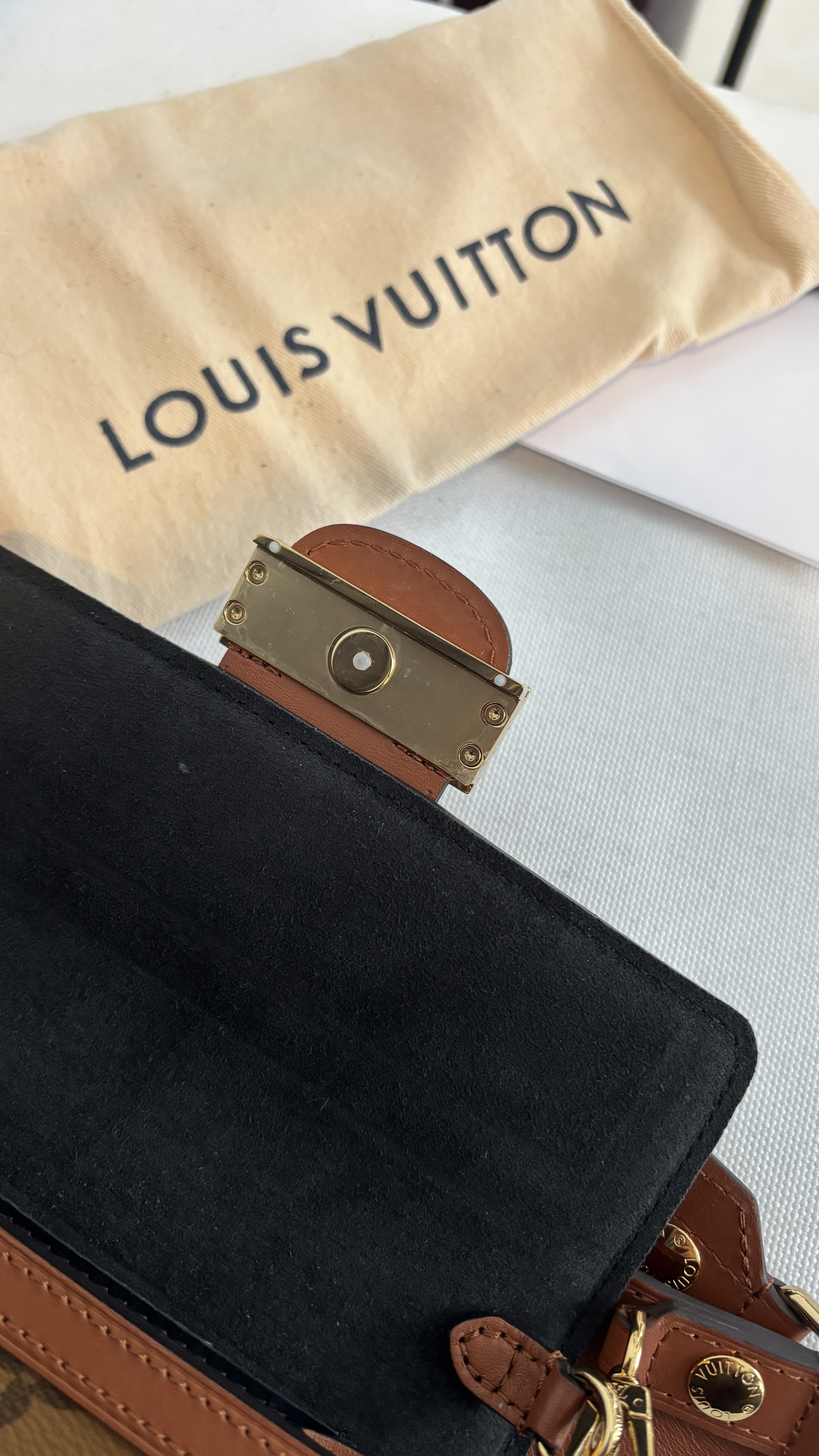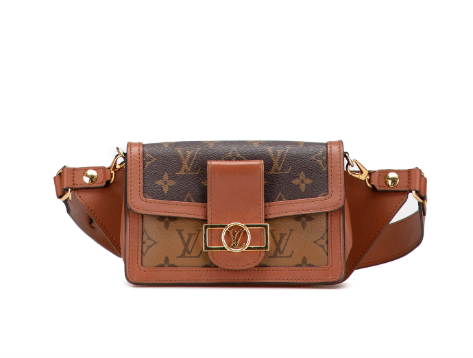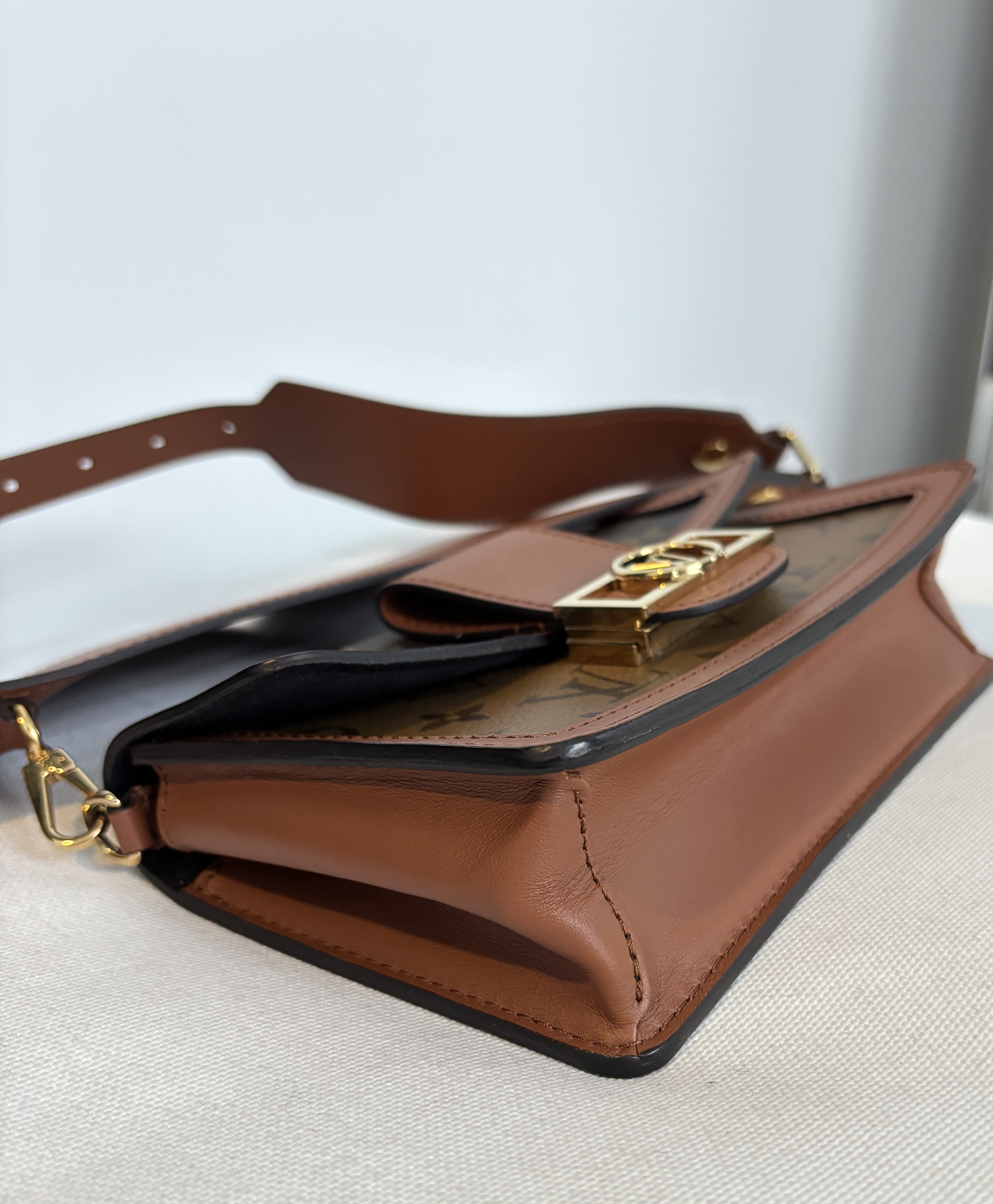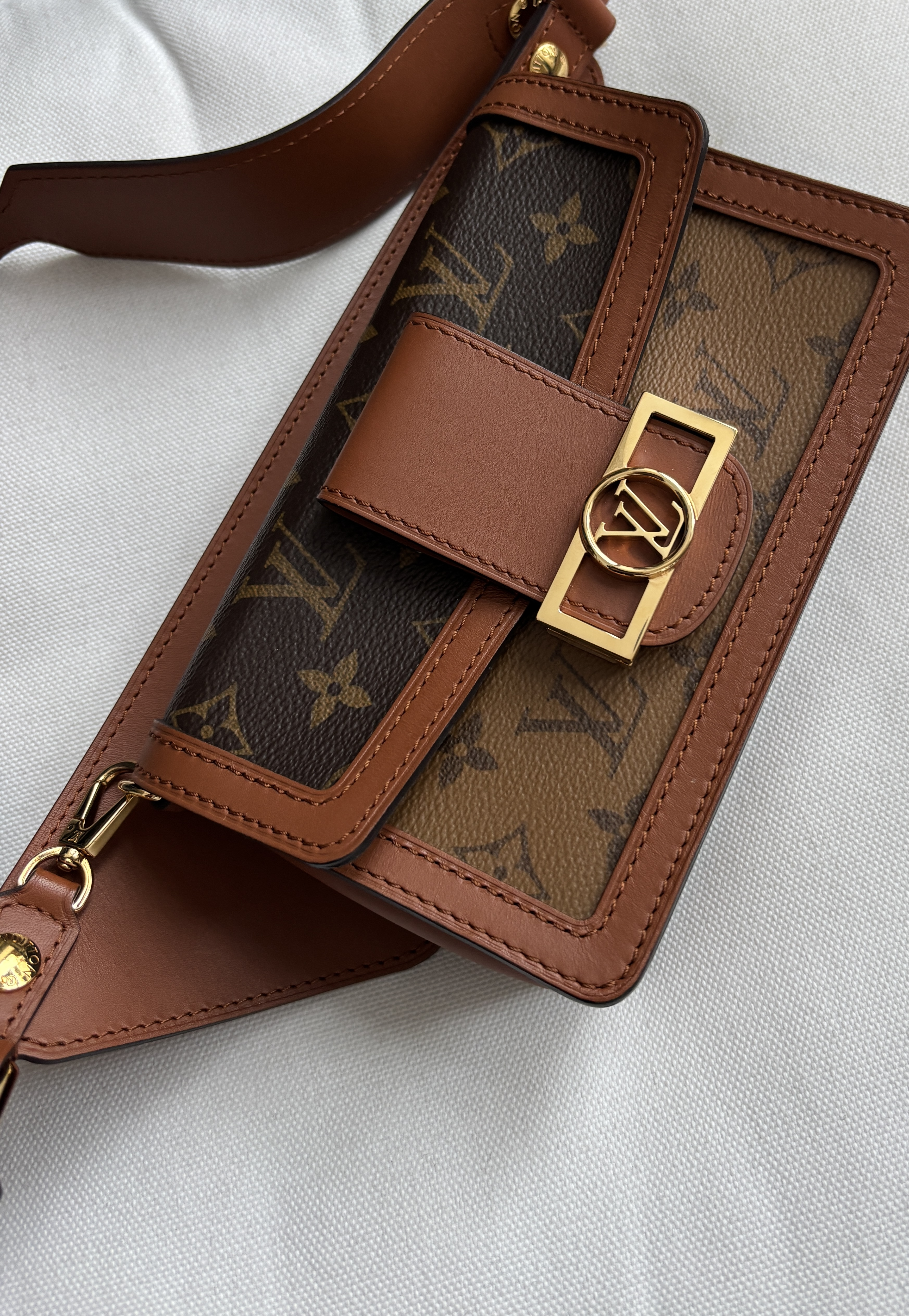 "Model Dauphine belt bag, skórzana camelowa/brązowa nerka z dwoma odcieniami monogramu, złote okucia, zapinana na zatrzask, worek przeciwkurzowy w komplecie oraz potwierdzenie zakupu ( duplikat z butiku Louis Vuitton), stan bardzo dobry. Wymiary: wysokość 12,5 cm , szerokość 19 cm, głębokość 6 cm"