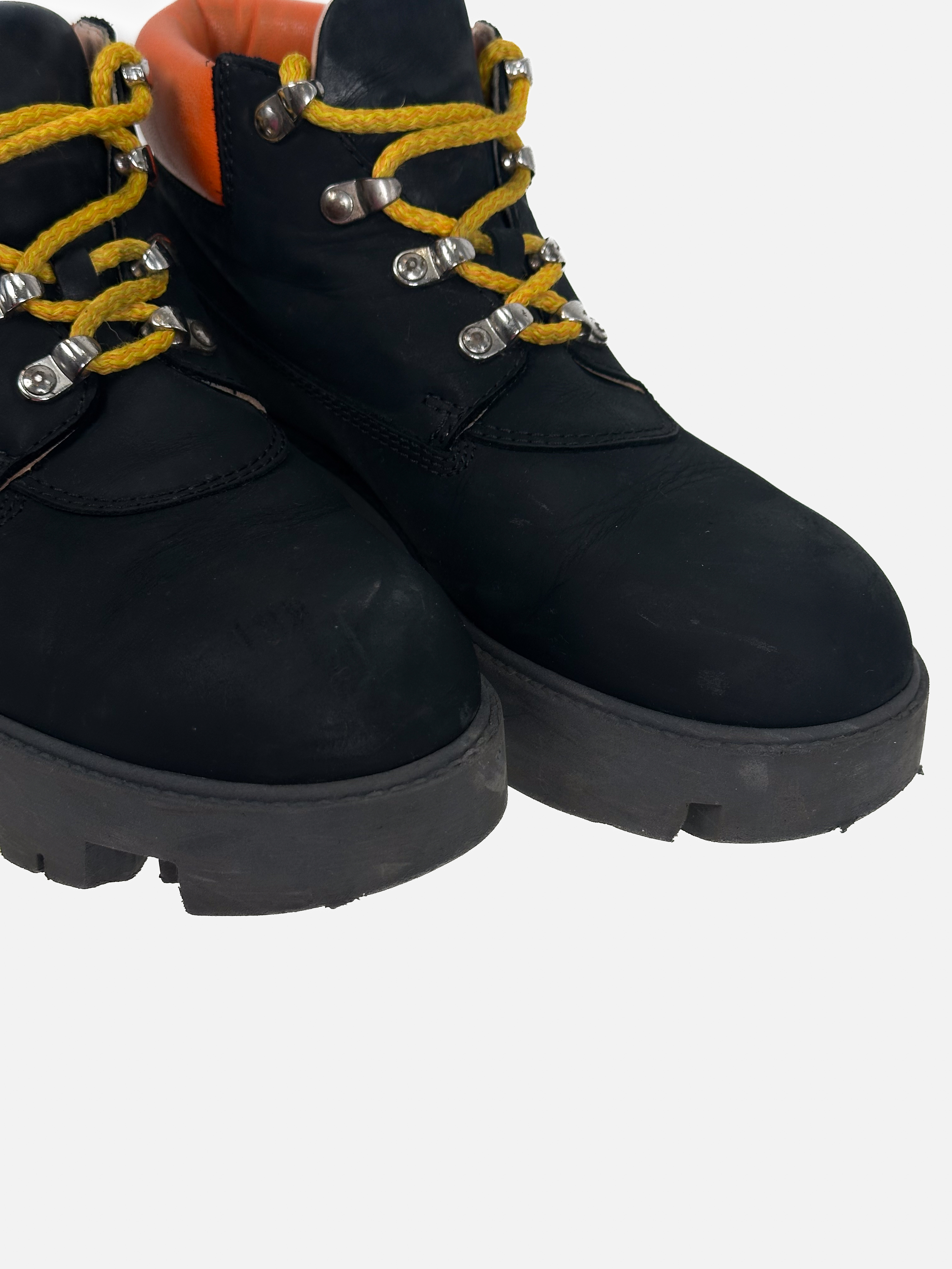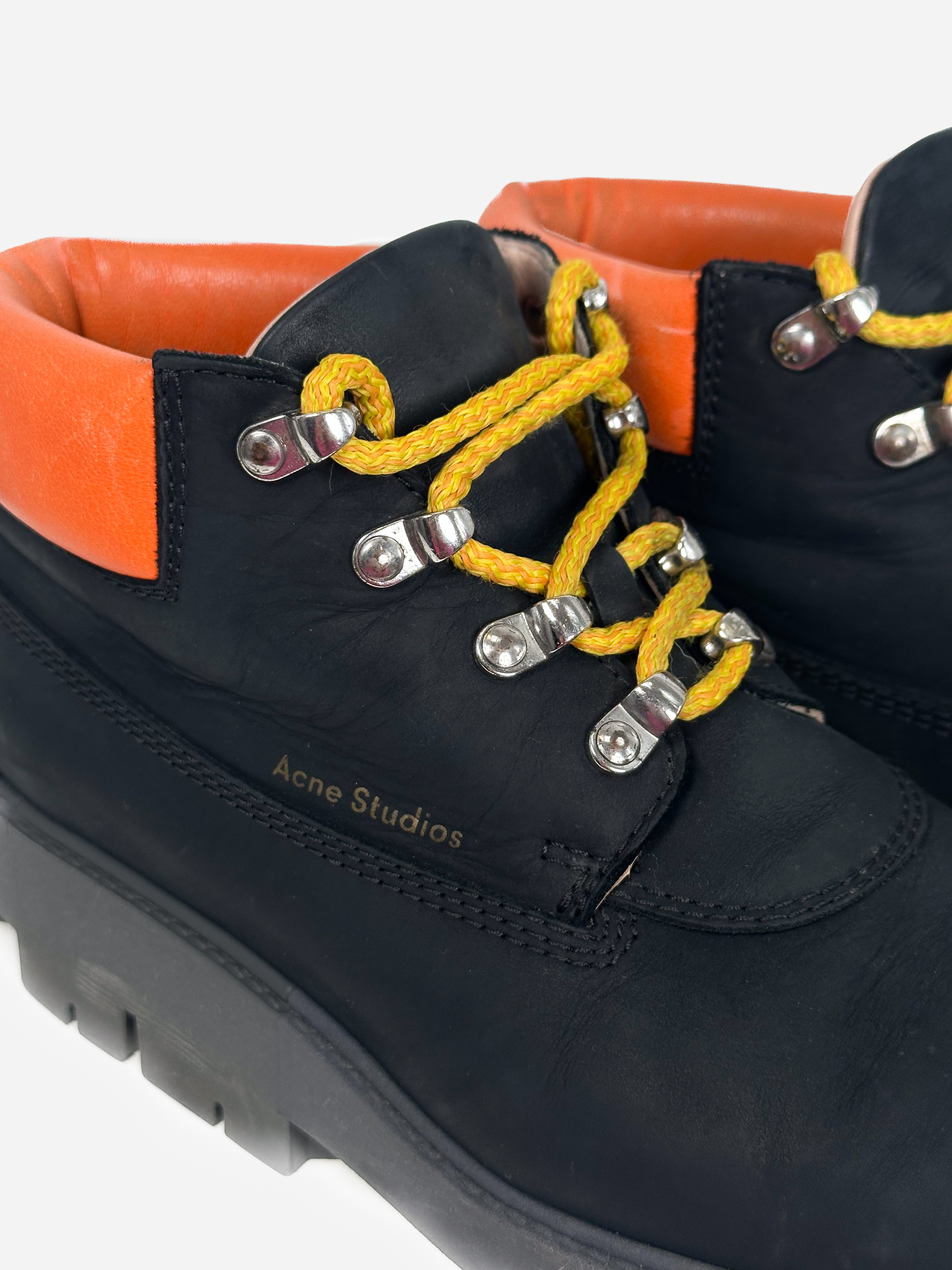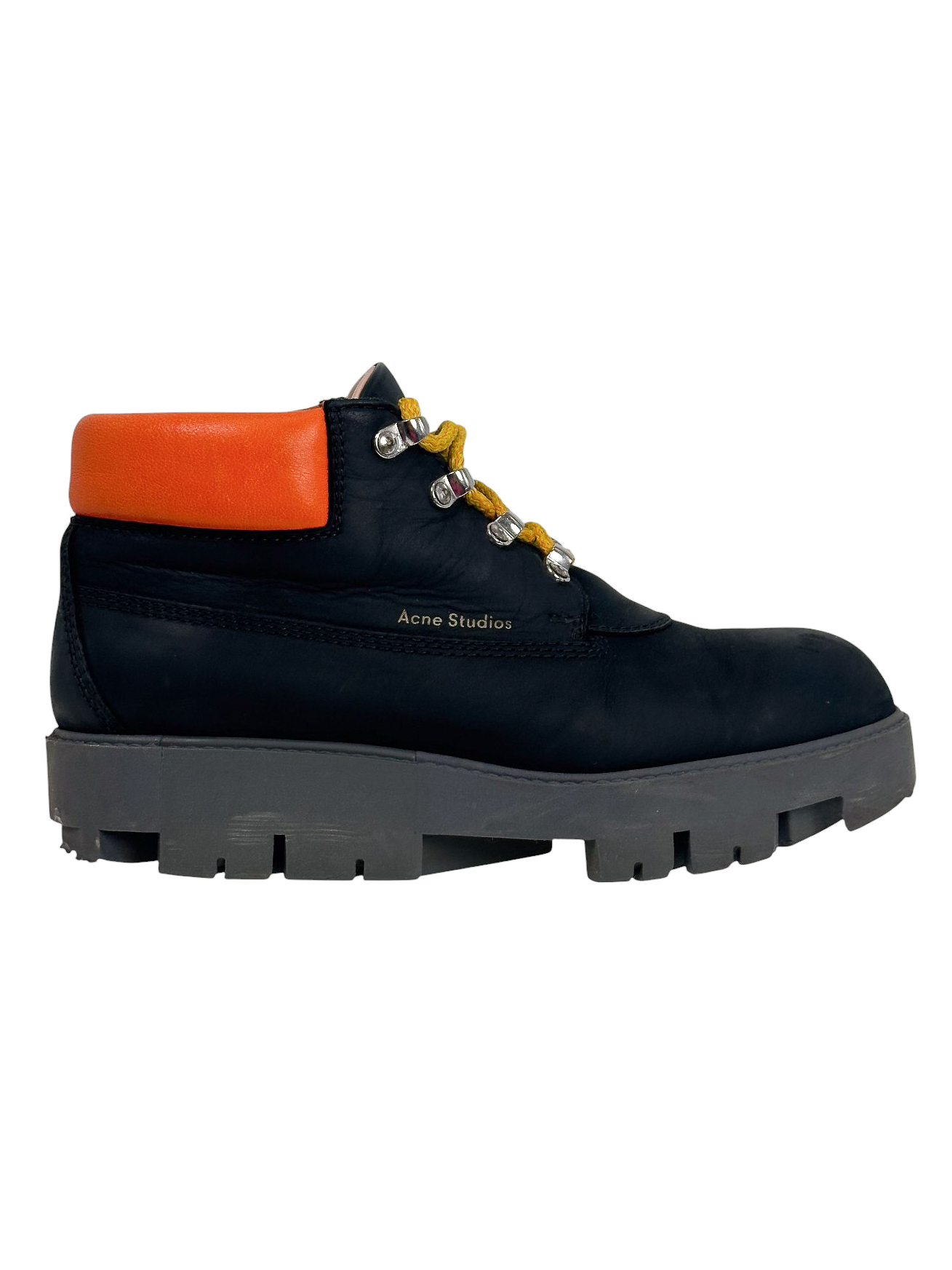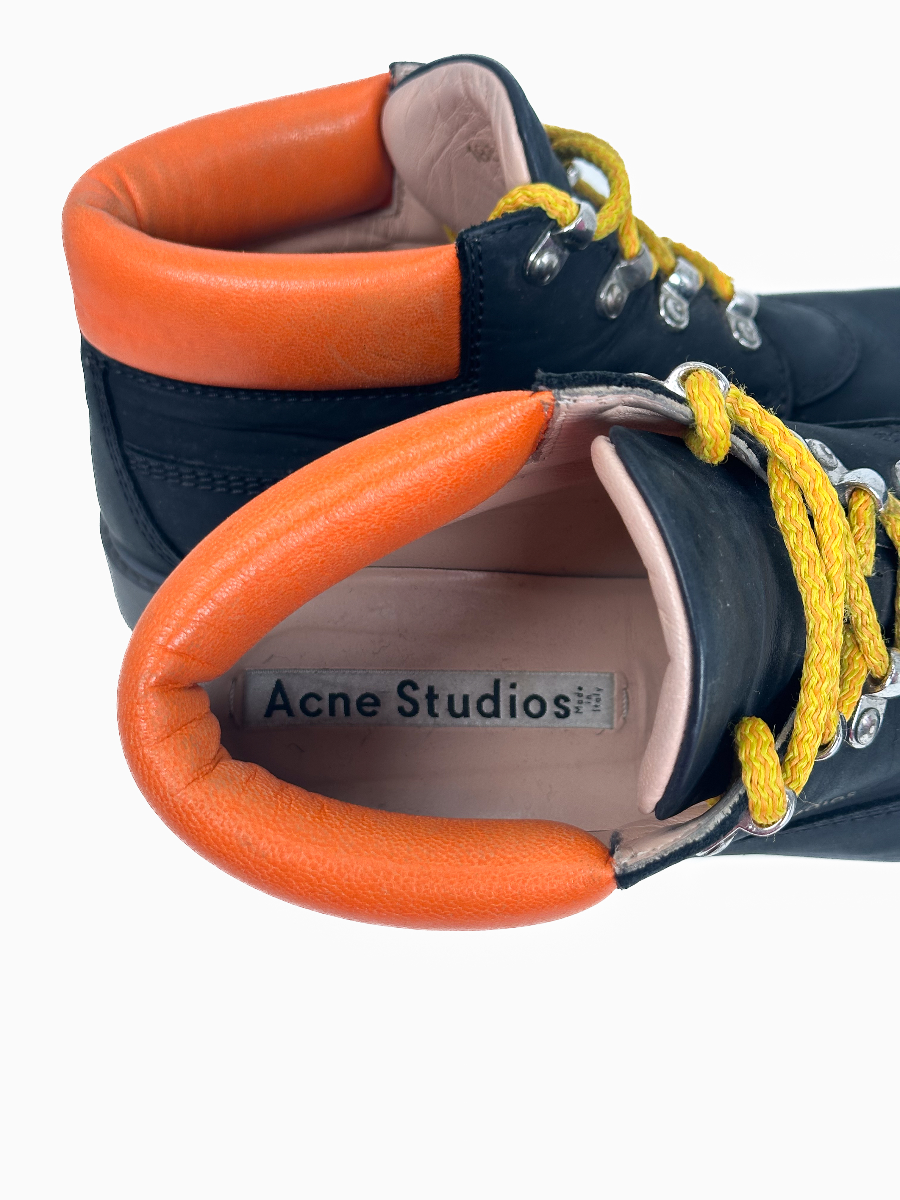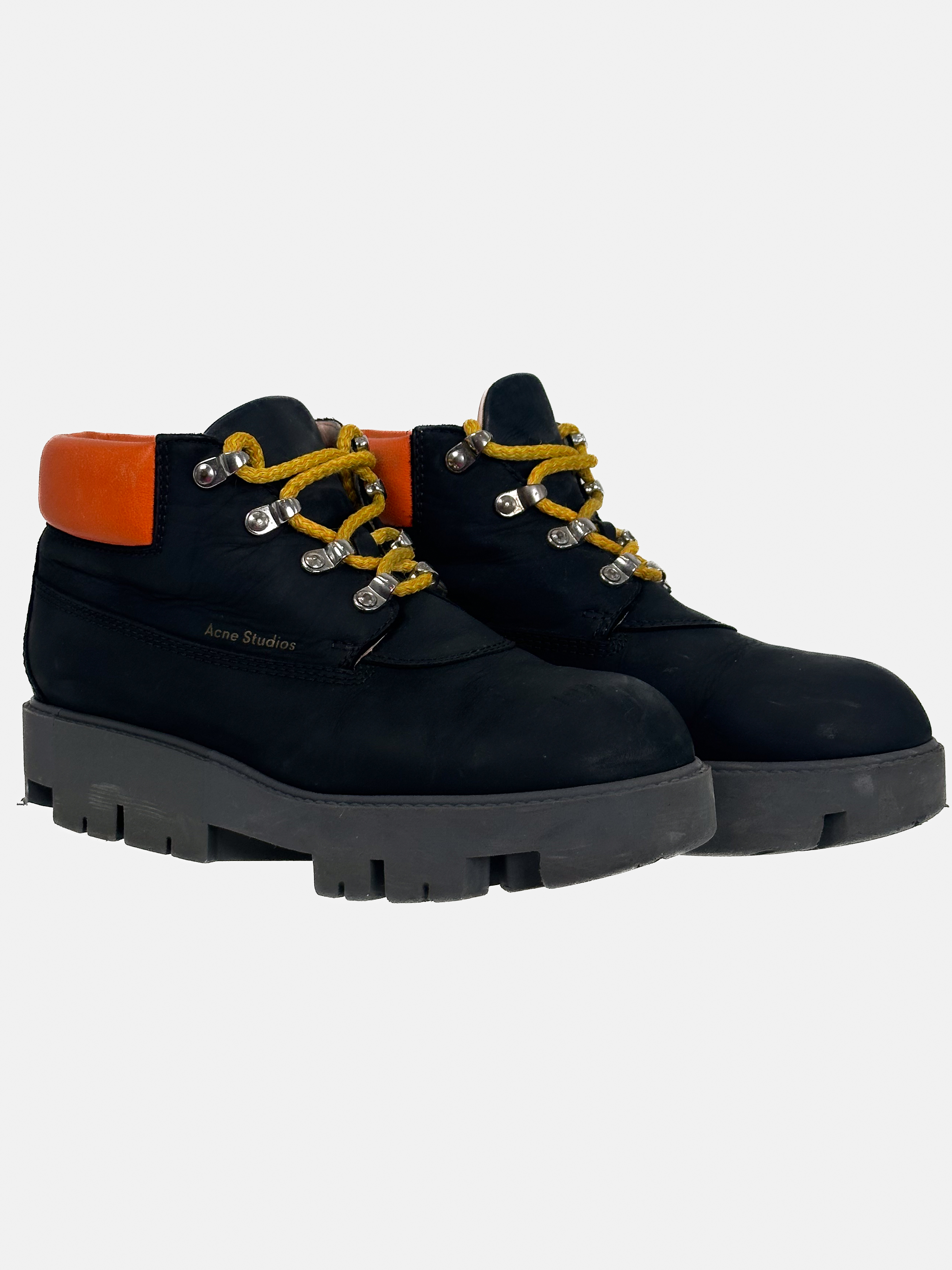 "Granatowe trapery, wiązane na żółte sznurówki, skórzana zapiętka w kolorze pomarańczowym, delikatne logo marki w bocznej części, zaokrąglone noski. Rozmiar 39. Stan bardzo dobry, delikatne przetarcia na podeszwie oraz marszczenia na skórze."