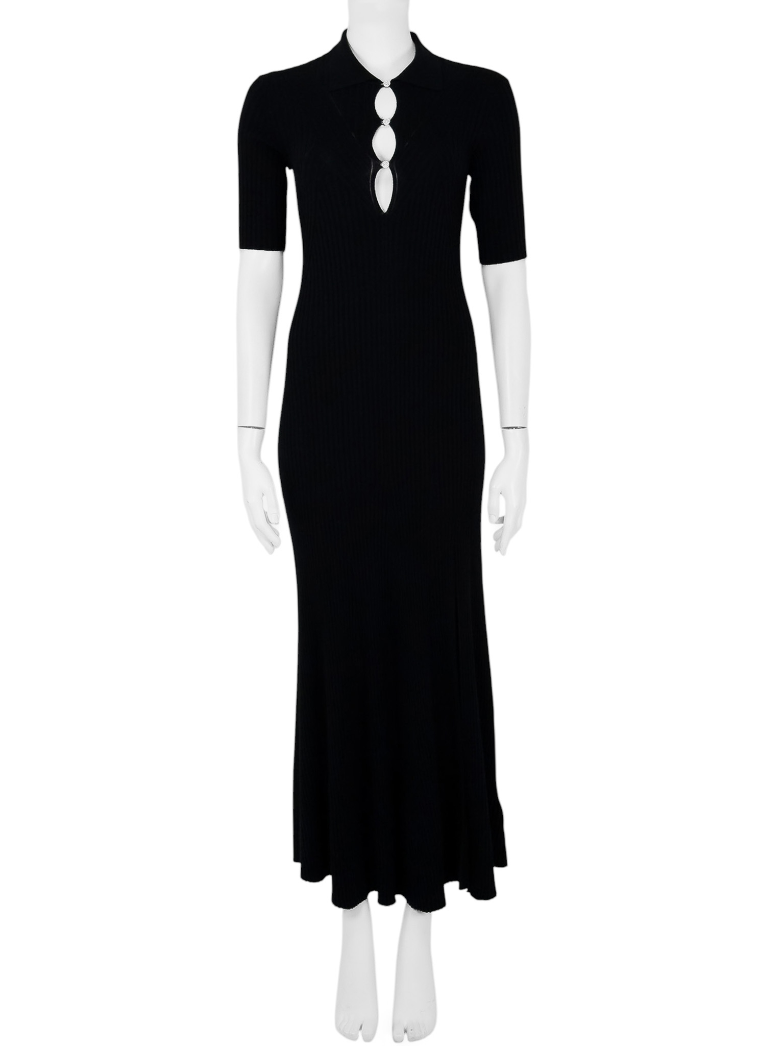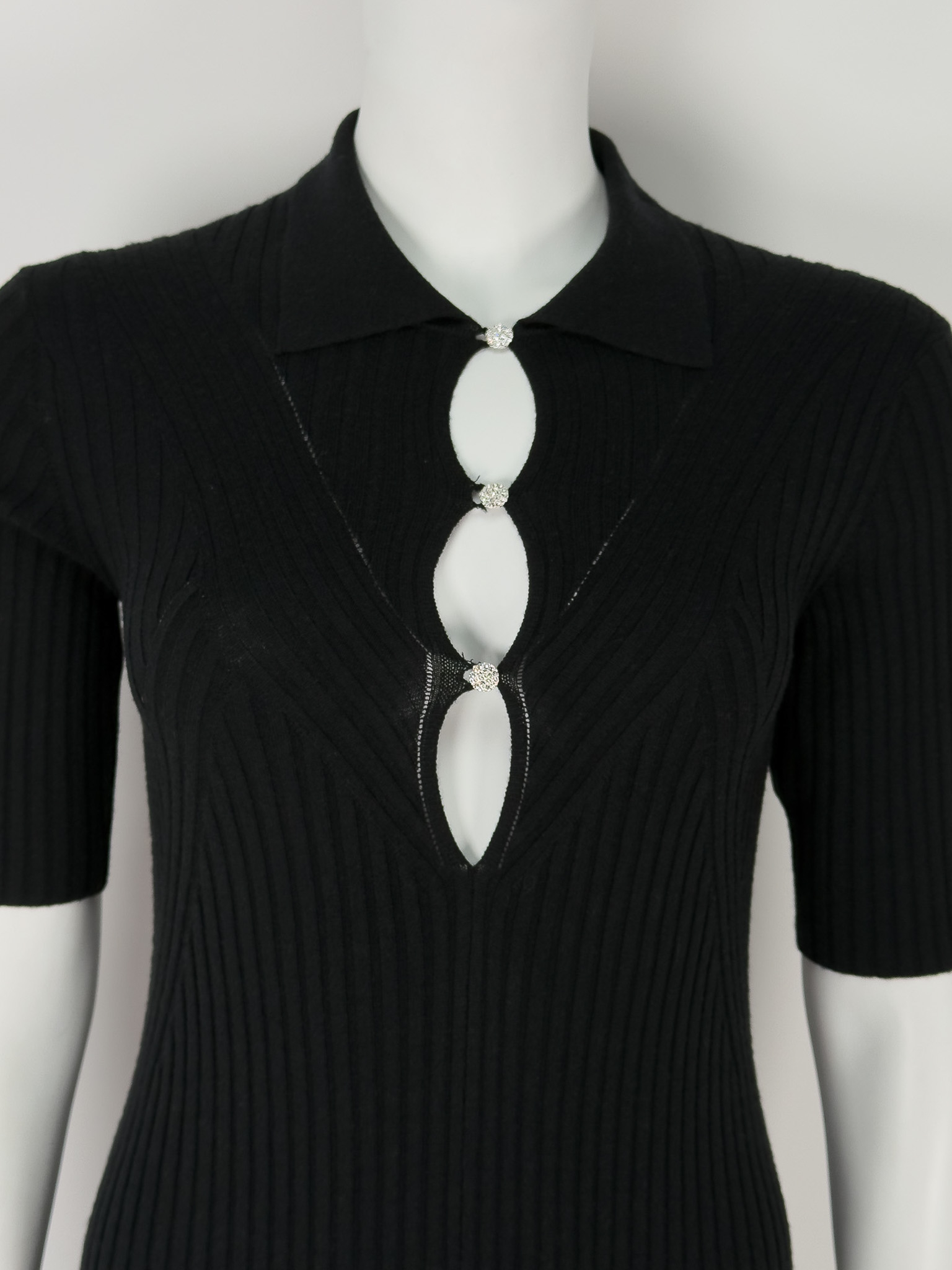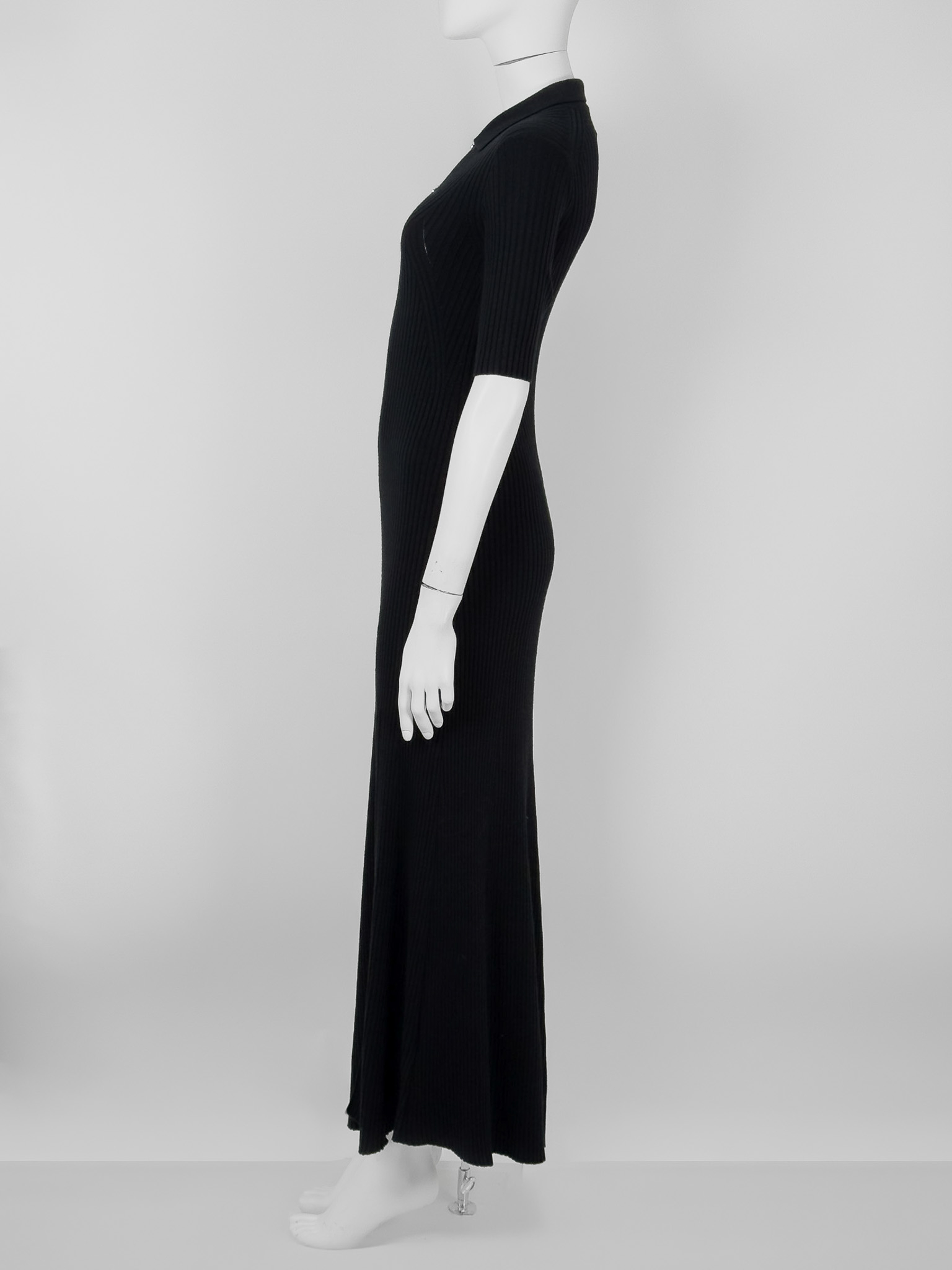 "Czarna wełniana długa prążkowana sukienka z krótkim rękawem, z przodu trzy odpinane guziki wysadzane cyrkoniami, ozdobne wycięcia, rozcięcie na przodzie. Stan nowa z metką. Skład: 90% wełna z merynosów, 10% poliester. Rozmiar z metki S. Wymiary: szerokość mierzona od pachy do pachy 36cm, długość całkowita 145cm."