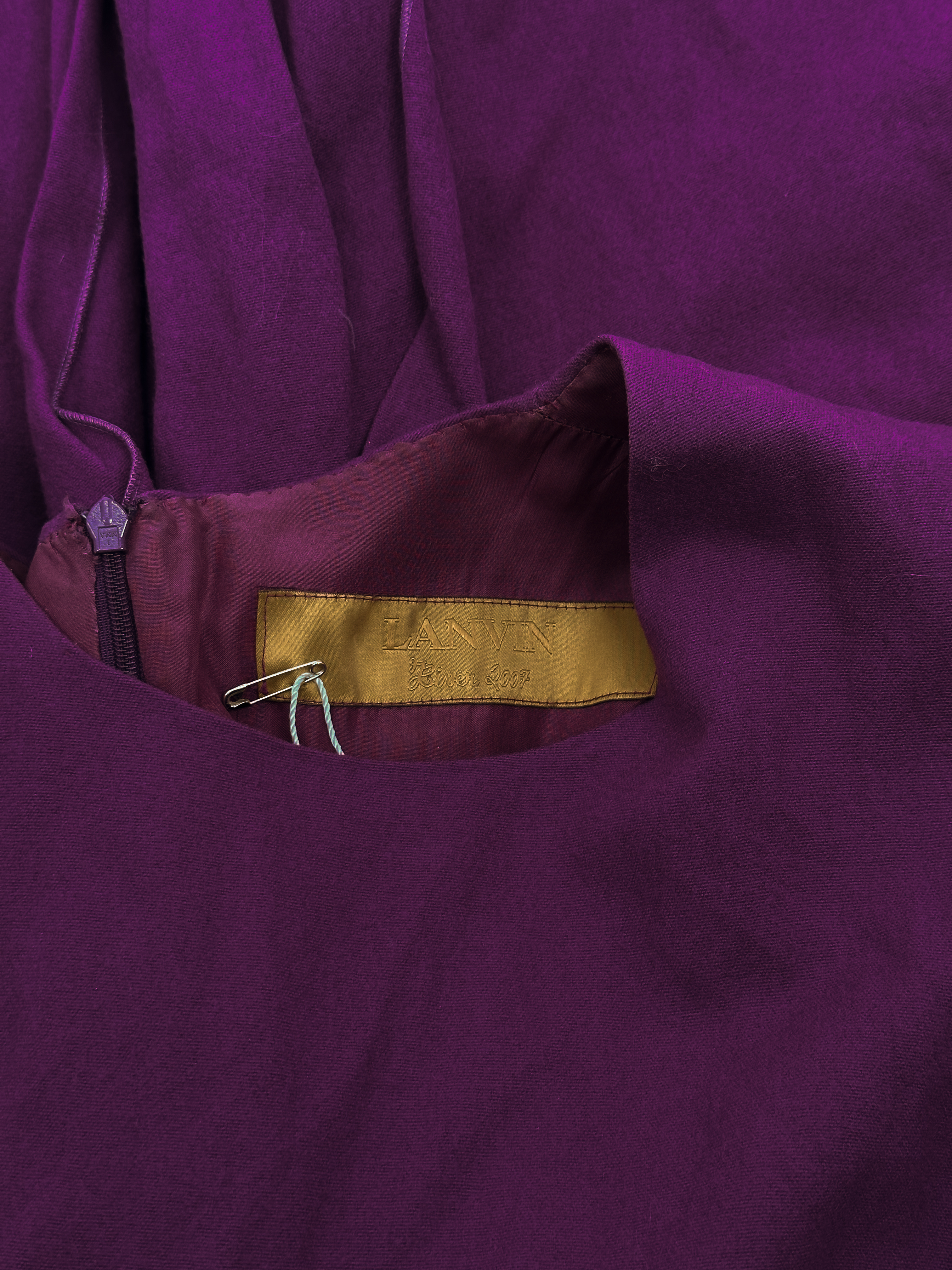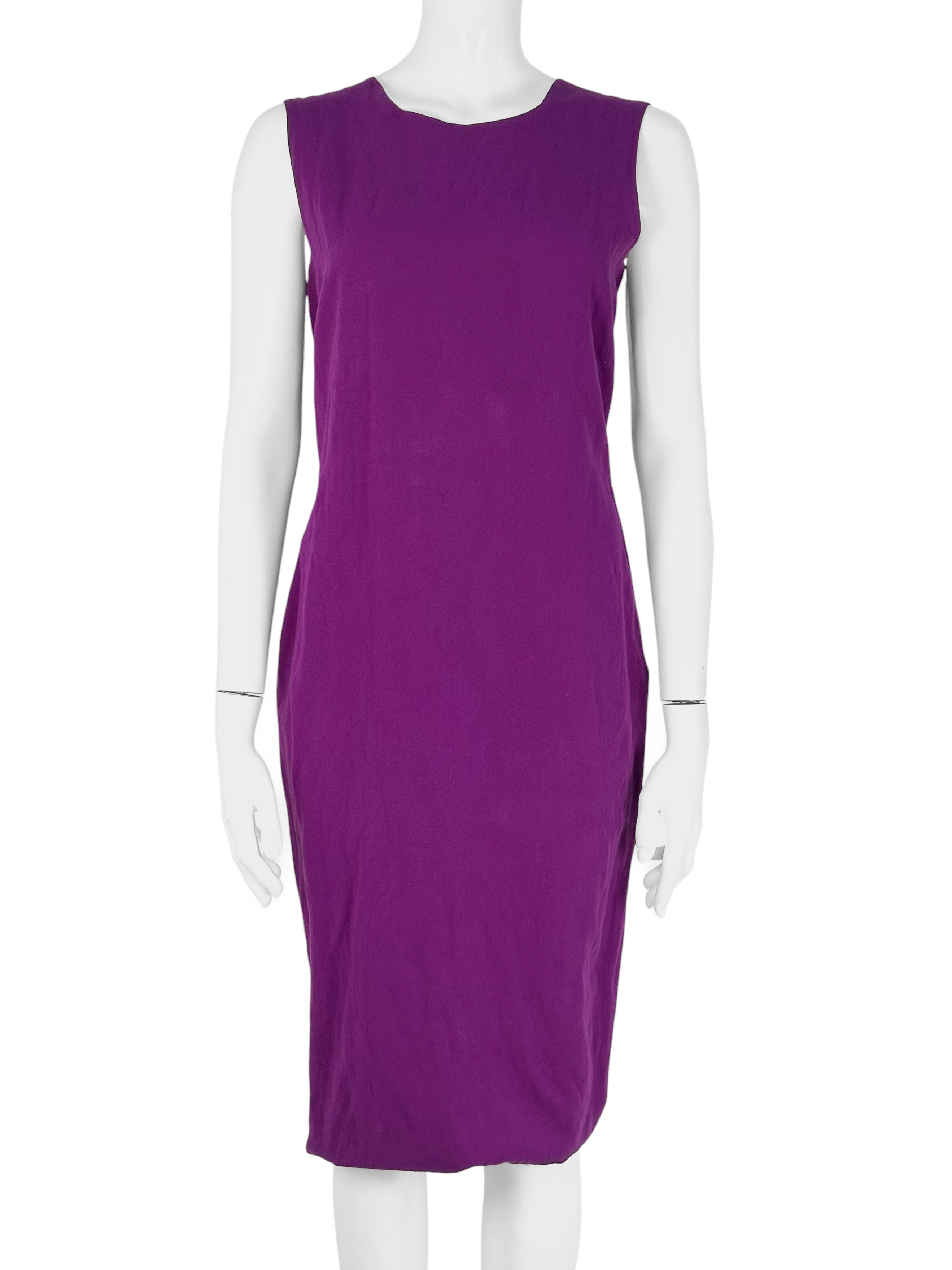 "Fioletowa wełniana sukienka, bez rękawów, asymetryczna, długość midi, ozdobiona falbaną w tylnej części, zapinana na kryty suwak oraz zatrzask. Stan bardzo dobry. Rozmiar z metki FR 40. Skład: 96% wełna, 4% metal; podszewka: 100% jedwab. Wymiary: szerokość mierzona od pachy do pachy 48cm, długość całkowita 106cm."