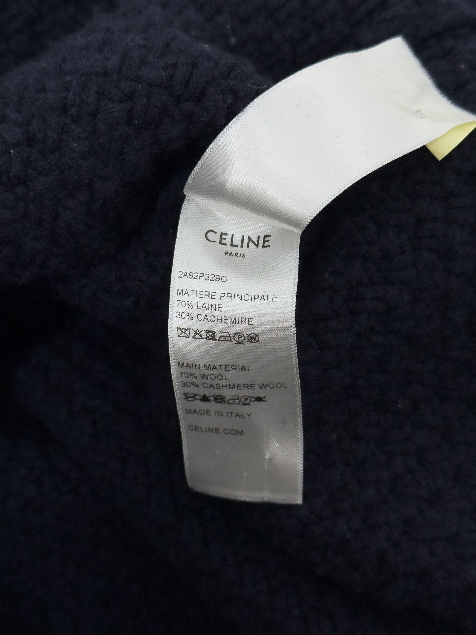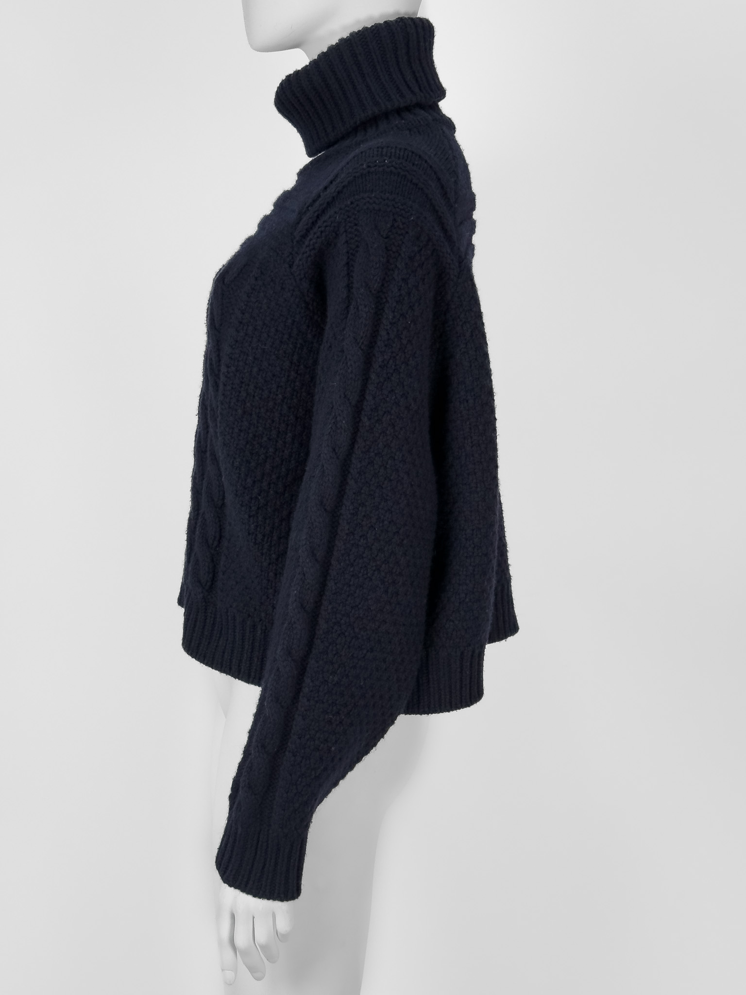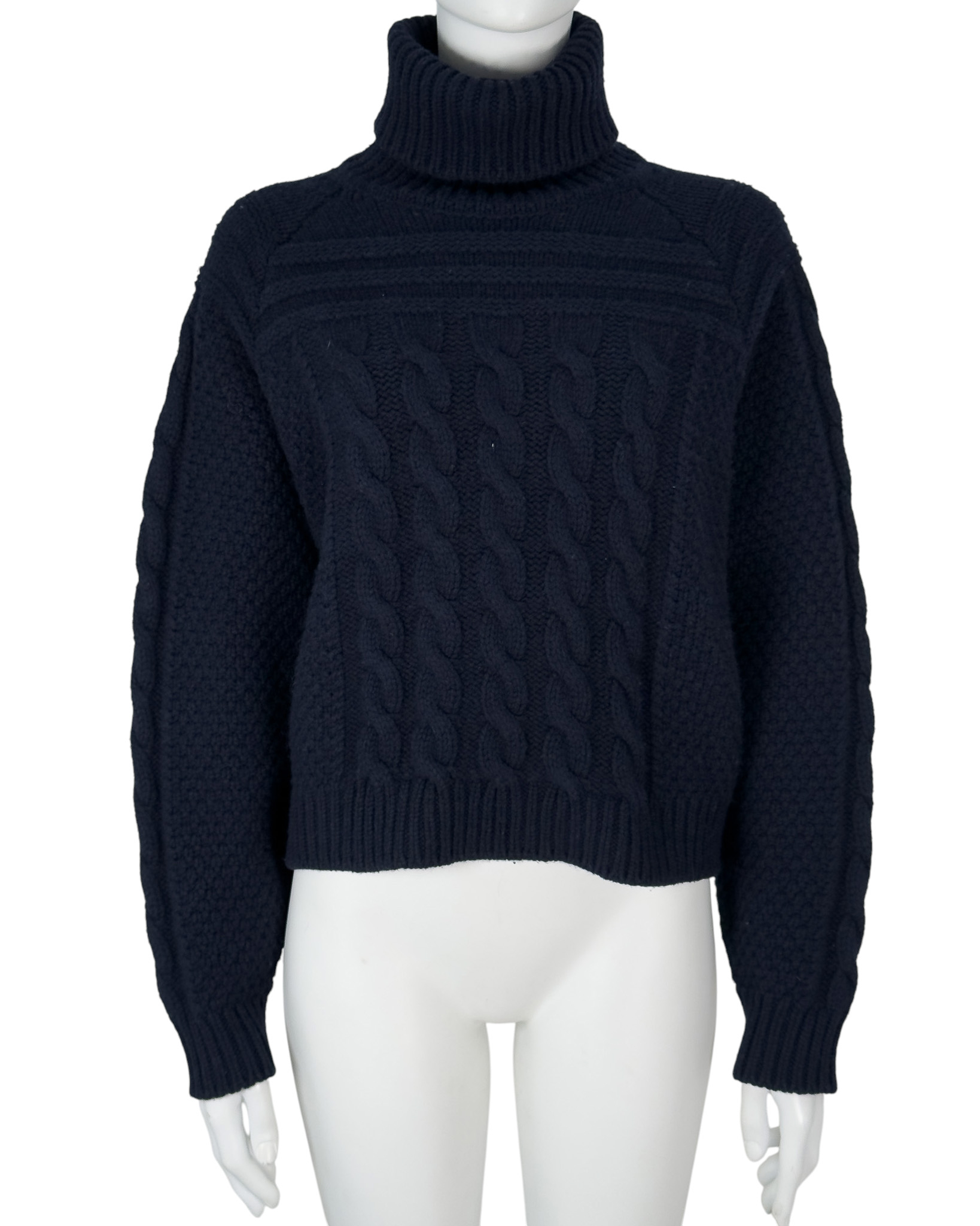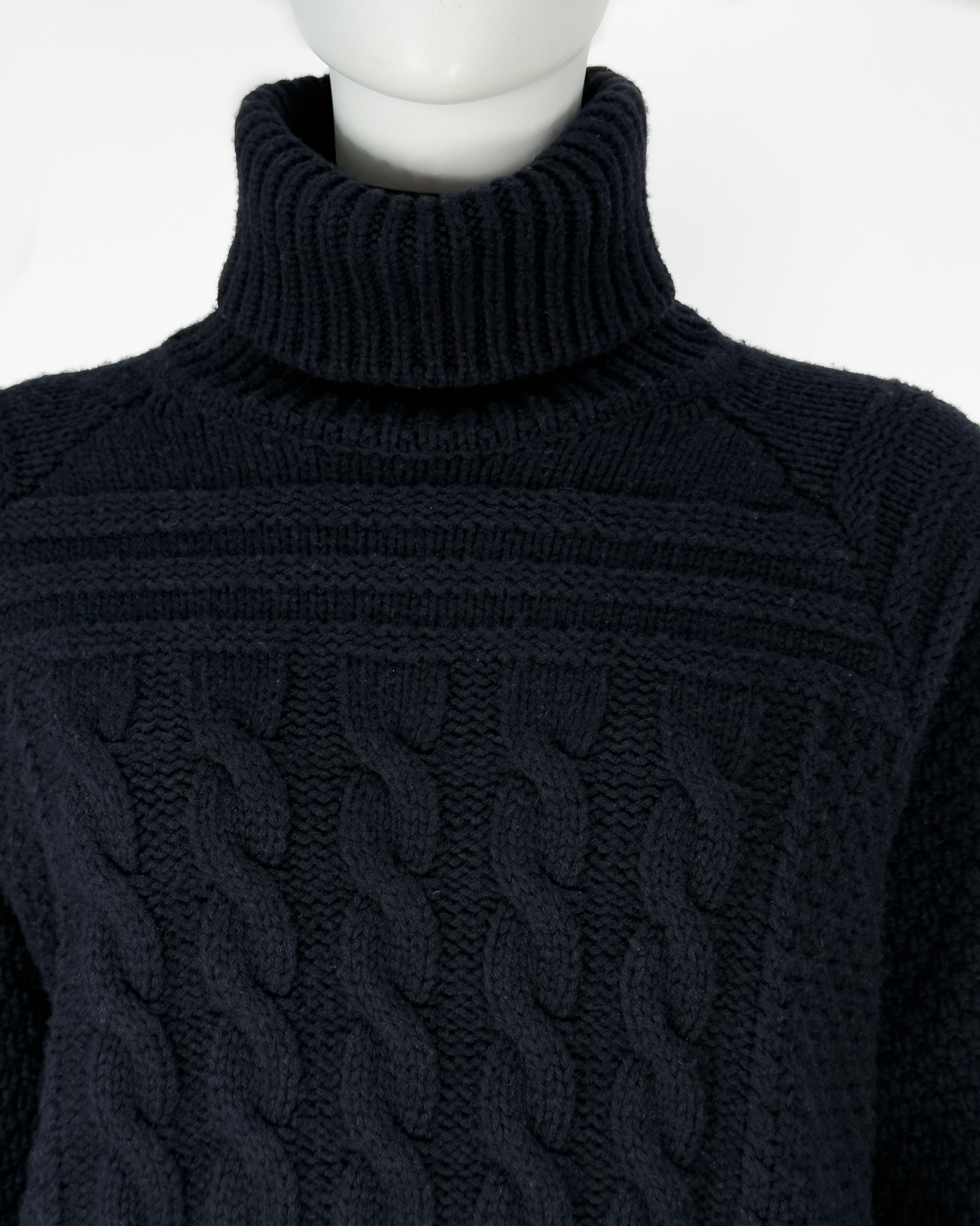 "Granatowy wełniano-kaszmirowy sweter z golfem, ozdobiony warkoczowym splotem na przodzie, krój oversize, wykończony prążkowanym ściągaczem. Stan bardzo dobry. Rozmiar z metki M. Skład: 70% wełna, 30% kaszmir. Wymiary: szerokość mierzona od pachy do pachy 73cm, długość całkowita 52cm."