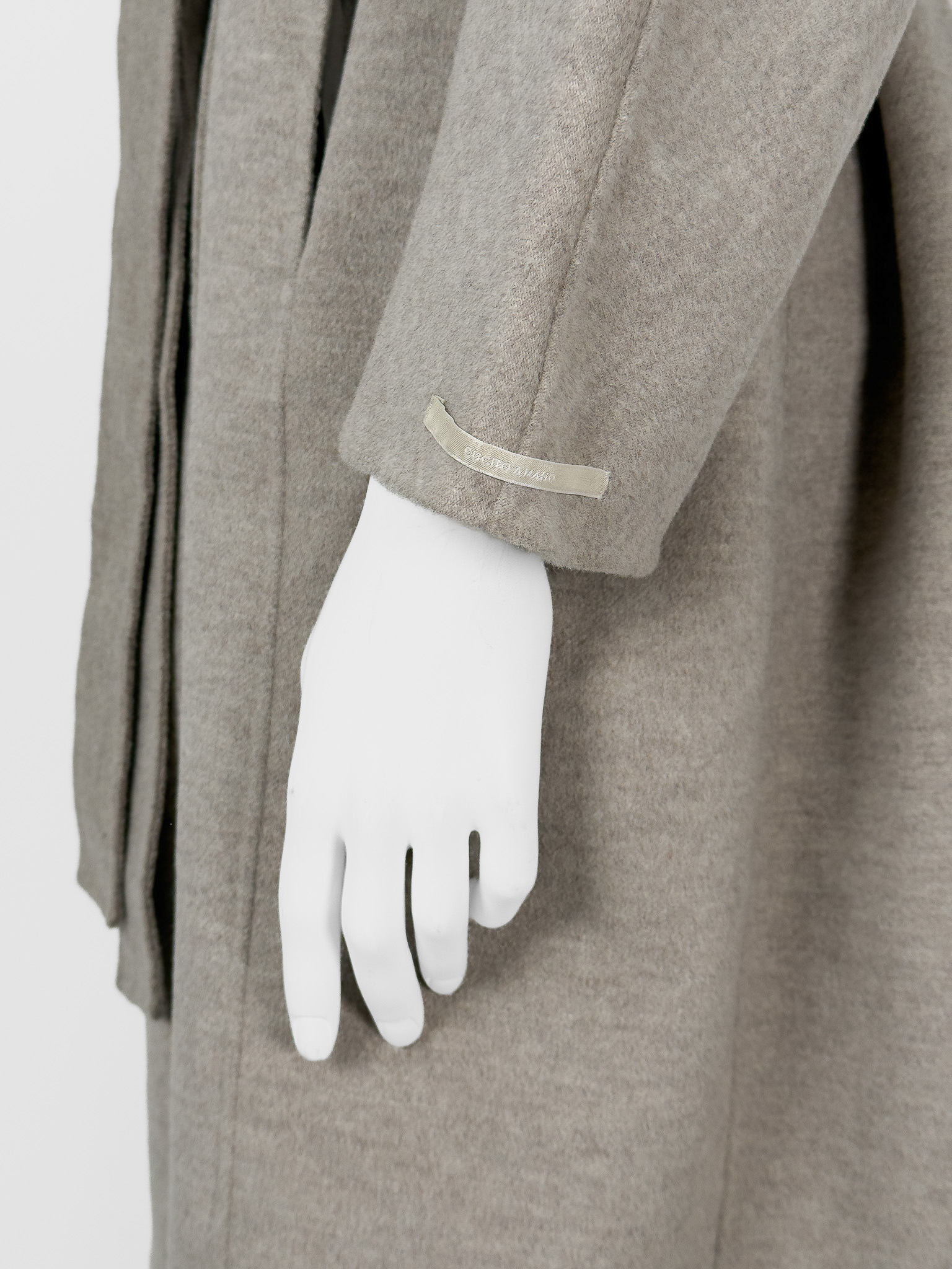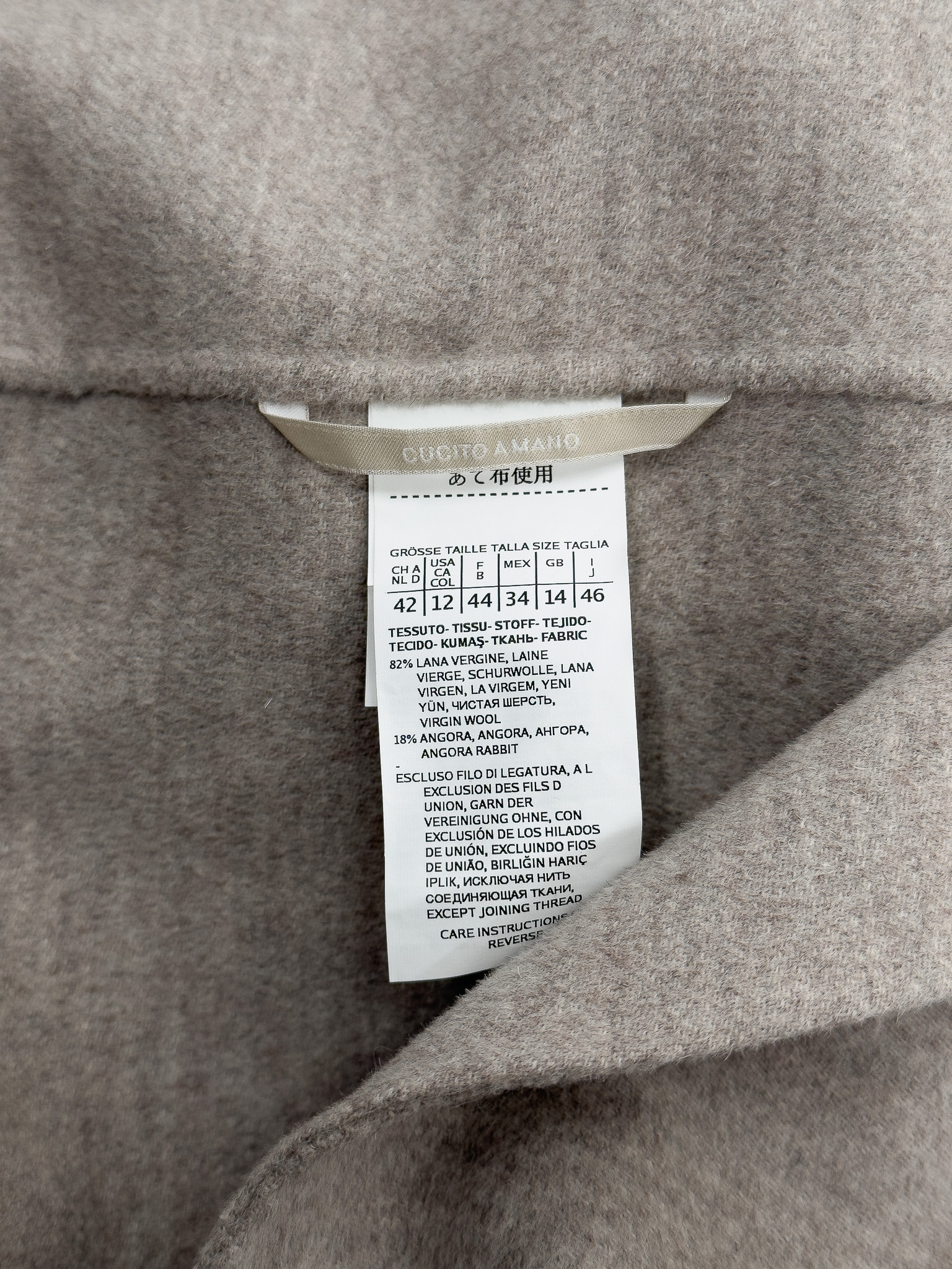 "Cienki wełniany płaszcz w kolorze szarobeżowym, bez poszewki, wiązany paskiem w talii, dwie kryte kieszenie w bocznej części. Stan bardzo dobry. Rozmiar z metki IT 46. Skład: 82% wełna, 18% wełna z królika angorskiego. Wymiary: szerokość mierzona od pachy do pachy 57cm, długość całkowita 115cm."