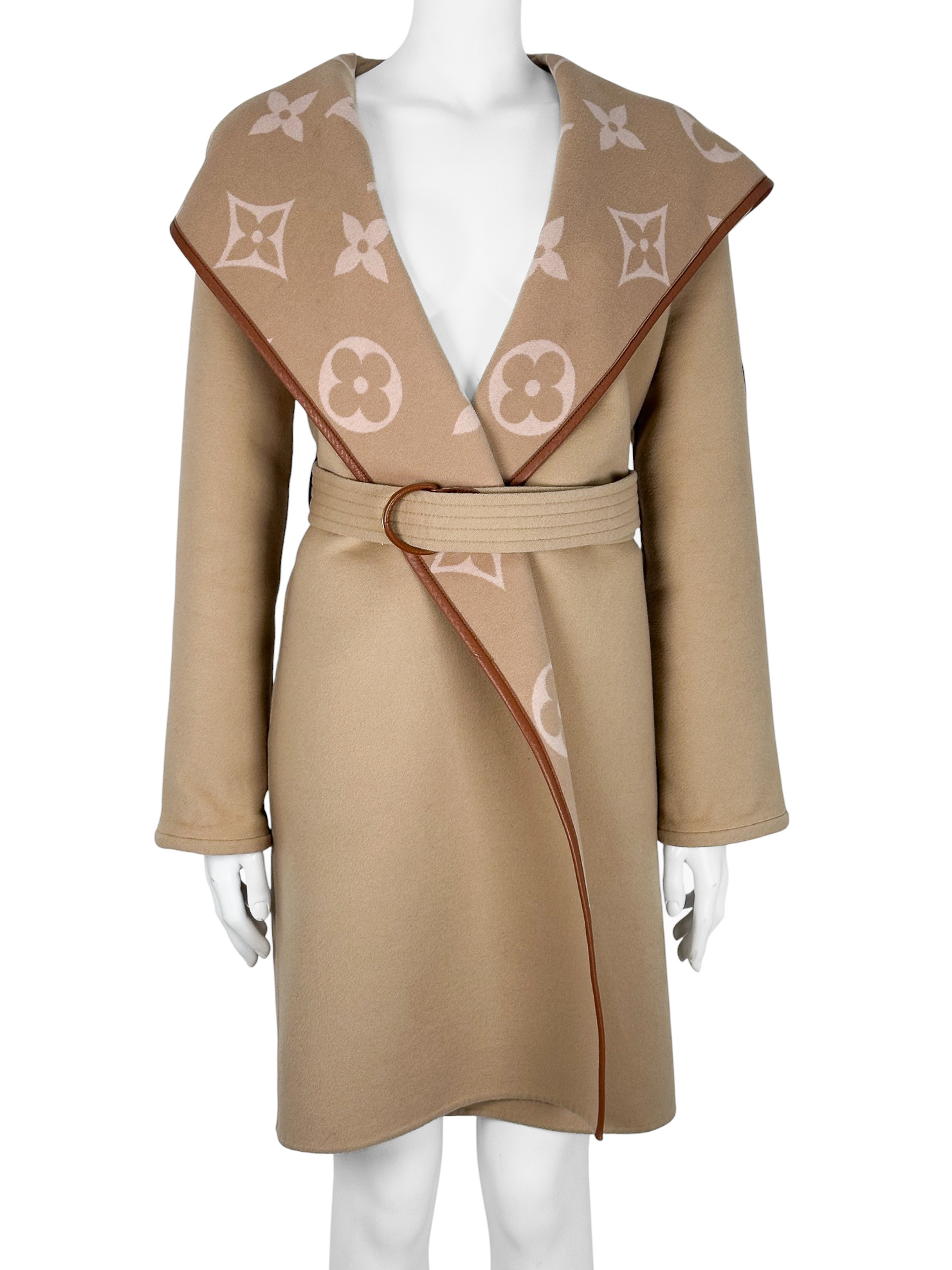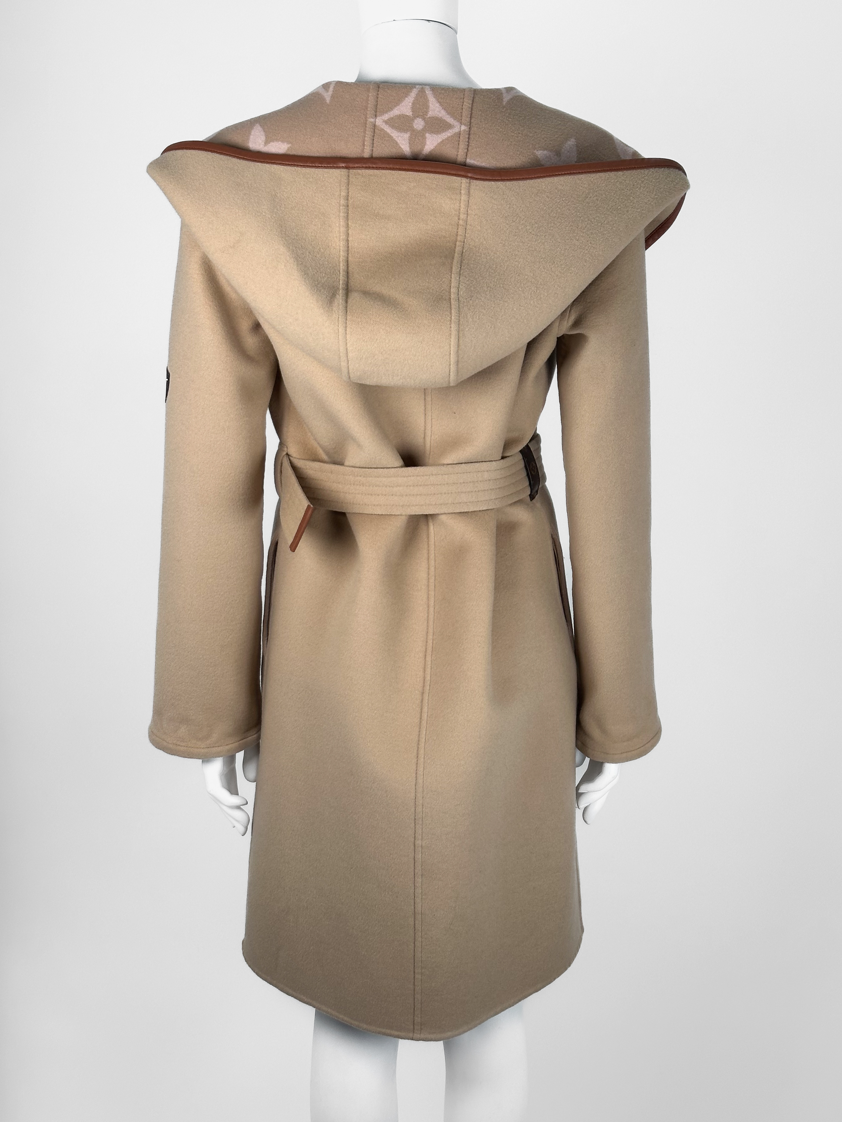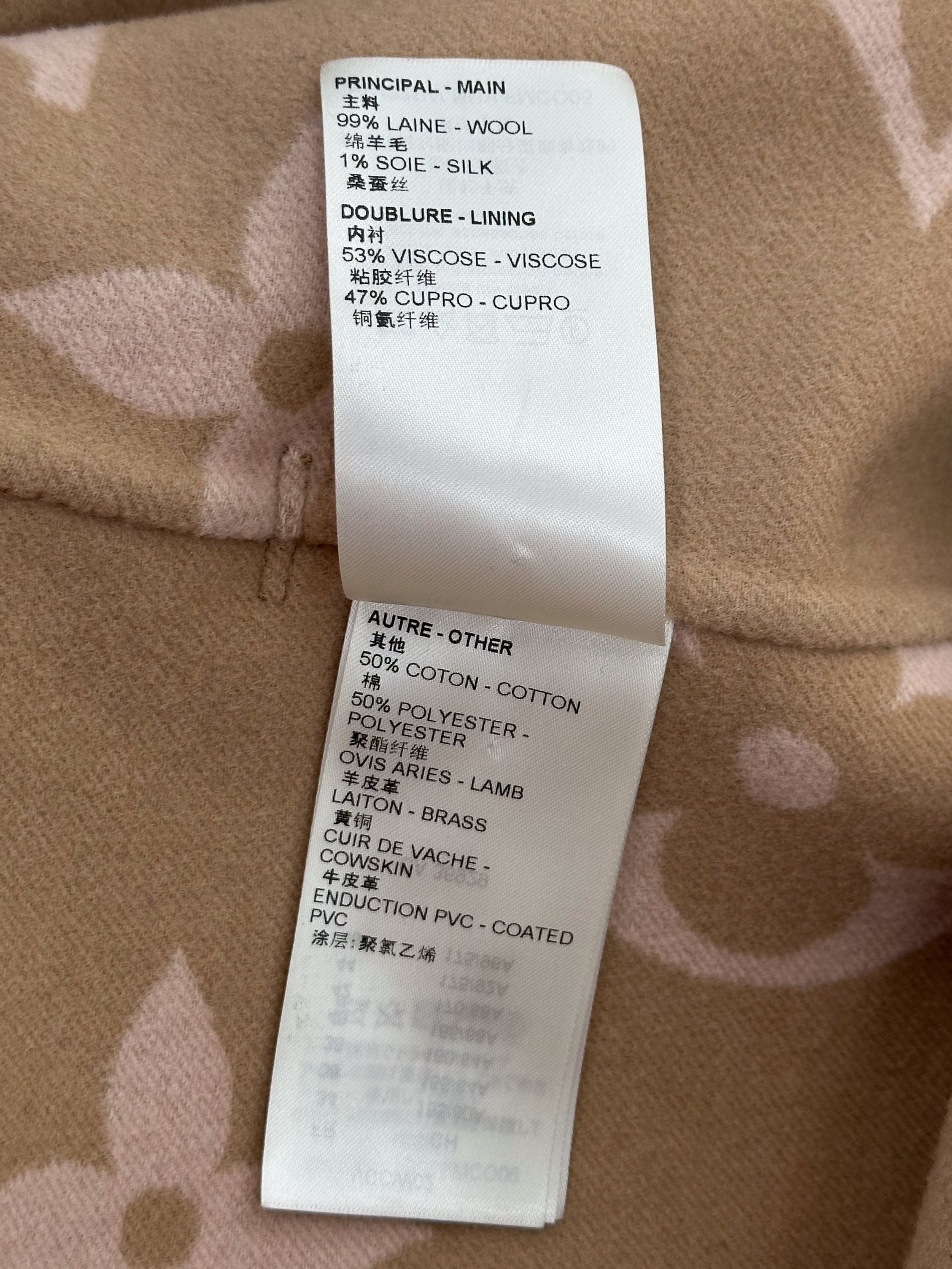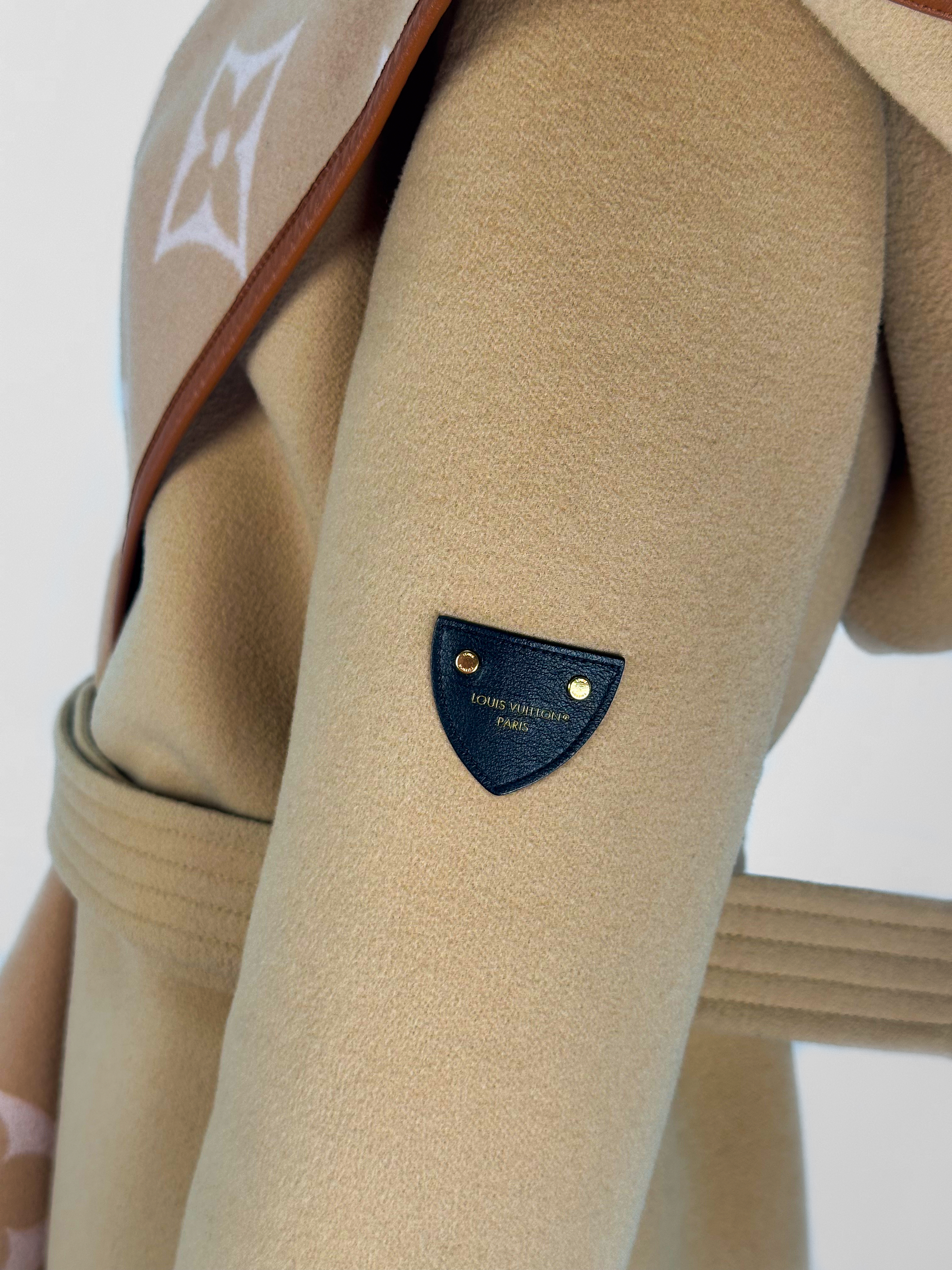 "Camelowy wełniany płaszcz, logowanie od wewnętrznej strony, skórzane camelowe wykończenia. Skład: 99% wełna, 1% jedwab. Rozmiar z metki 34. Dwie dziury od wewnętrznej strony.