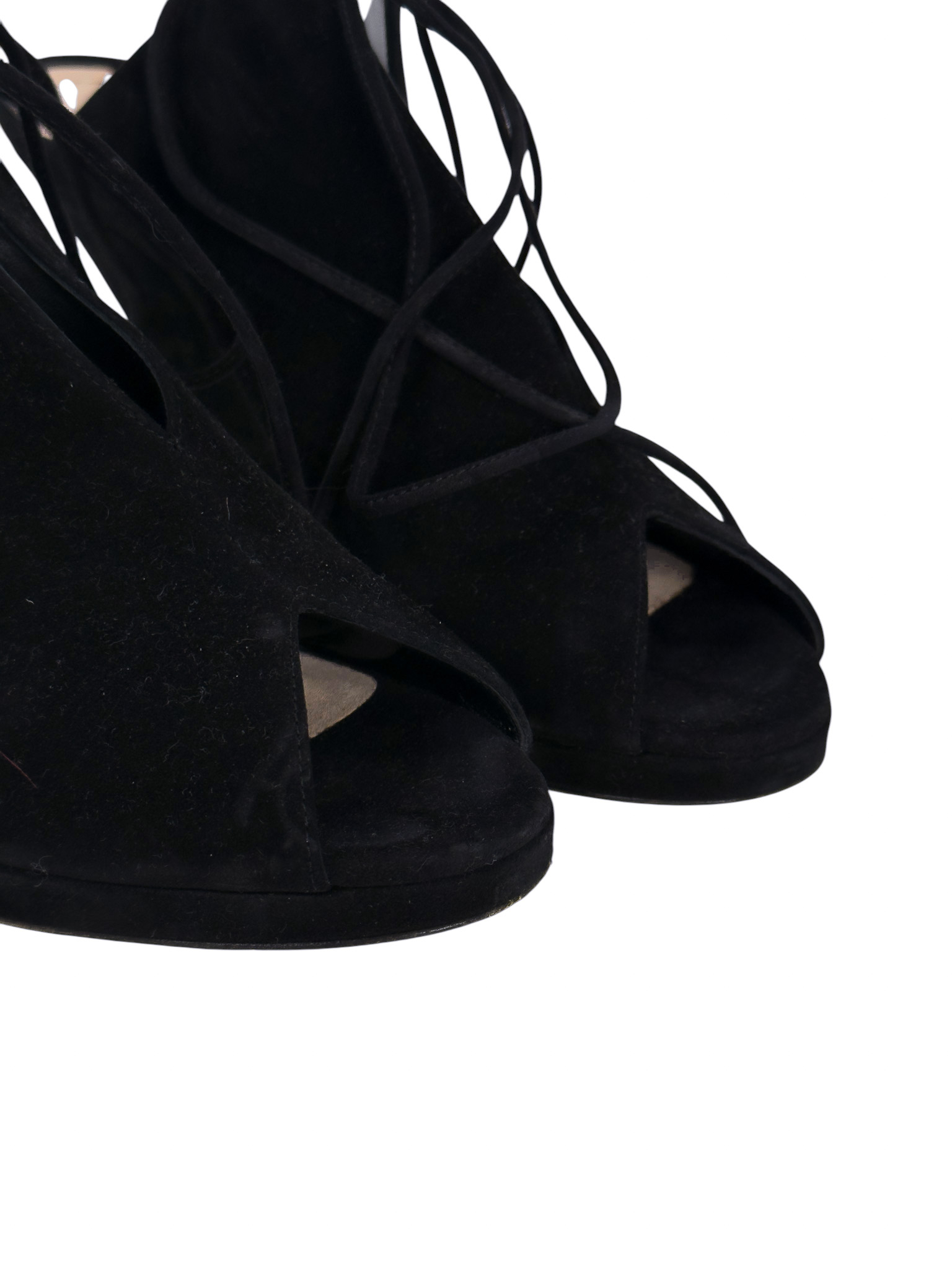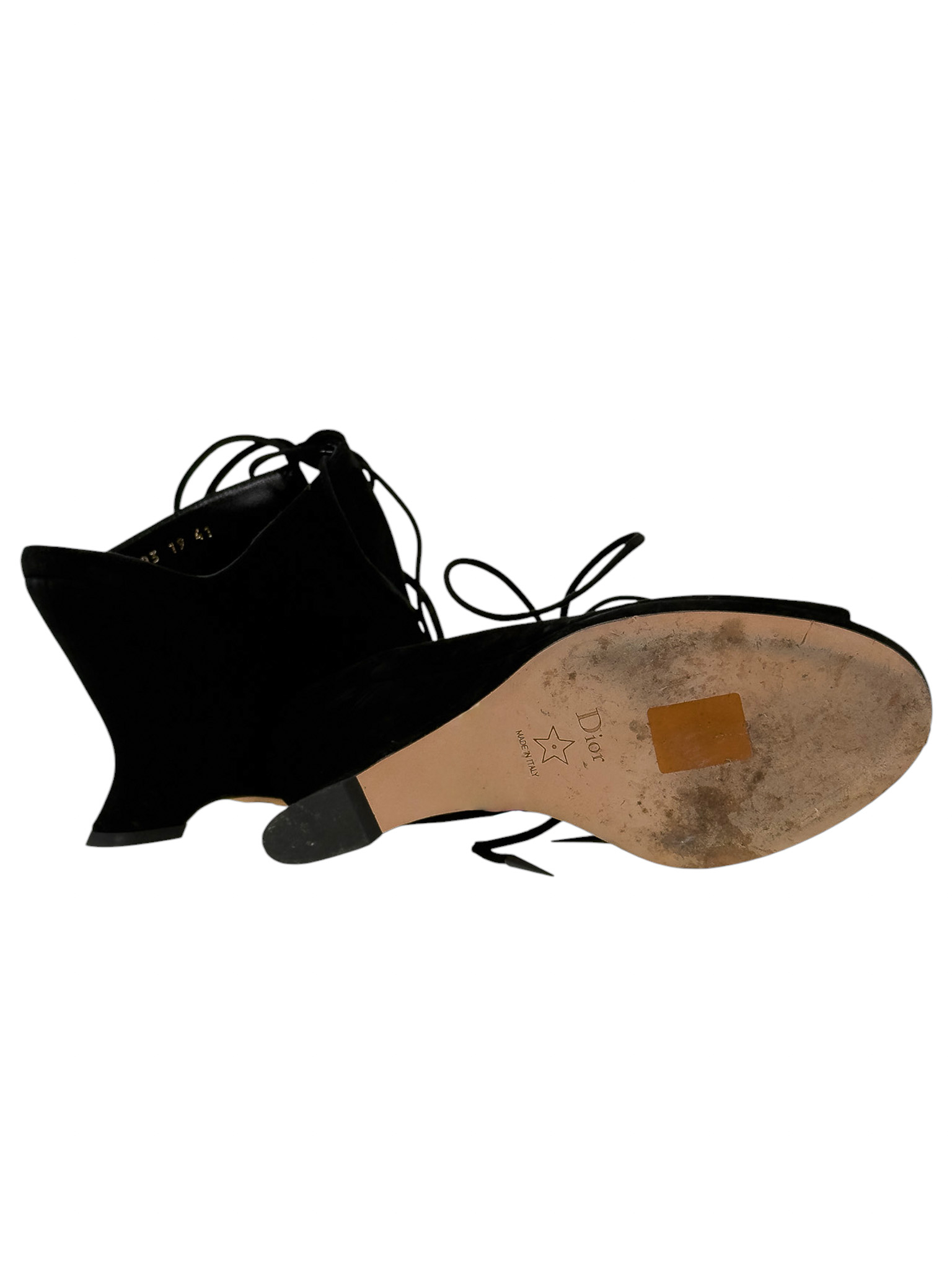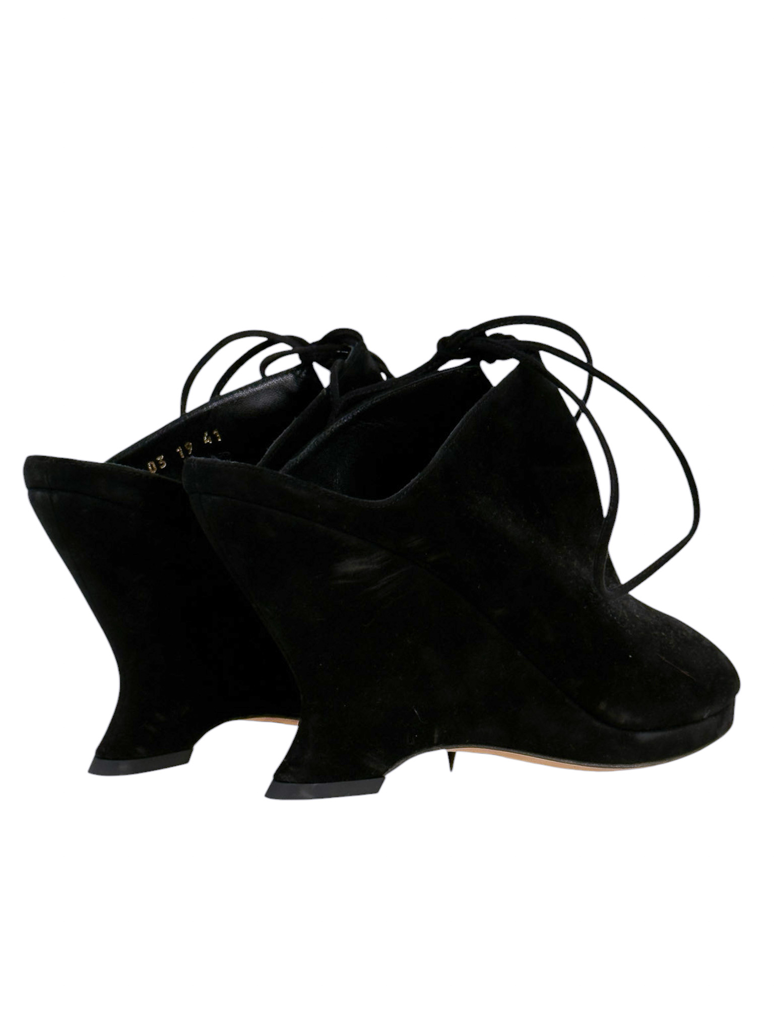 "Czarne zamszowe botki na koturnie, migdałowe wycięte noski, wiązane na przodzie, odkryta pięta, skórzana cielista wkładka. Stan bardzo dobry, przetarcia na podeszwie oraz delikatne na skórze. Rozmiar 41, wysokość obcasa 10cm."