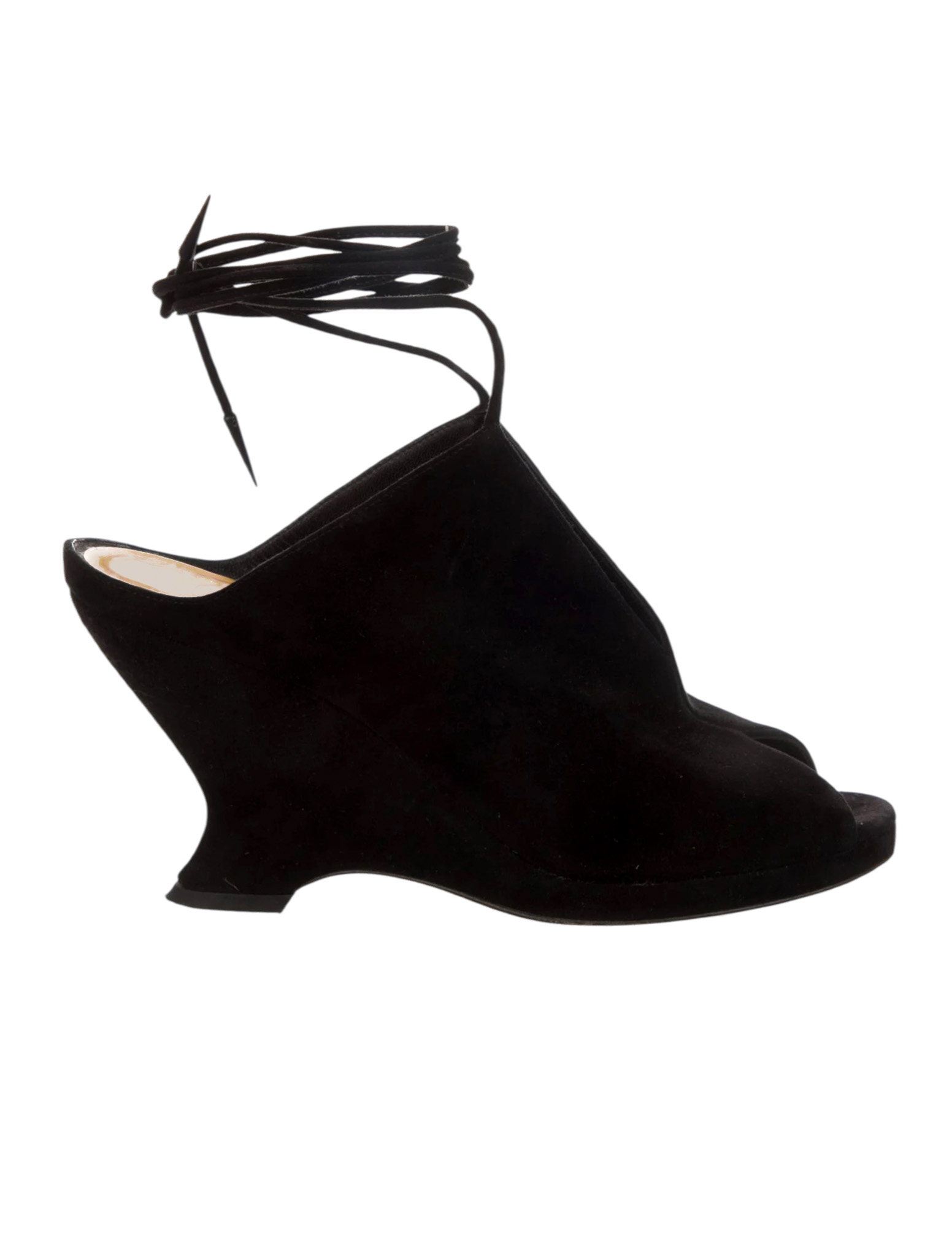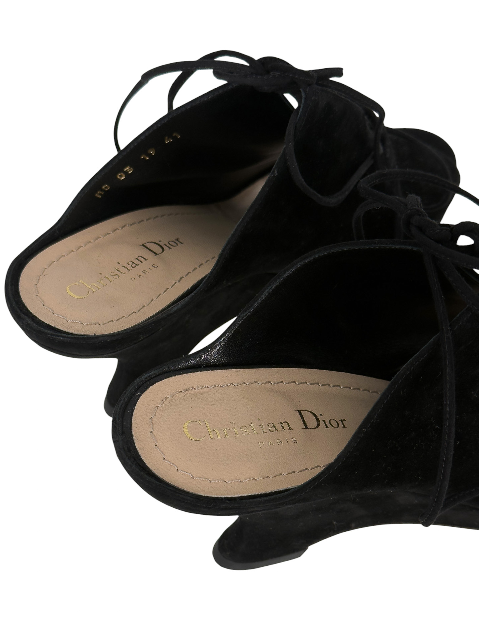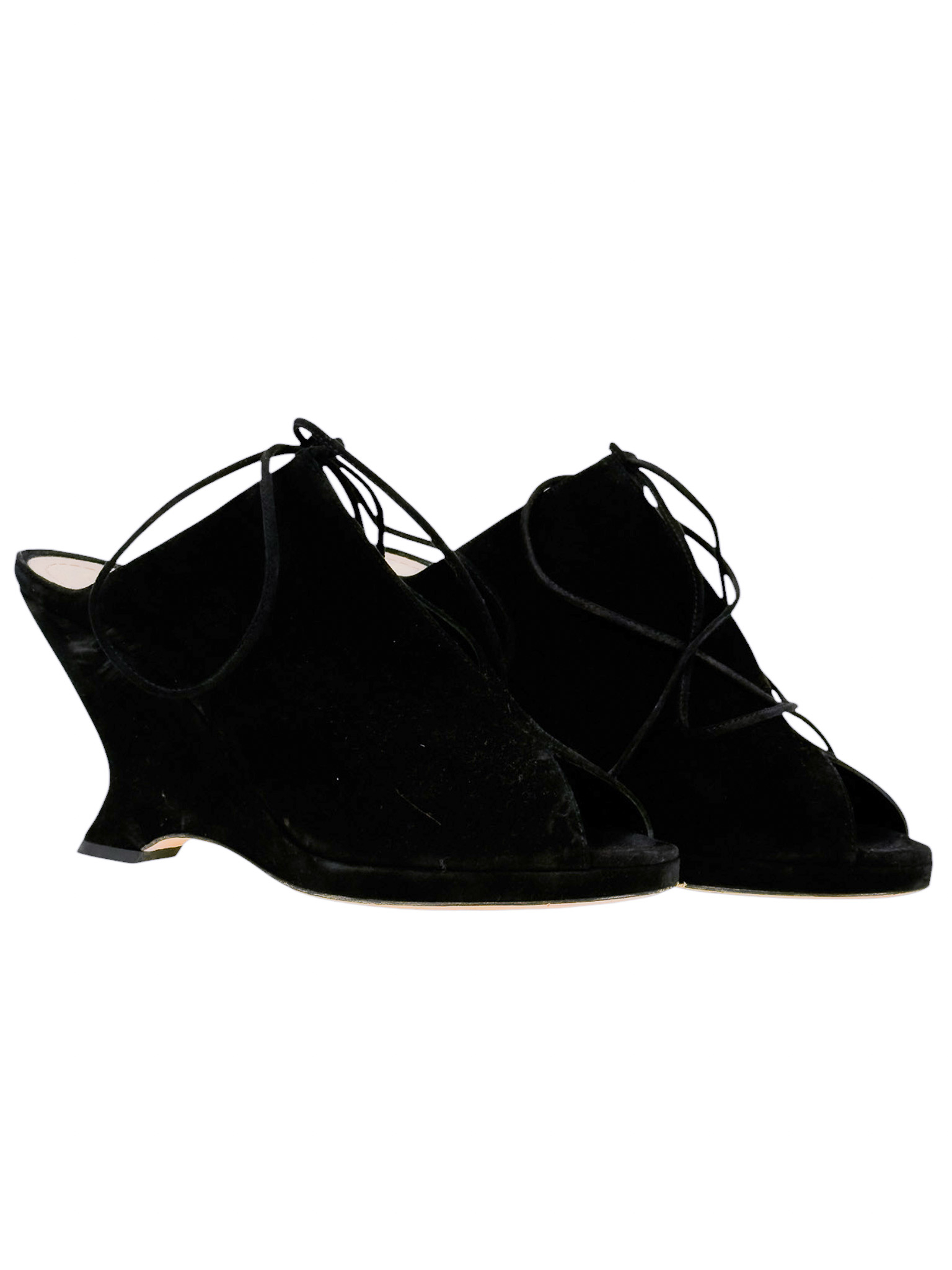 "Czarne zamszowe botki na koturnie, migdałowe wycięte noski, wiązane na przodzie, odkryta pięta, skórzana cielista wkładka. Stan bardzo dobry, przetarcia na podeszwie oraz delikatne na skórze. Rozmiar 41, wysokość obcasa 10cm."