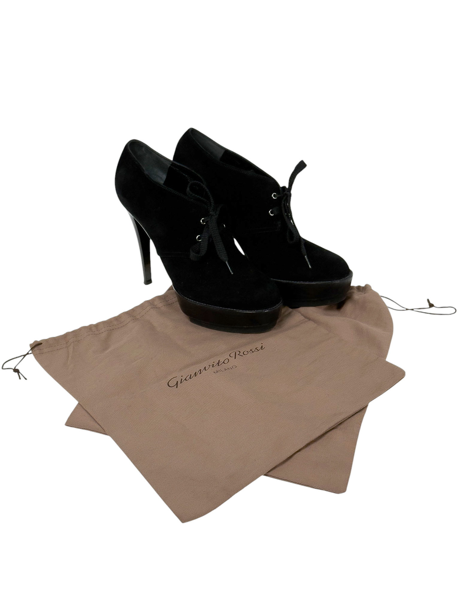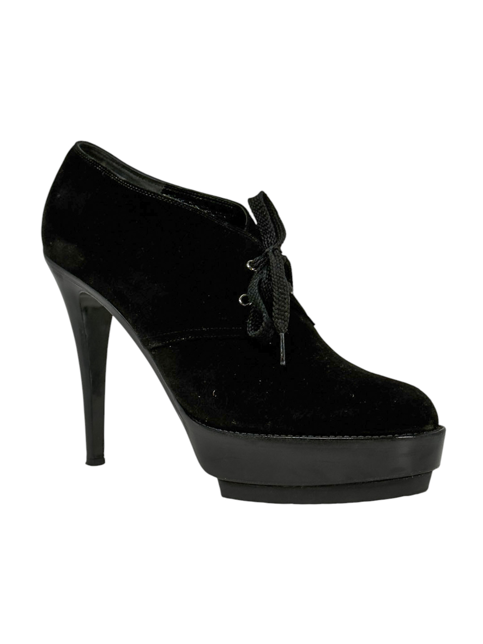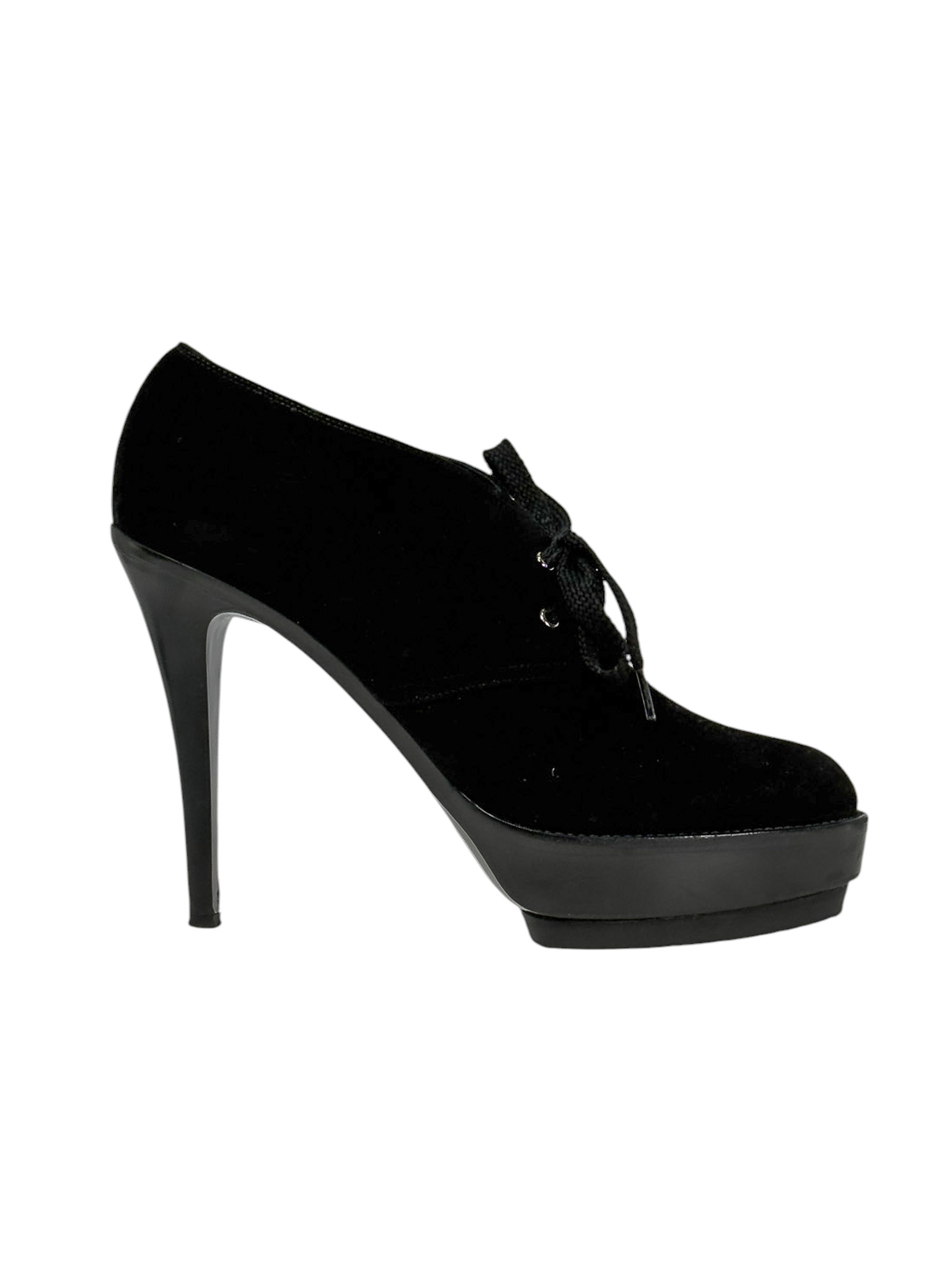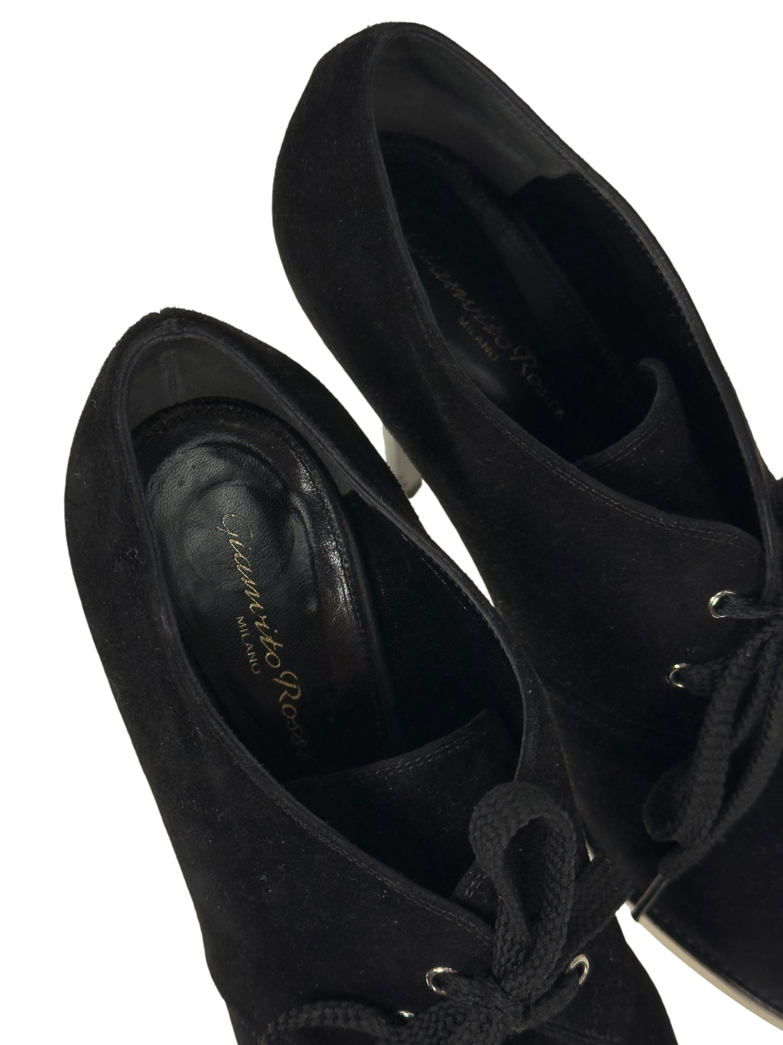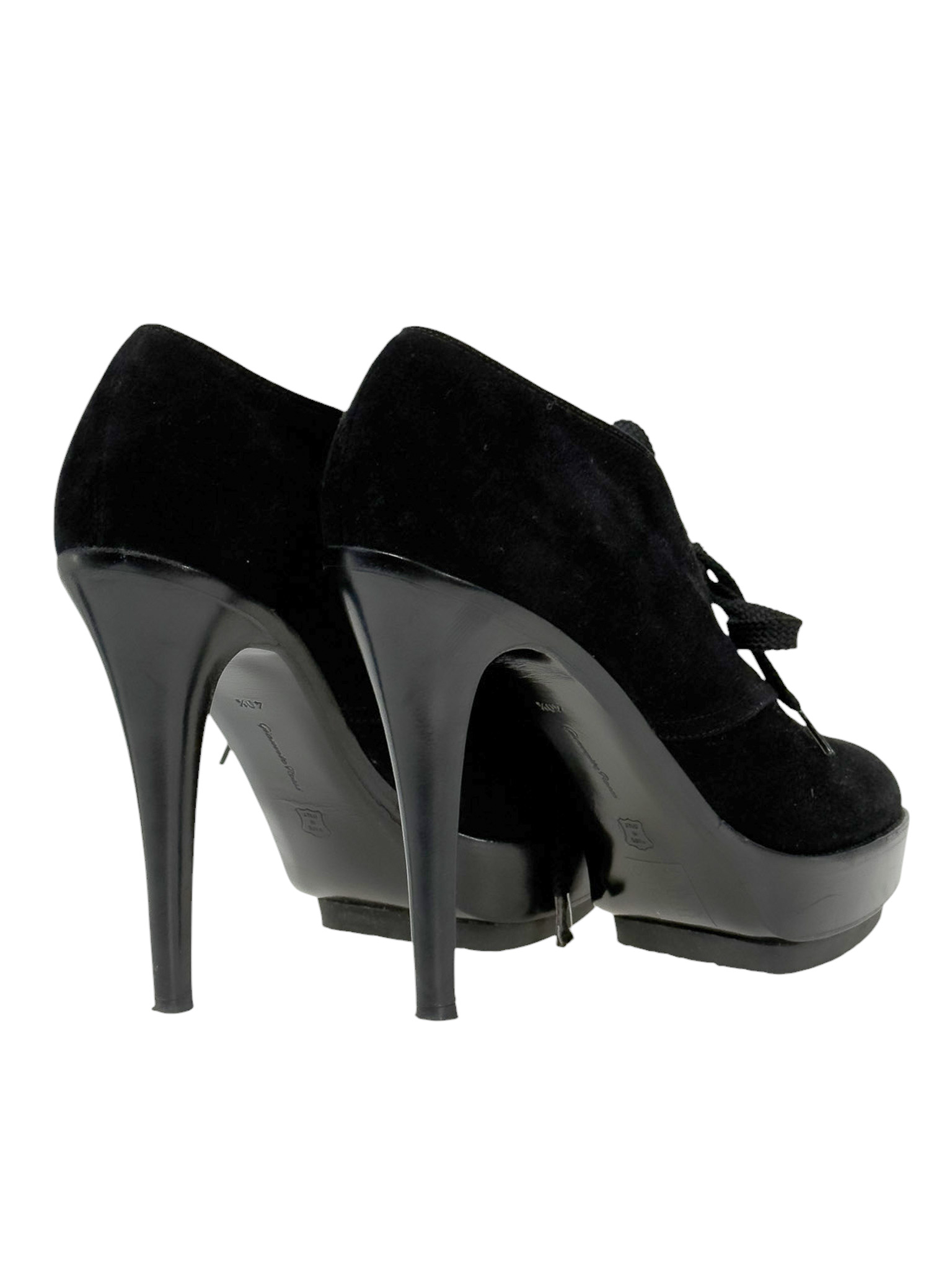 "Czarne zamszowe botki na obcasie oraz platformie, zaokrąglone noski, sznurowane, czarna skórzana wkładka, w zestawie z workami przeciwkurzowymi. Stan: bardzo dobry, posiadają widoczne przetarcia na flekach. Rozmiar 40,5."