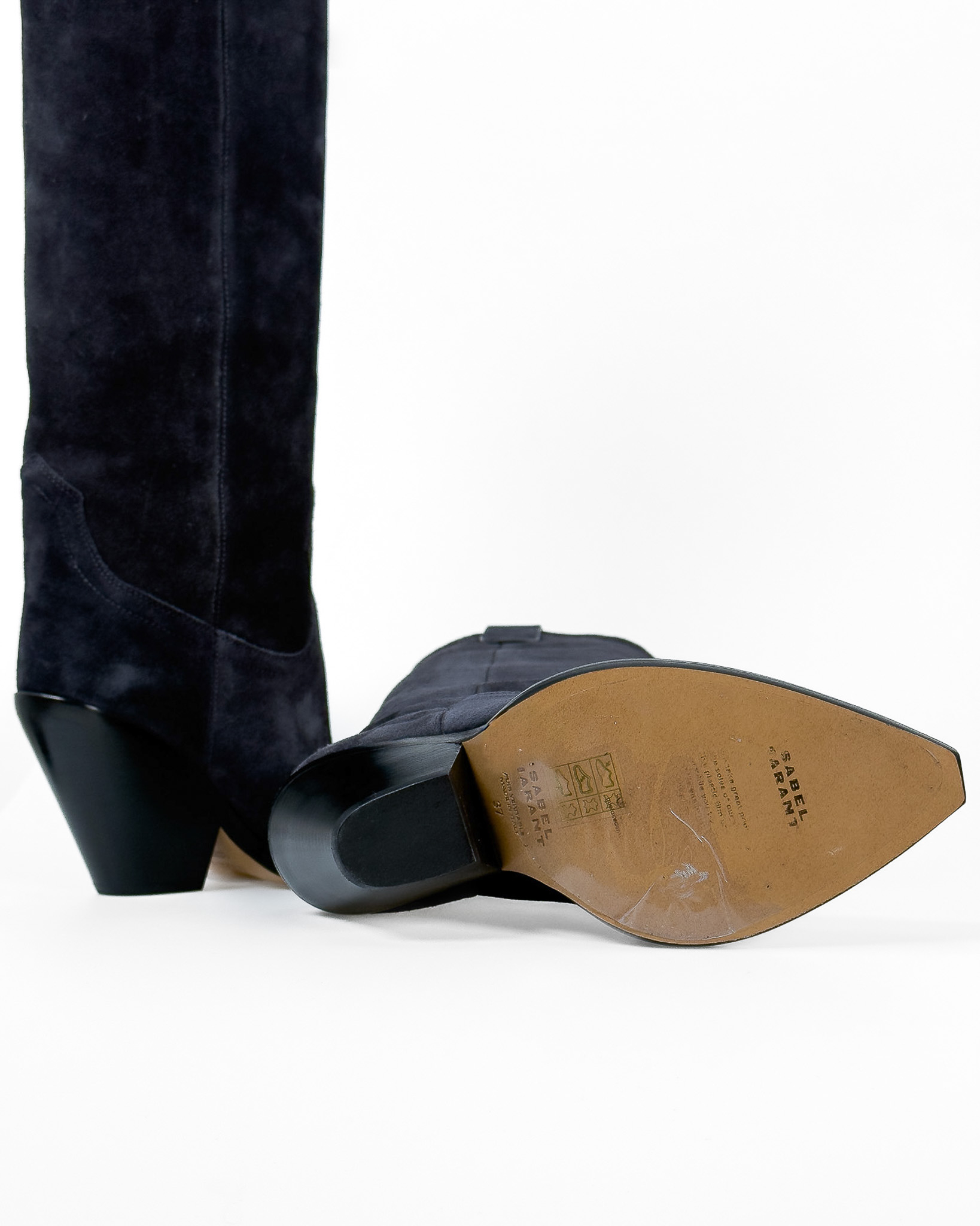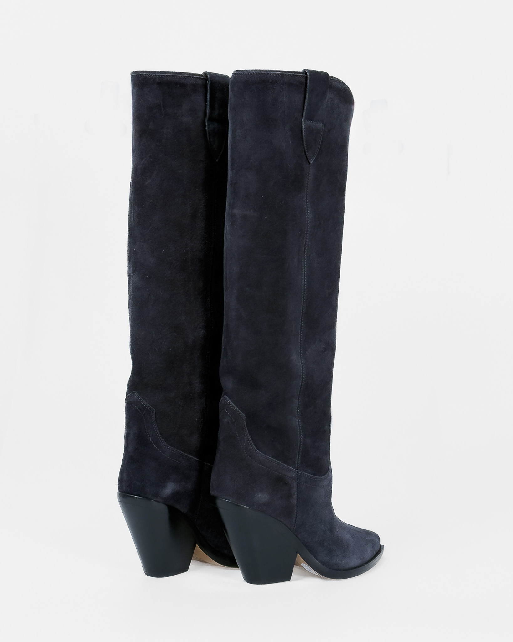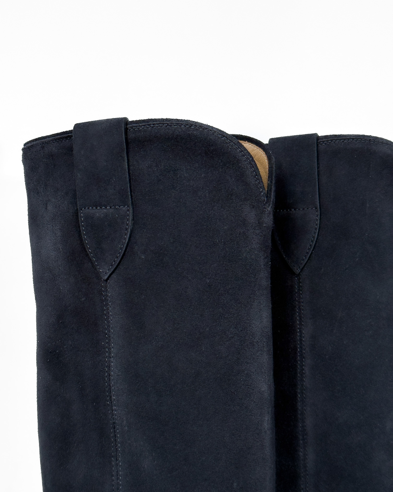 "Model: Suede Twist Sun. Granatowe zamszowe kowbojki, długa cholewka, ozdobne przeszycie z przodu, wsuwane, pętelki w bocznej części, czarny obcas, cieliste skórzane wnętrze. Stan nowe, w zestawie z pudełkiem. Rozmiar 37."