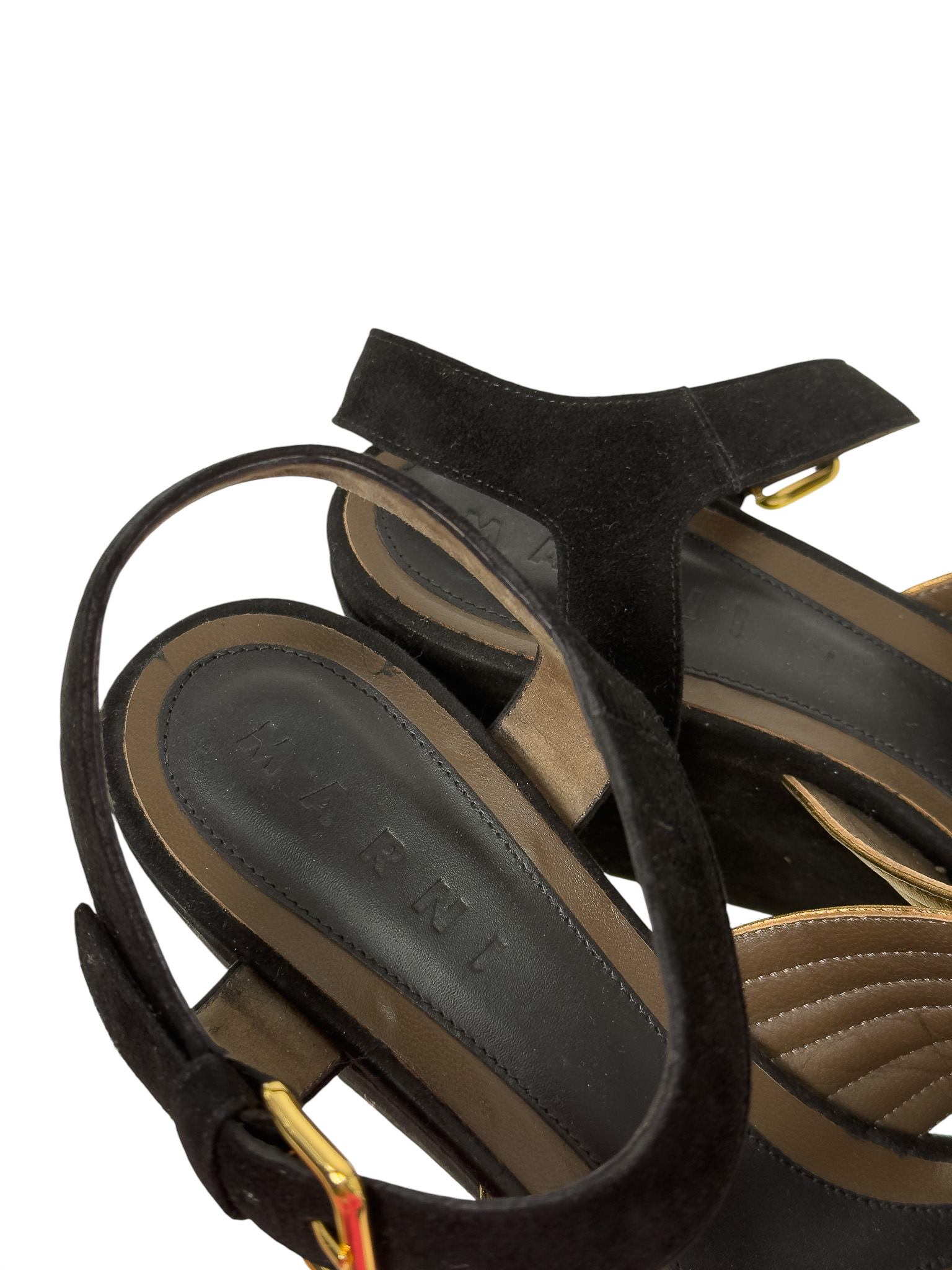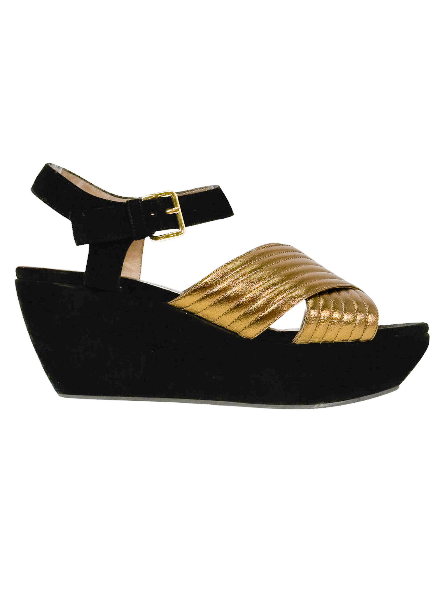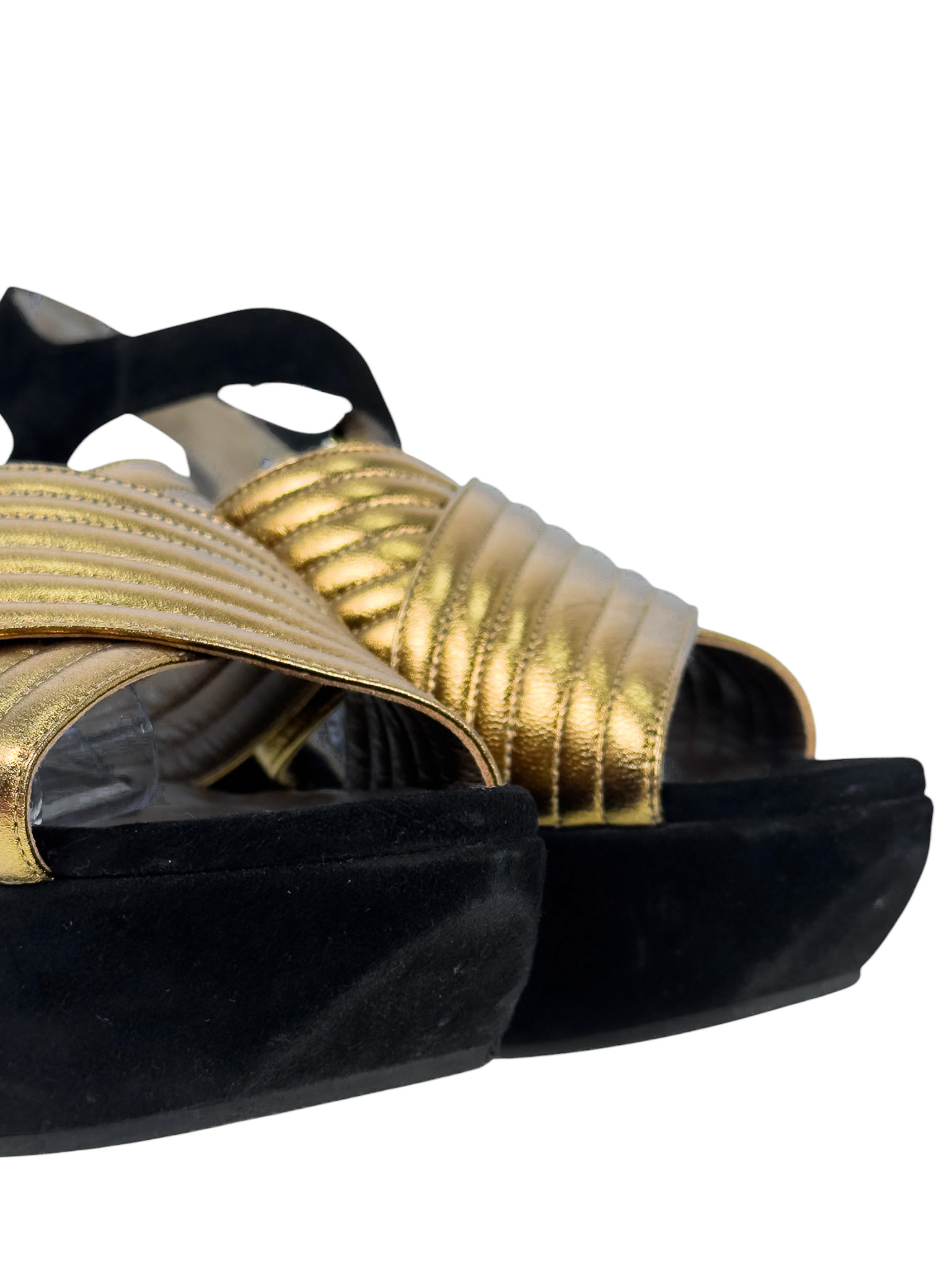 "Czarne zamszowe sandały na platformie, migdałowe noski, odkryte palce oraz pięta, złote paski ozdobione przeszyciami na przodzie, zapinane w okolicy kostki. Stan dobry, posiadają widoczne ślady użytkowania, przetarcia na podeszwie, zarysowania na skórze. Rozmiar 40."