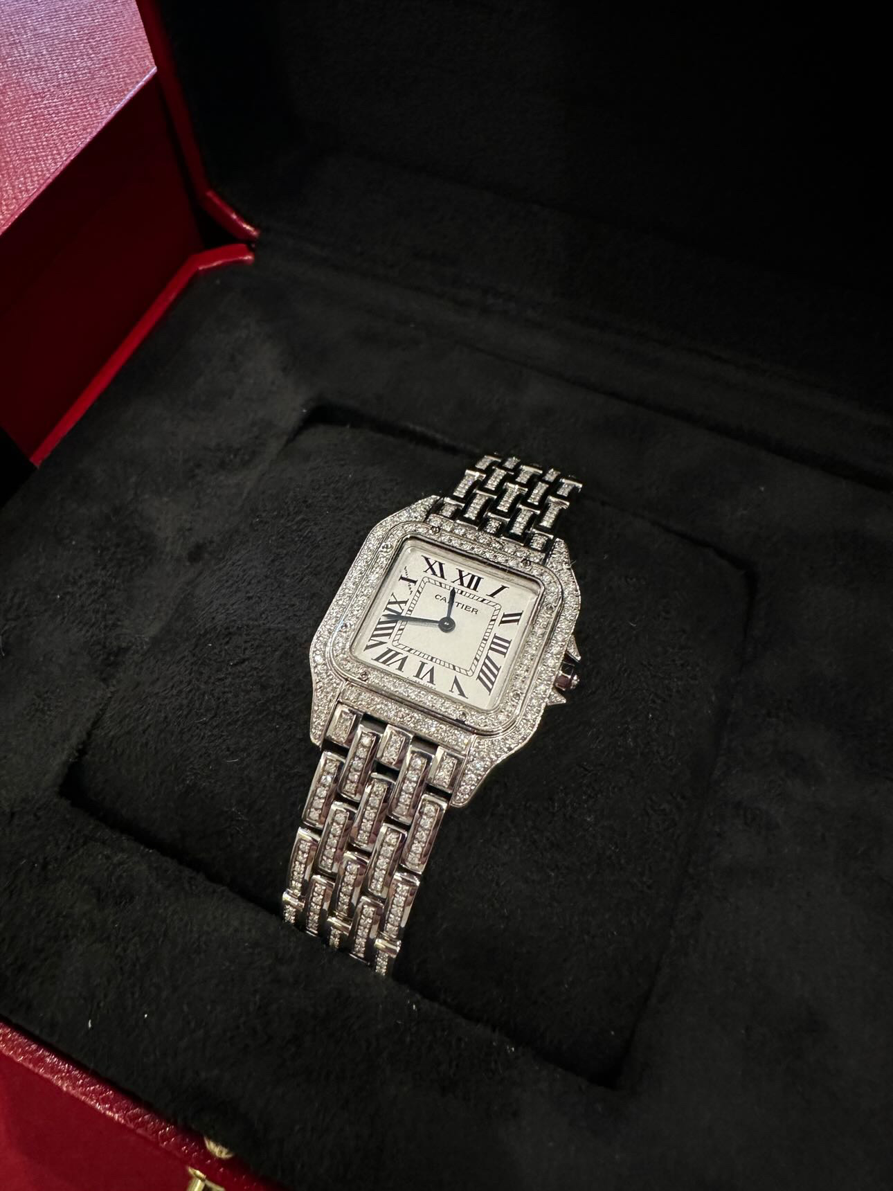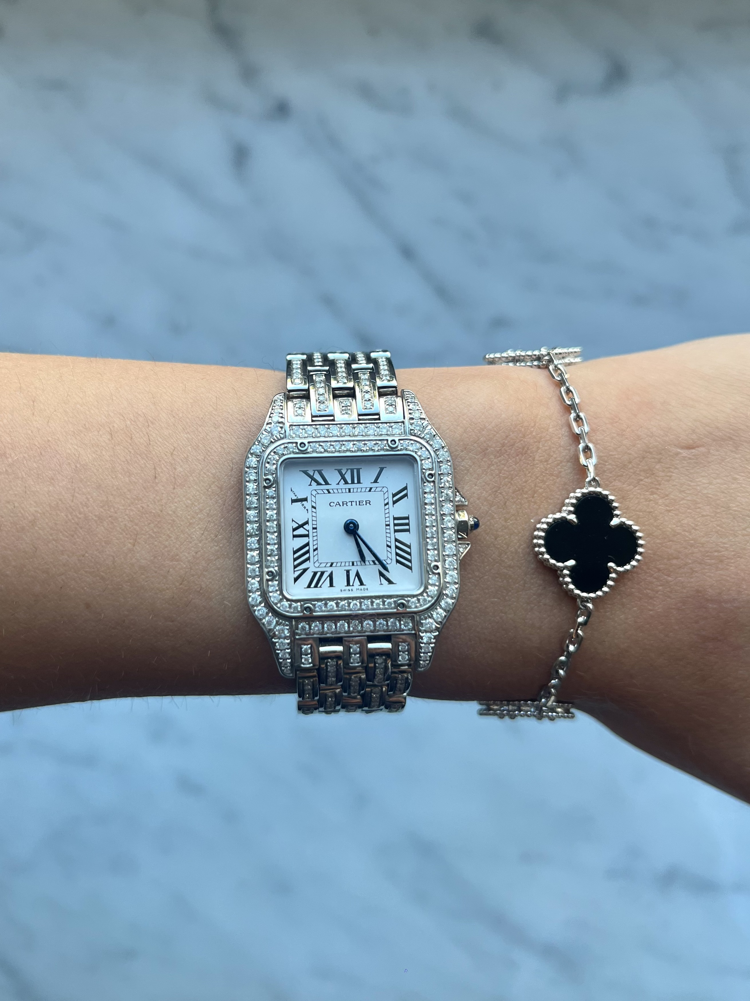 "Zegarek Cartier Panthere size Medium z początku 2025 roku. Zegarek nienoszony w stanie idealnym. Numer referencyjny zegarka to WSPN0007. W zestawie jest pudełko, certyfikat oryginalności zegarka wraz z certyfikatem na oryginalność diamentów. Diamenty zostały wysadzone u złotnika. Czystość diamentów: VS/SI. Cena: 37000"