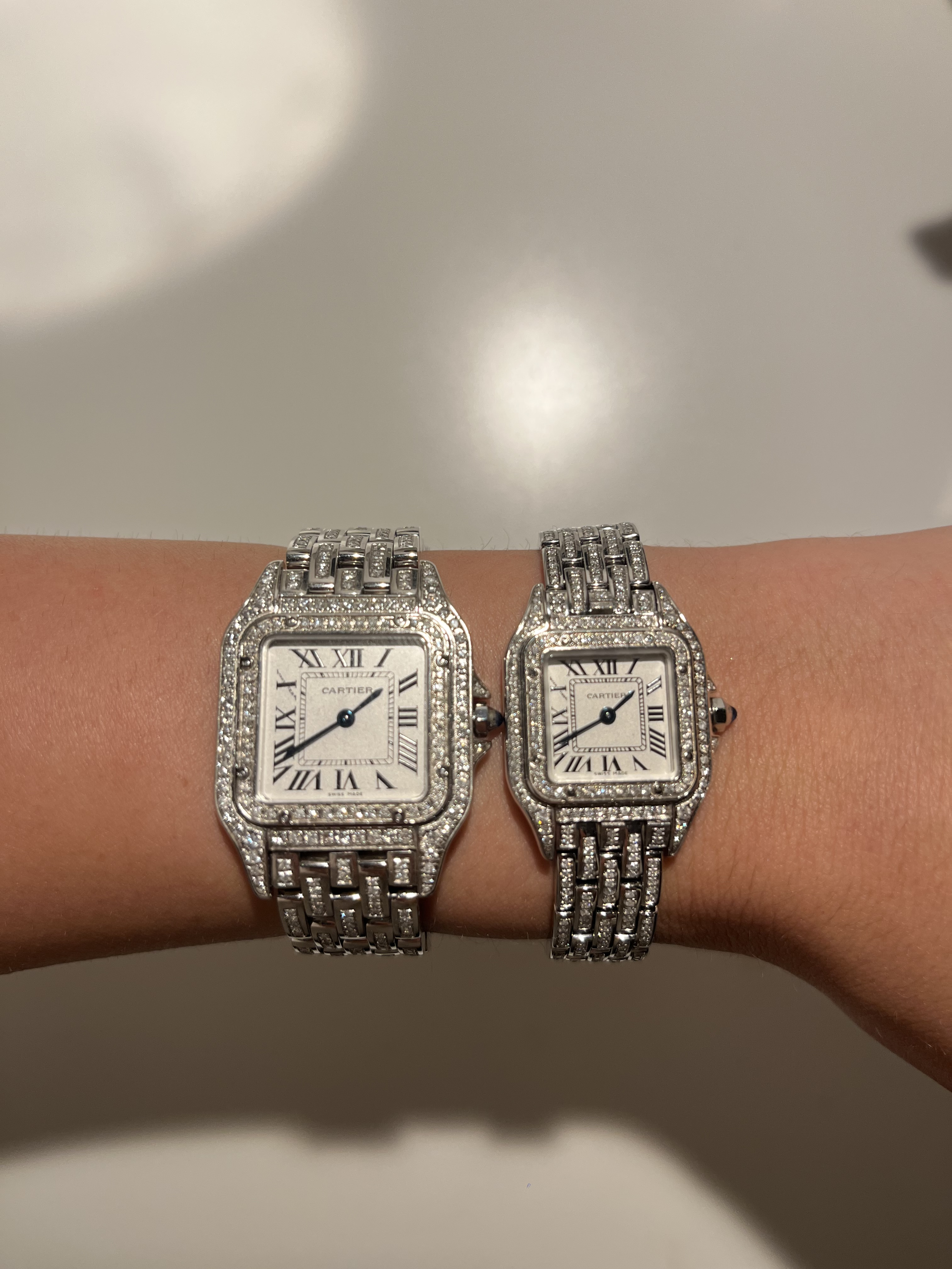 "Zegarek Cartier Panthere size Small z połowy 2025 roku. Zegarek w stanie idealnym. Numer referencyjny zegarka to WSPN0006. W zestawie jest pudełko, certyfikat oryginalności zegarka wraz z certyfikatem na oryginalność diamentów. Diamenty zostały wysadzone u złotnika. Czystość diamentów: VS/SI. Cena: 34000"
