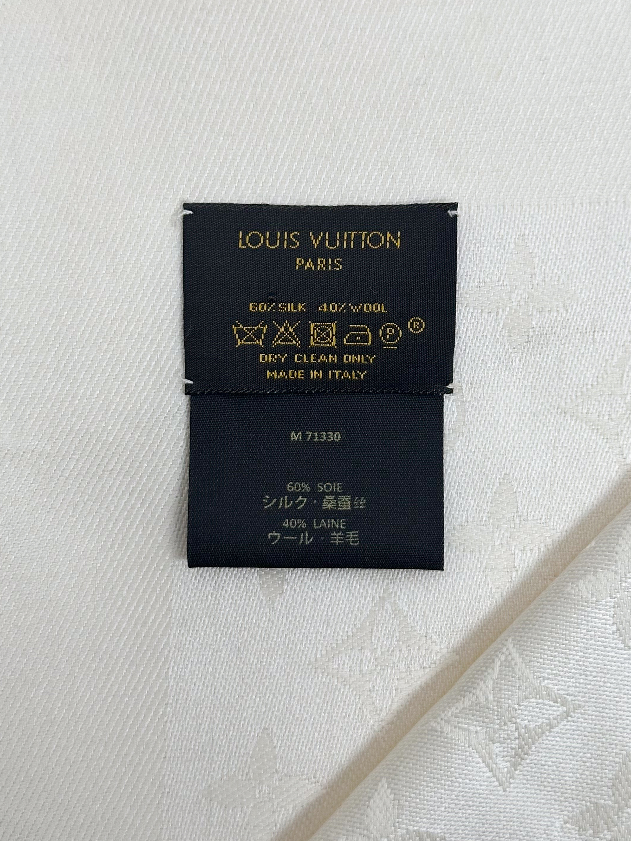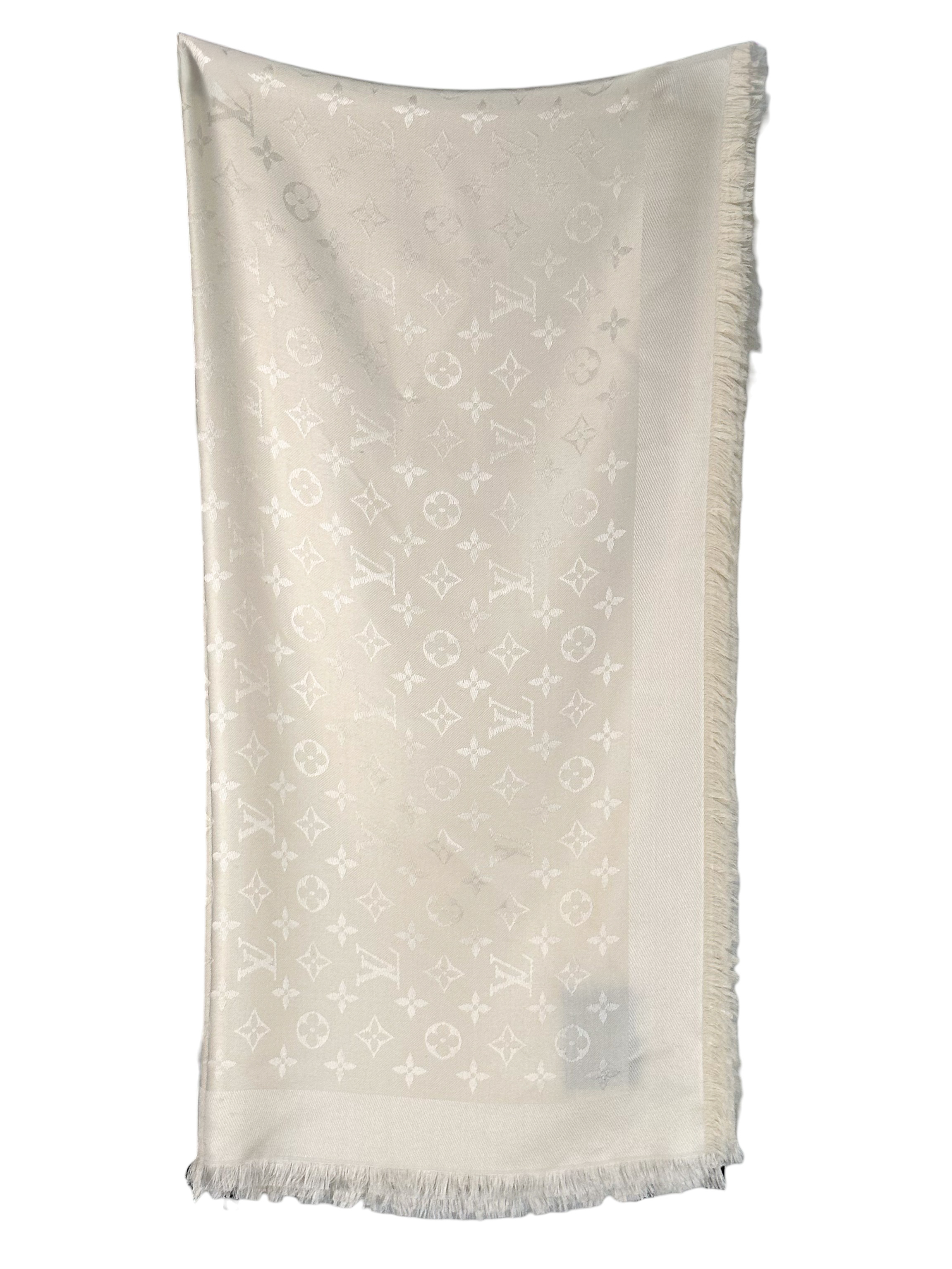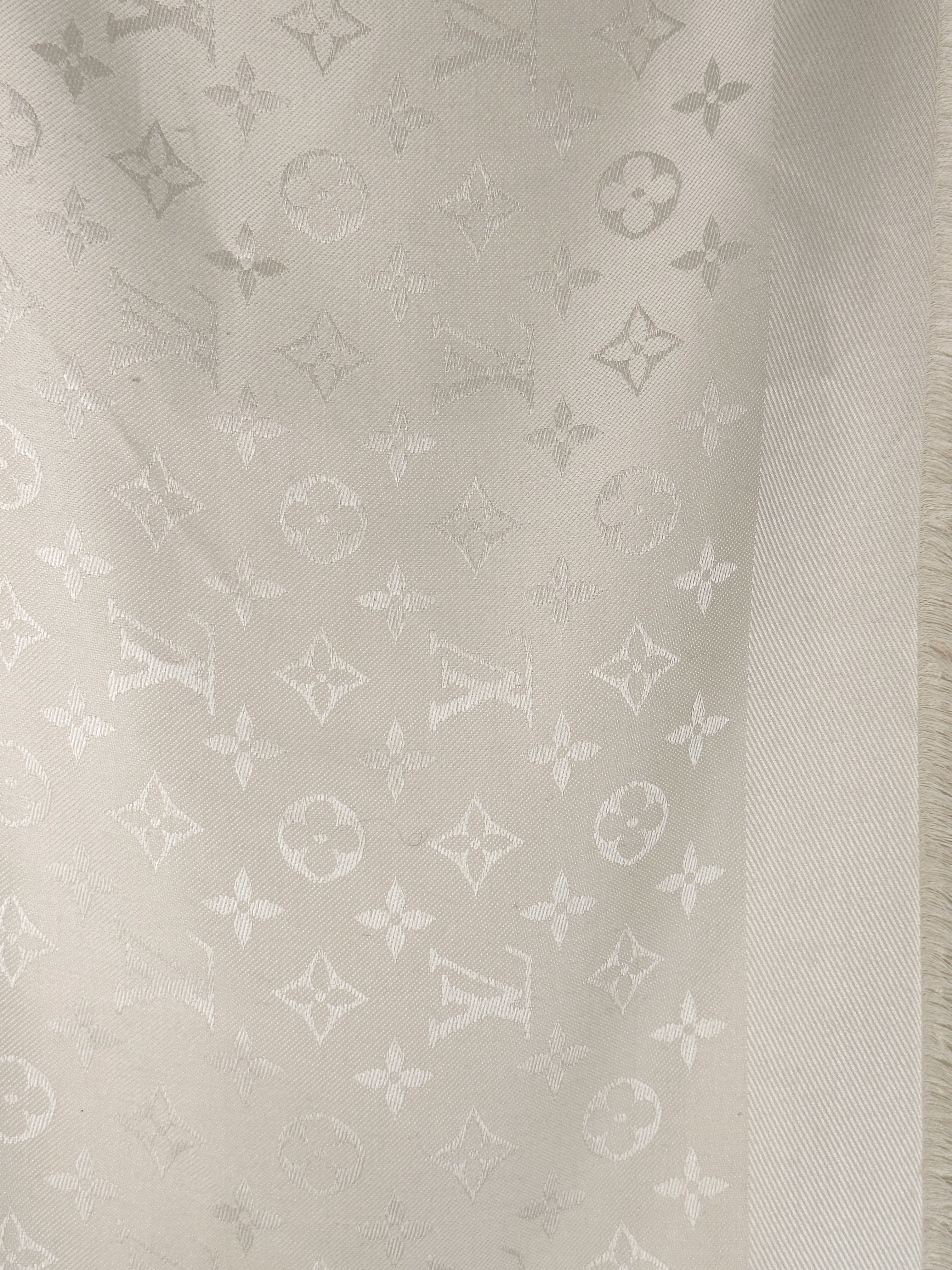 "Jedwabno-wełniana chusta w kolorze ecru w logo marki, zakończona krótkimi frędzlami, logo marki przy jednym rogu, na jednym z rogów delikatna plamka. Wymiary: 140cm x 140cm."