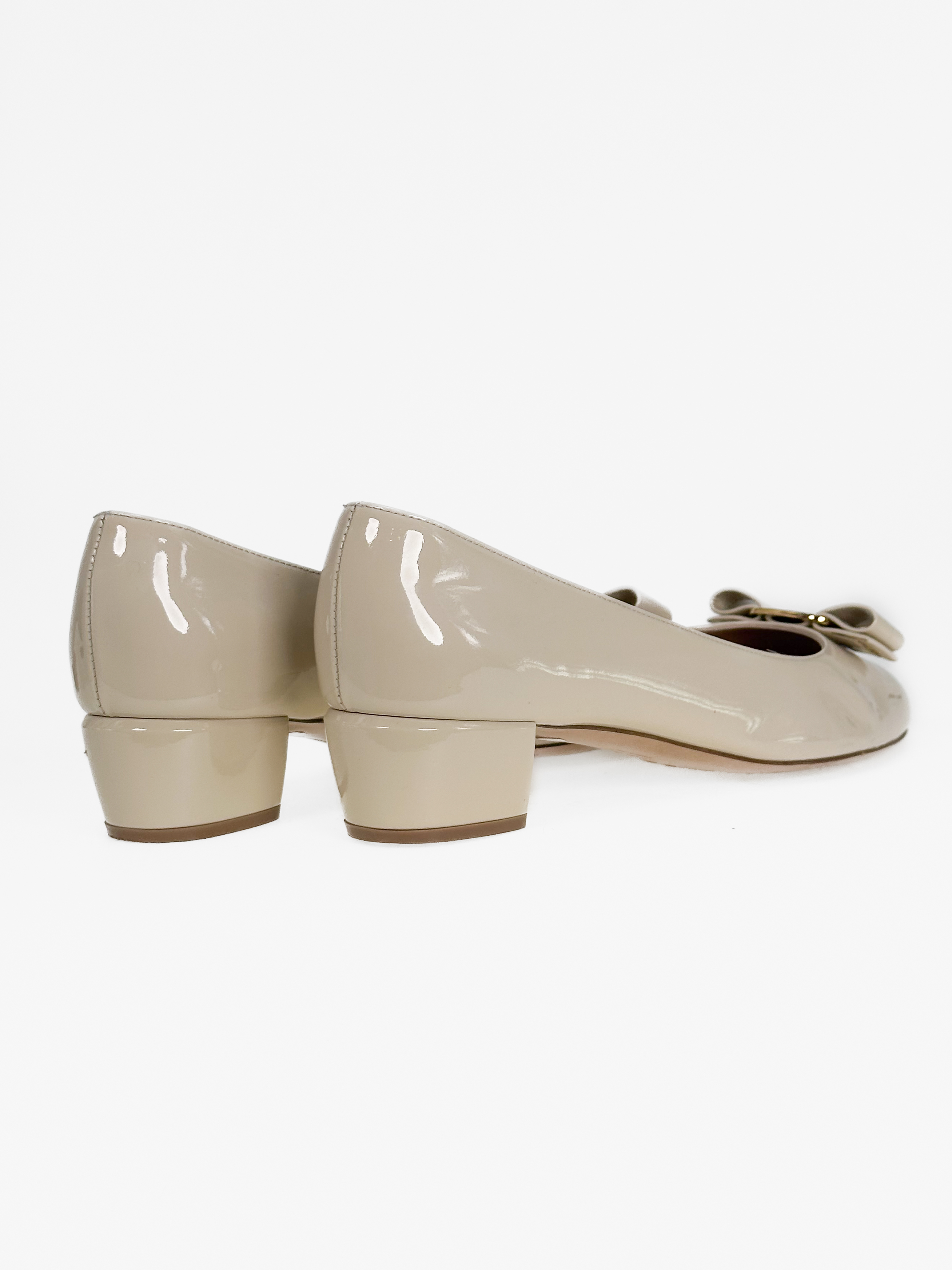 "Beżowe lakierowane baleriny na obcasie, z przodu złota kokardka z logo, rozmiar 39,5. Stan bardzo dobry, posiadają przetarcia na podeszwie."
