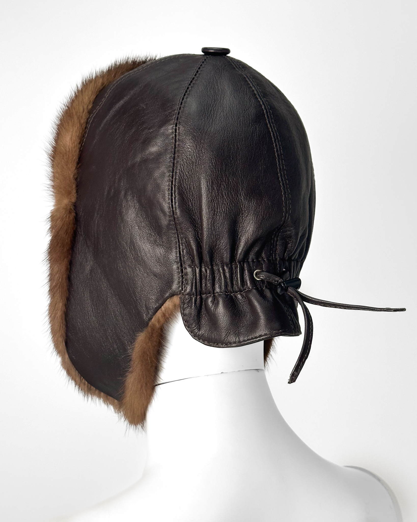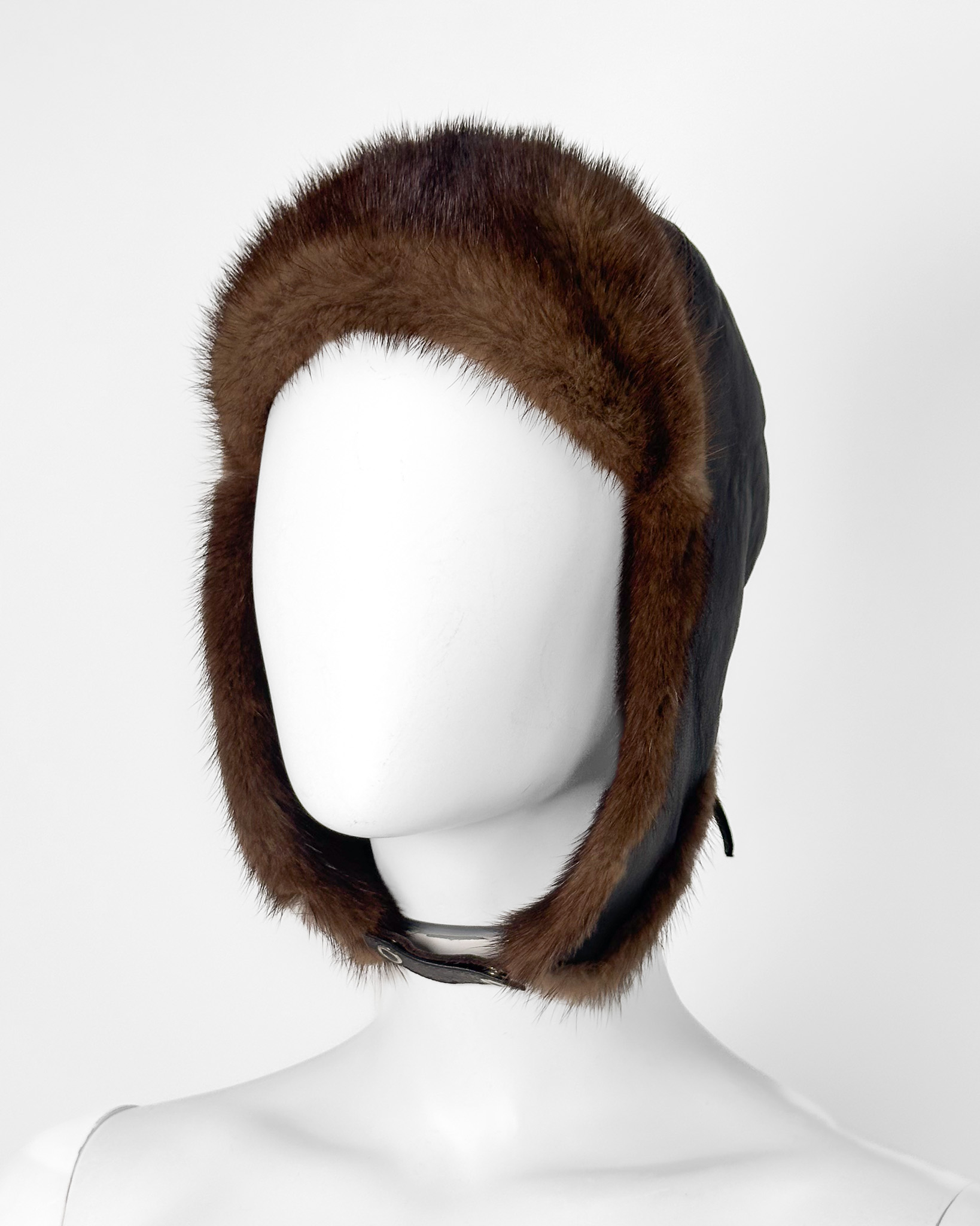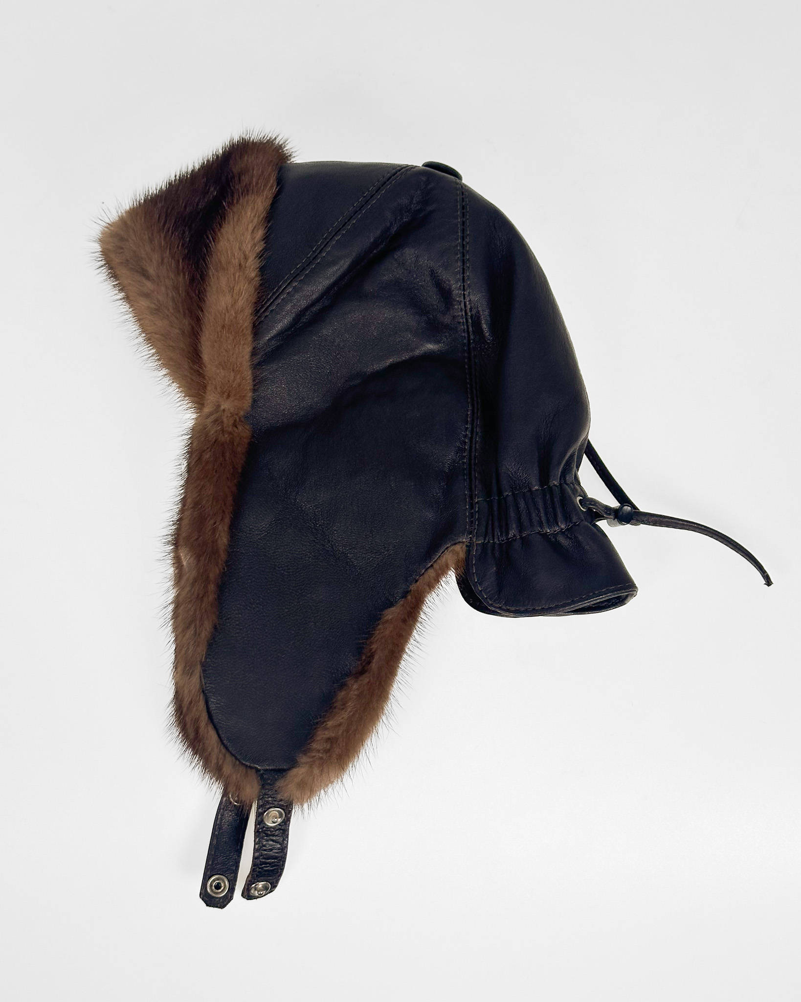 "Brązowa czapka pilotka, skórzana, obszyta brązowym futrem z przodu i przy nausznikach, zapinana na zatrzaski, z tyłu ściągacz, szara podszewka."