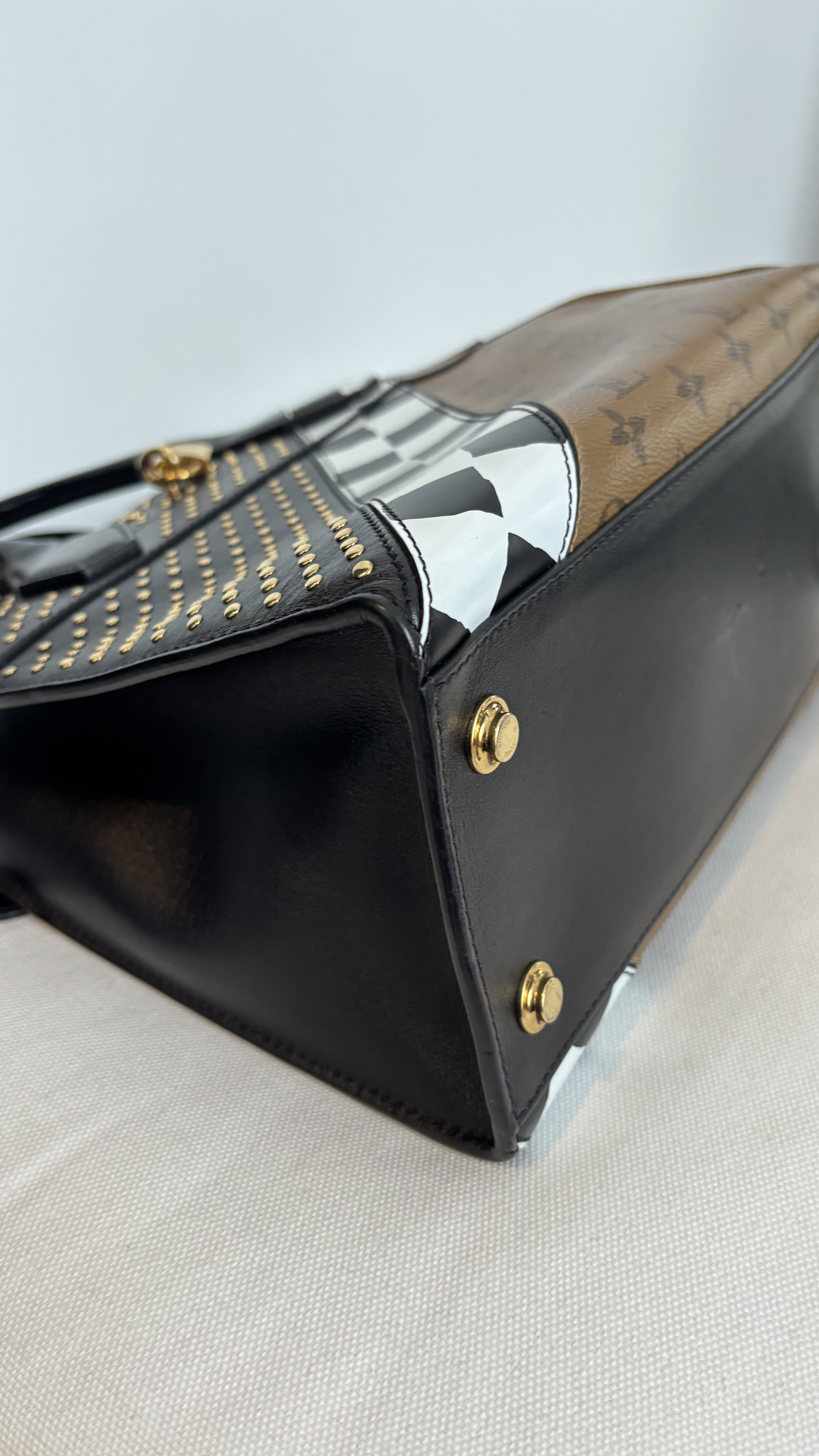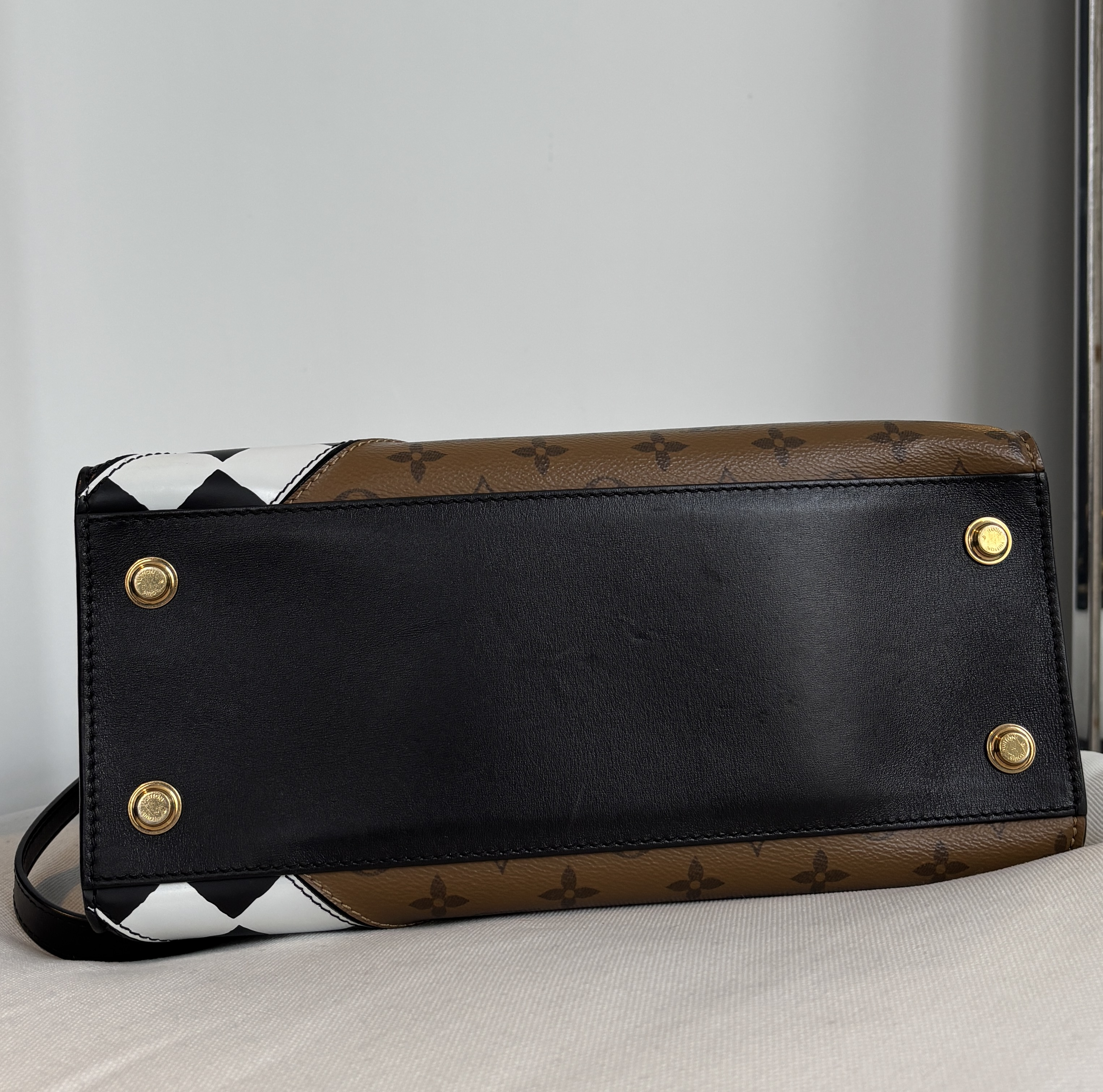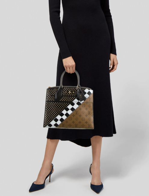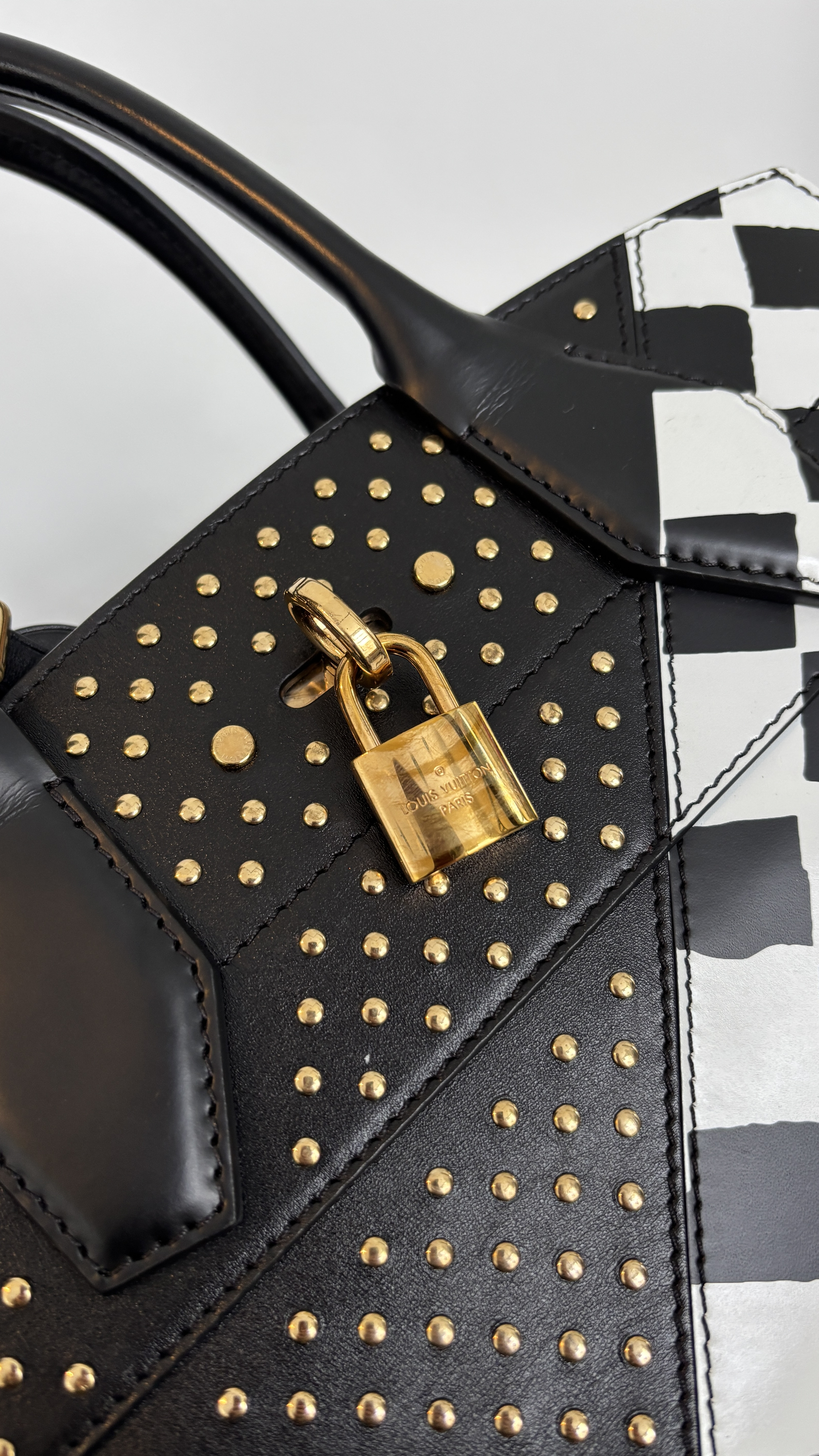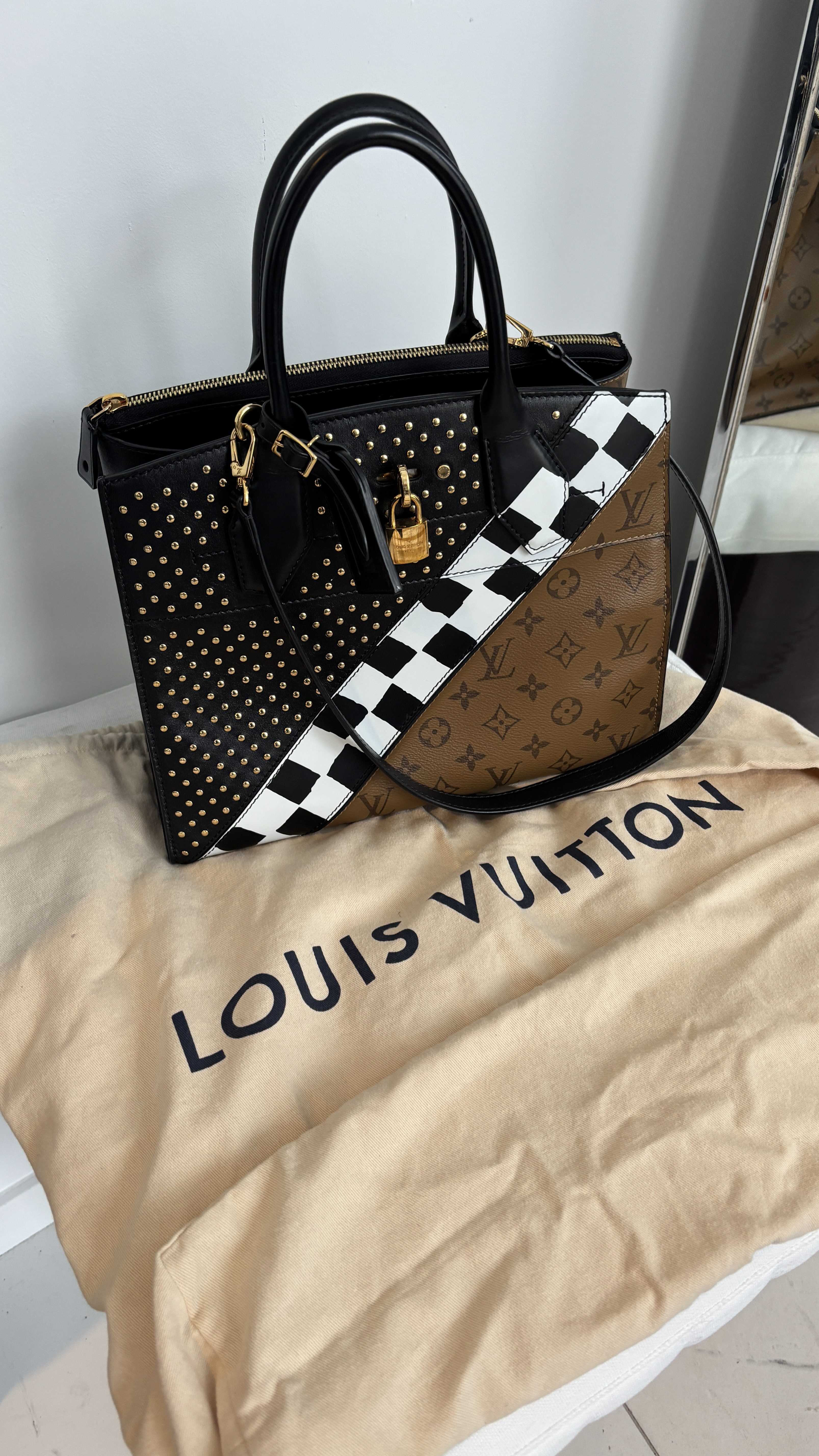 "Model Monogram City Steamer MM, torebka typu tote, do ręki, połaczenie brązowego monogramu, czarno-białej szachownicy oraz czarnej skóry nabijanej złotymi ćwiekami, złote okucia. Jedna duża skórzana komora (stan bardzo dobry) oraz druga zapinana na suwak. W zestawie czarny dopinany pasek na ramię (nie crossbody) i worek przeciwkurzowy. Brak przetarć na rogach, skórzana podstawa z drobnymi rysami. Wymiary: wysokość 25,5 c, szerokość 30,5 cm, głębokość 13,3 cm"